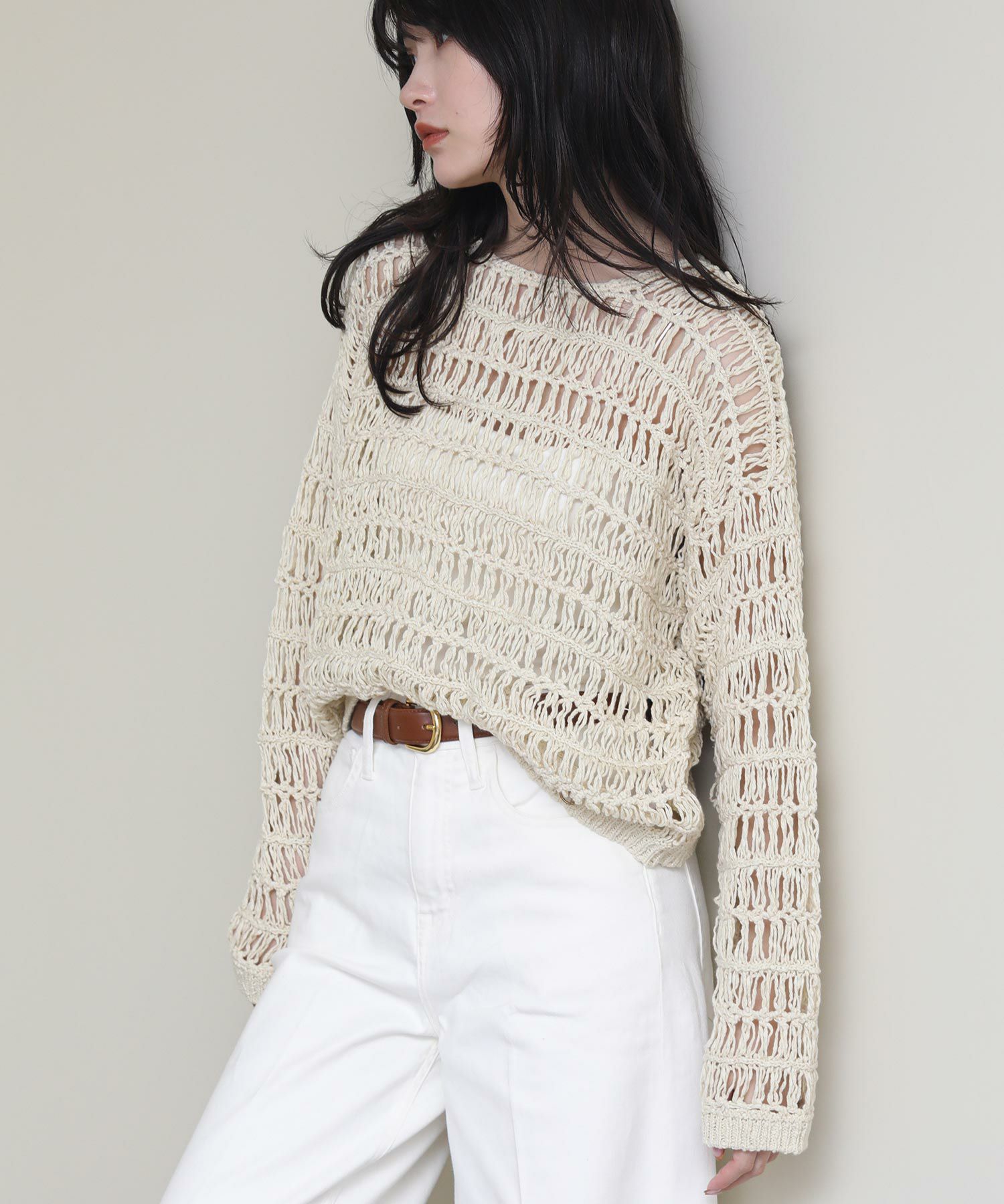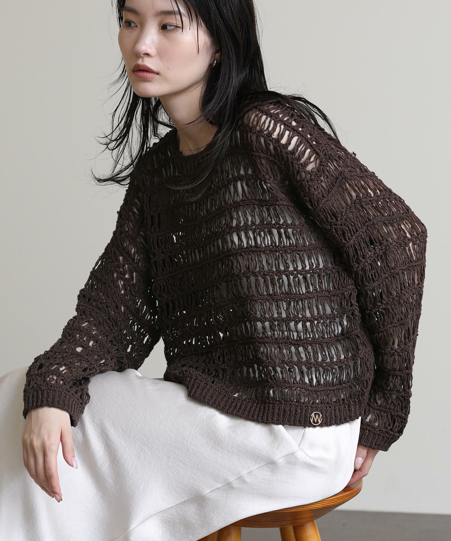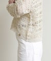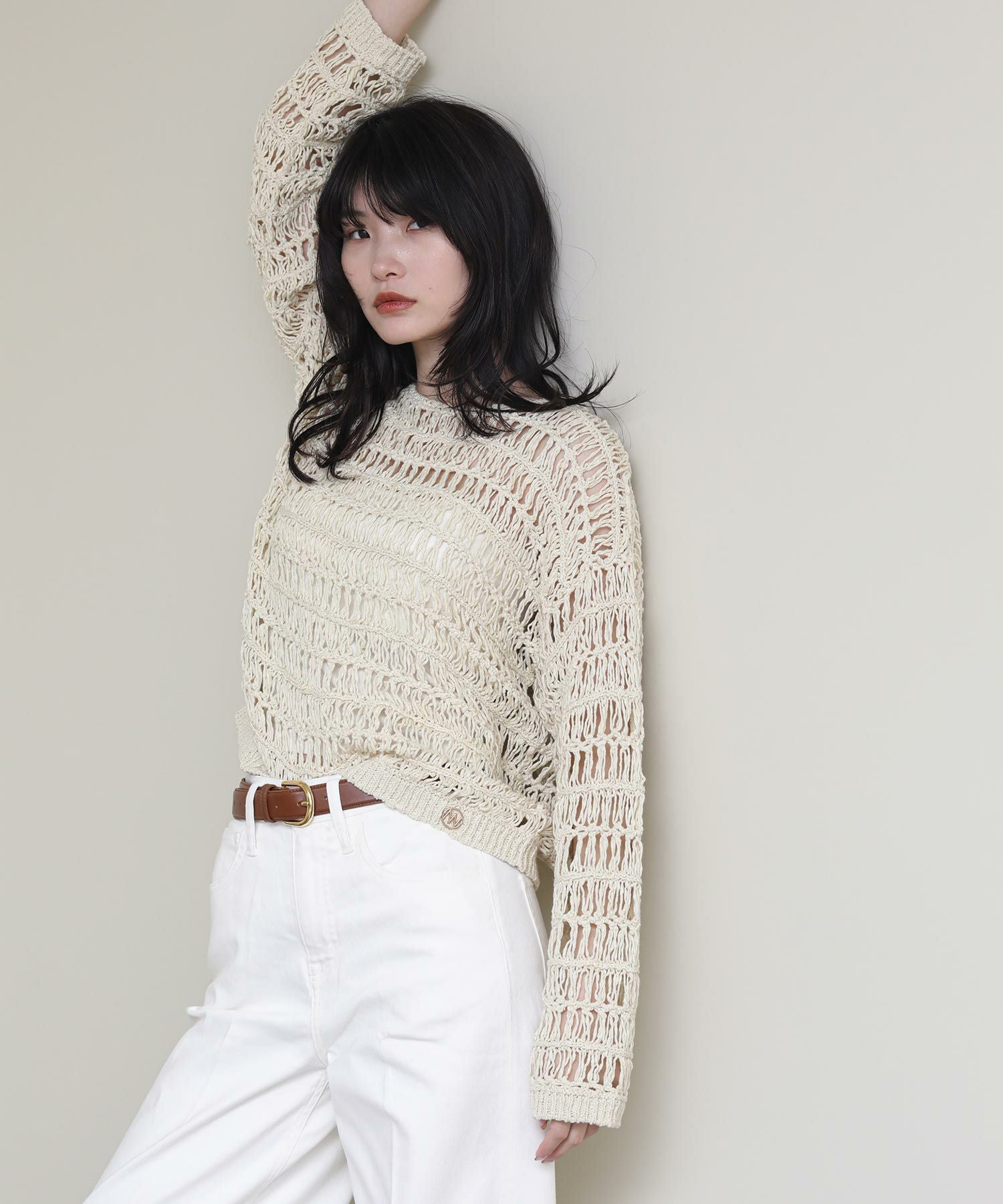 機械編みのパーツを、かぎ針編みで繋ぎ合わせる手の込んだ透かし柄で、ボヘミアンムード漂うニットプルオーバーです。 クラフト感を引き立たせるコットンスラブヤーンを使用し、表情のある編地が特徴です。 こなれ感のある短すぎないショート丈で、インにリブタンクトップを合わせて裾から覗かせるスタイルもオススメです。 裾にはポイントでYENNロゴチャーム付きです。