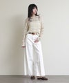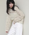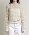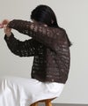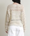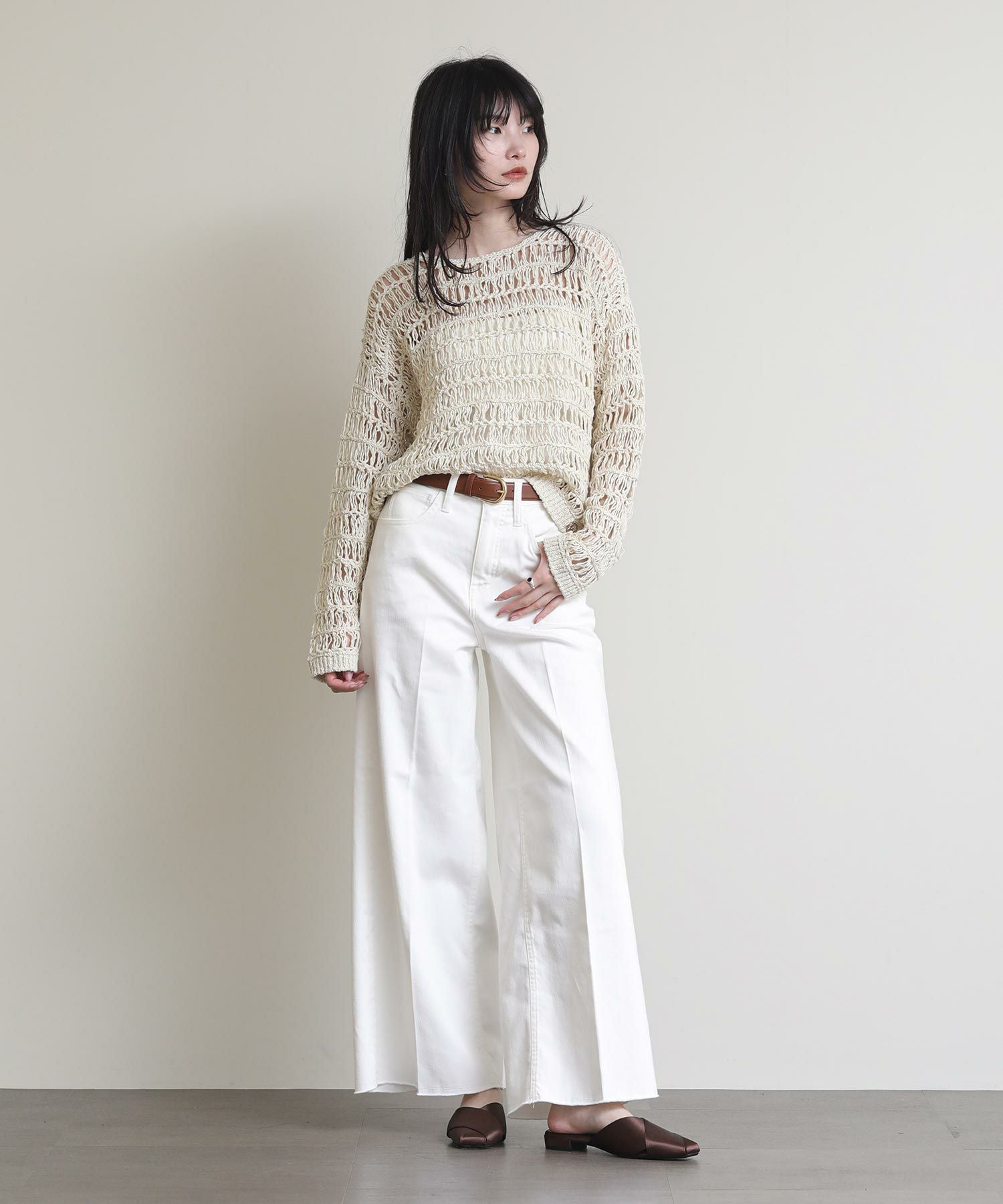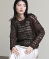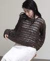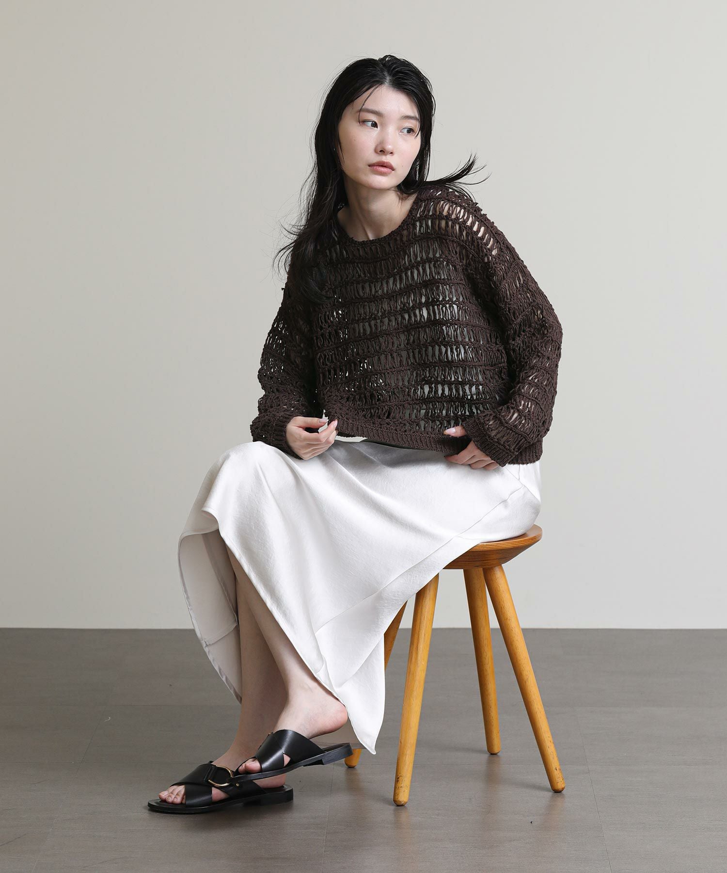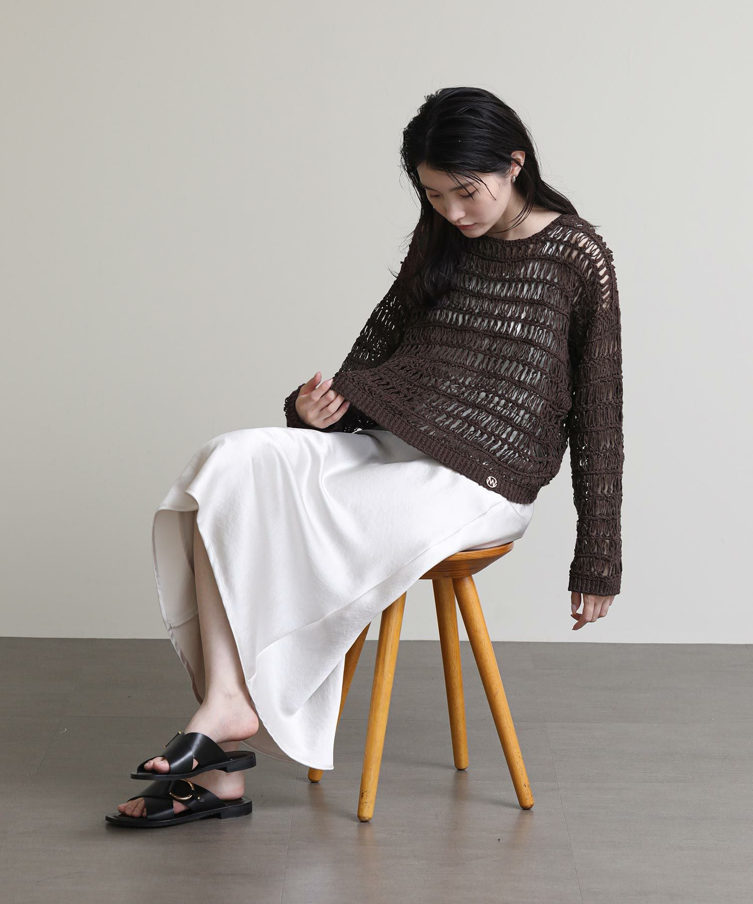 機械編みのパーツを、かぎ針編みで繋ぎ合わせる手の込んだ透かし柄で、ボヘミアンムード漂うニットプルオーバーです。 クラフト感を引き立たせるコットンスラブヤーンを使用し、表情のある編地が特徴です。 こなれ感のある短すぎないショート丈で、インにリブタンクトップを合わせて裾から覗かせるスタイルもオススメです。 裾にはポイントでYENNロゴチャーム付きです。