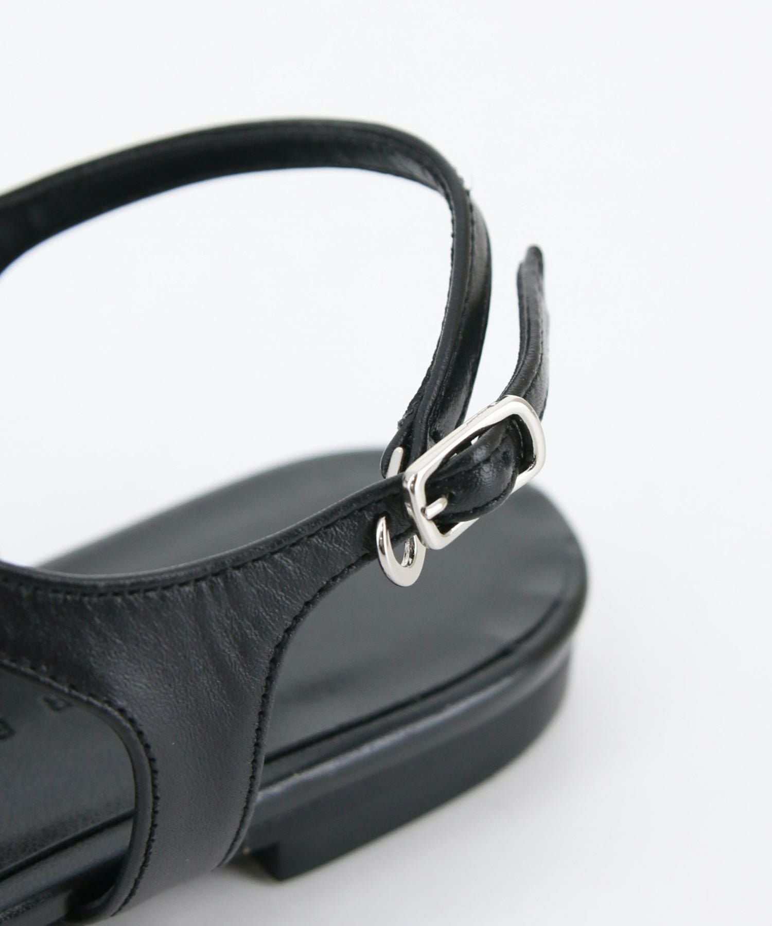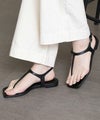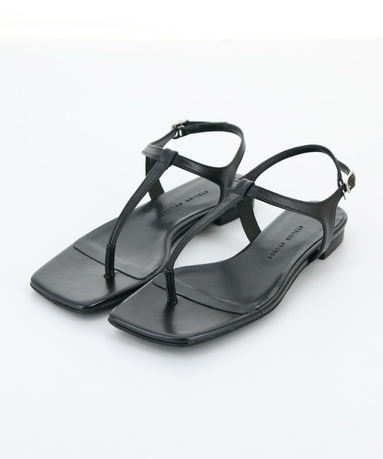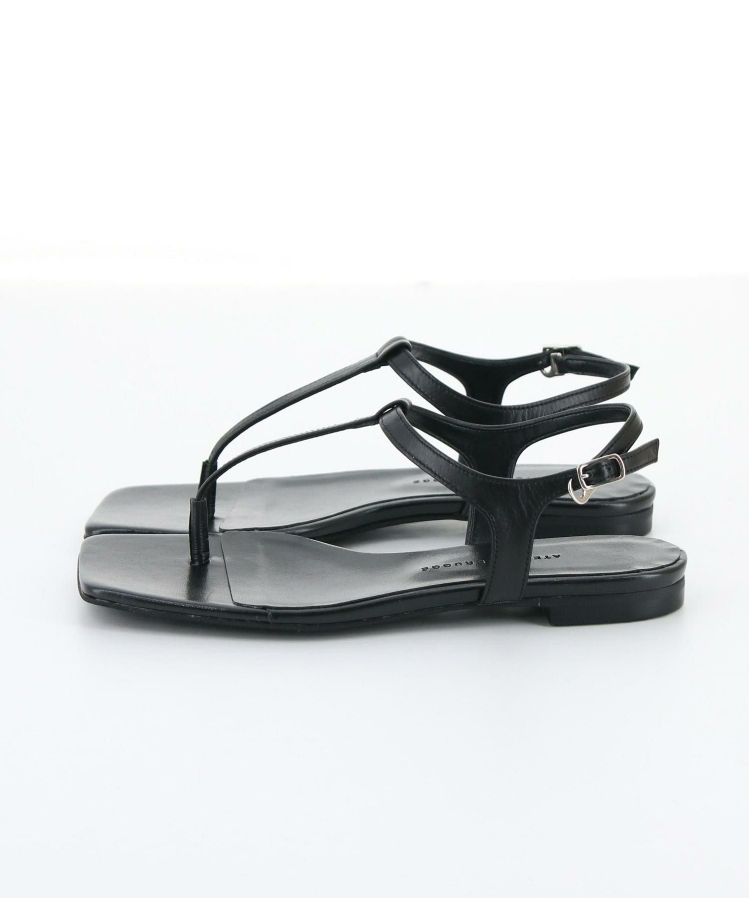レザーの華奢なトングが上品なスクエアトゥのフラットサンダル。