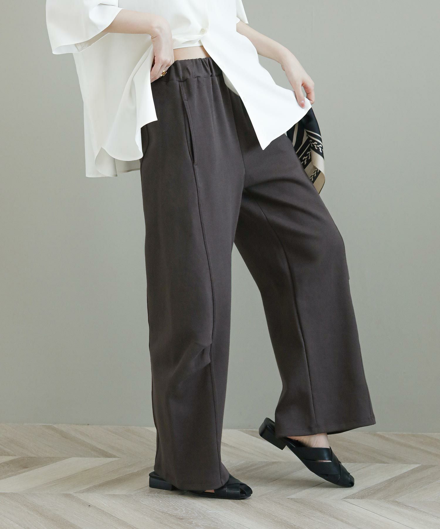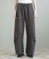 綿ポリエステルのほどよいカジュアル感のあるダブルジャージー素材は、裏毛ほどカジュアルすぎない、裏側もスムースな肌あたりでパジャマっぽくならない大人におすすめのスウェットパンツです。膝に入れたタックで作るカーブシルエットがモードな雰囲気をプラス。ざっくりニットや、少しきれいめなシャツと合わせてもこなれた印象を与えてくれます。秋を感じる落ち着いたカラーも魅力。