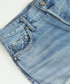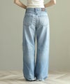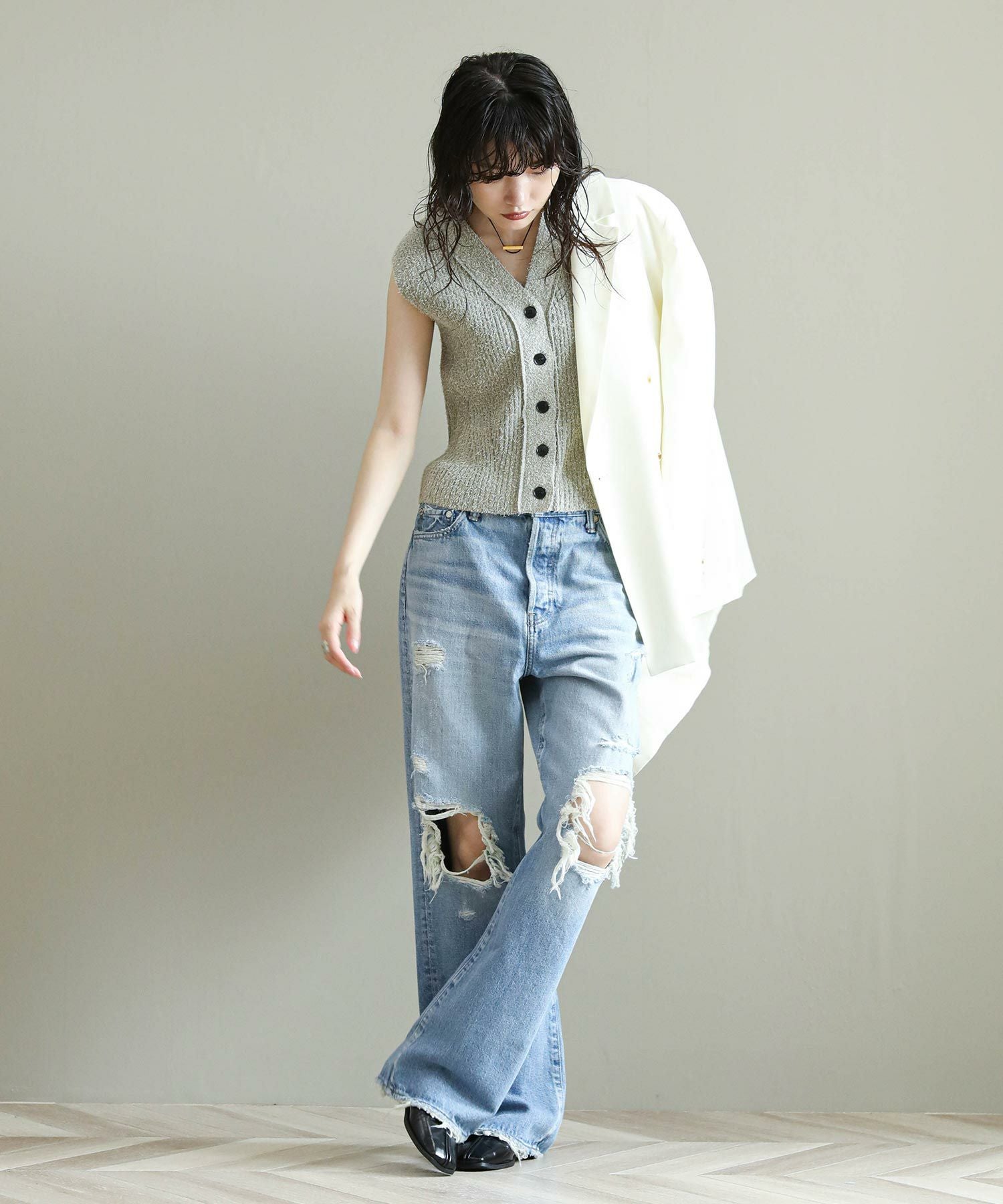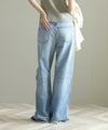 一般的なブーツカットと比べ膝の絞りが少なく、裾への広がりも緩やかな為、ストレートとワイドの中間のような着用感が特徴。ウエストは少し大きめの設計にしており、腰上で留まってヒップからワタリにゆとりをもたせることでリラックスな印象に。またウエスト位置で絞って履いてもキレイなラインが出るので着こなしに幅があるアイテムです。大胆なダメージ加工がトレンド感もあり、スタイルの巾が広がります。