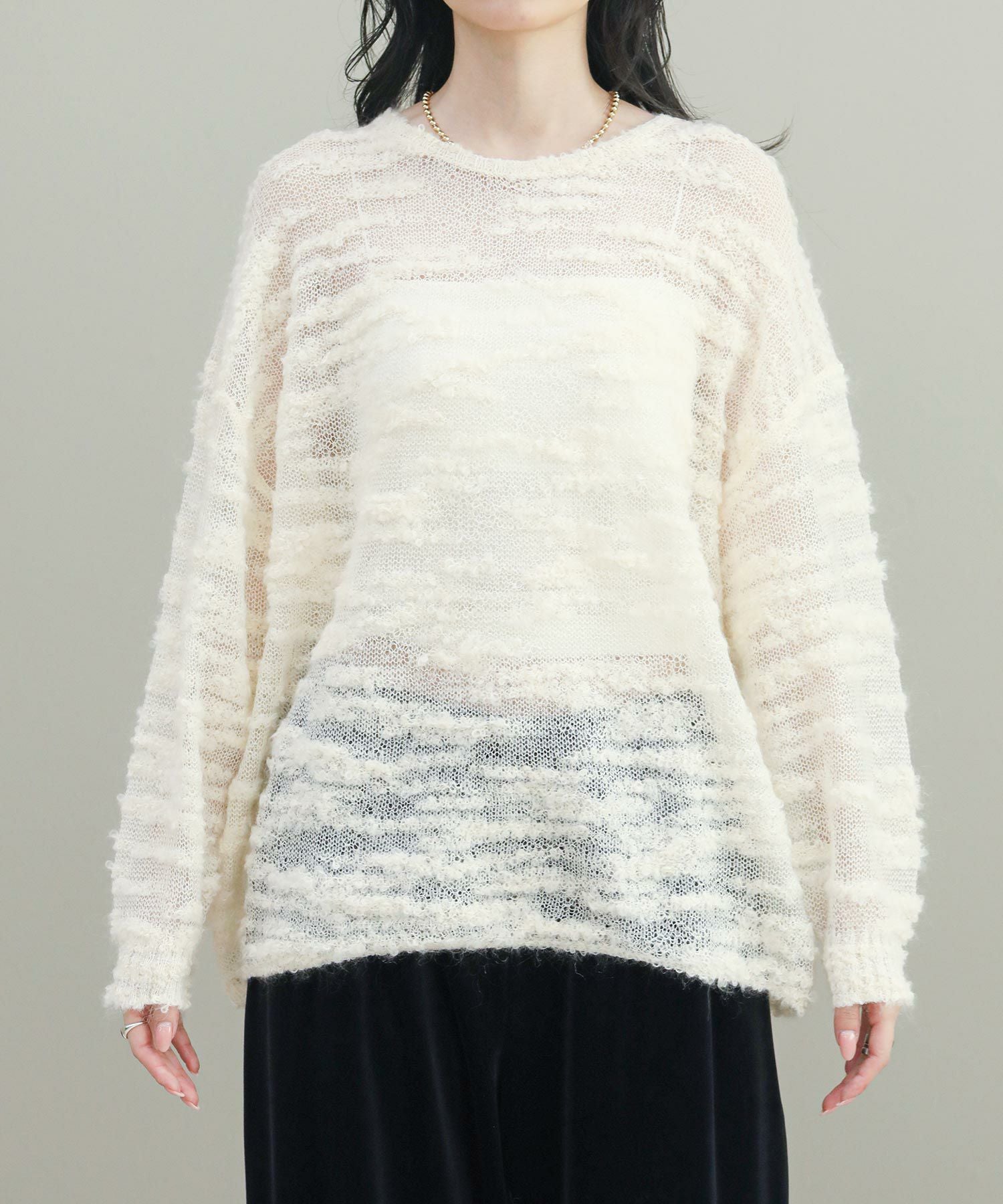 糸の繊細さやループ感を引き立てるためにざっくりとシアー感のある編地に仕上げています。ゆったりとしたサイジングに仕上げているので、シアー感を活かしたレイヤードスタイルを楽しんでいただけます。