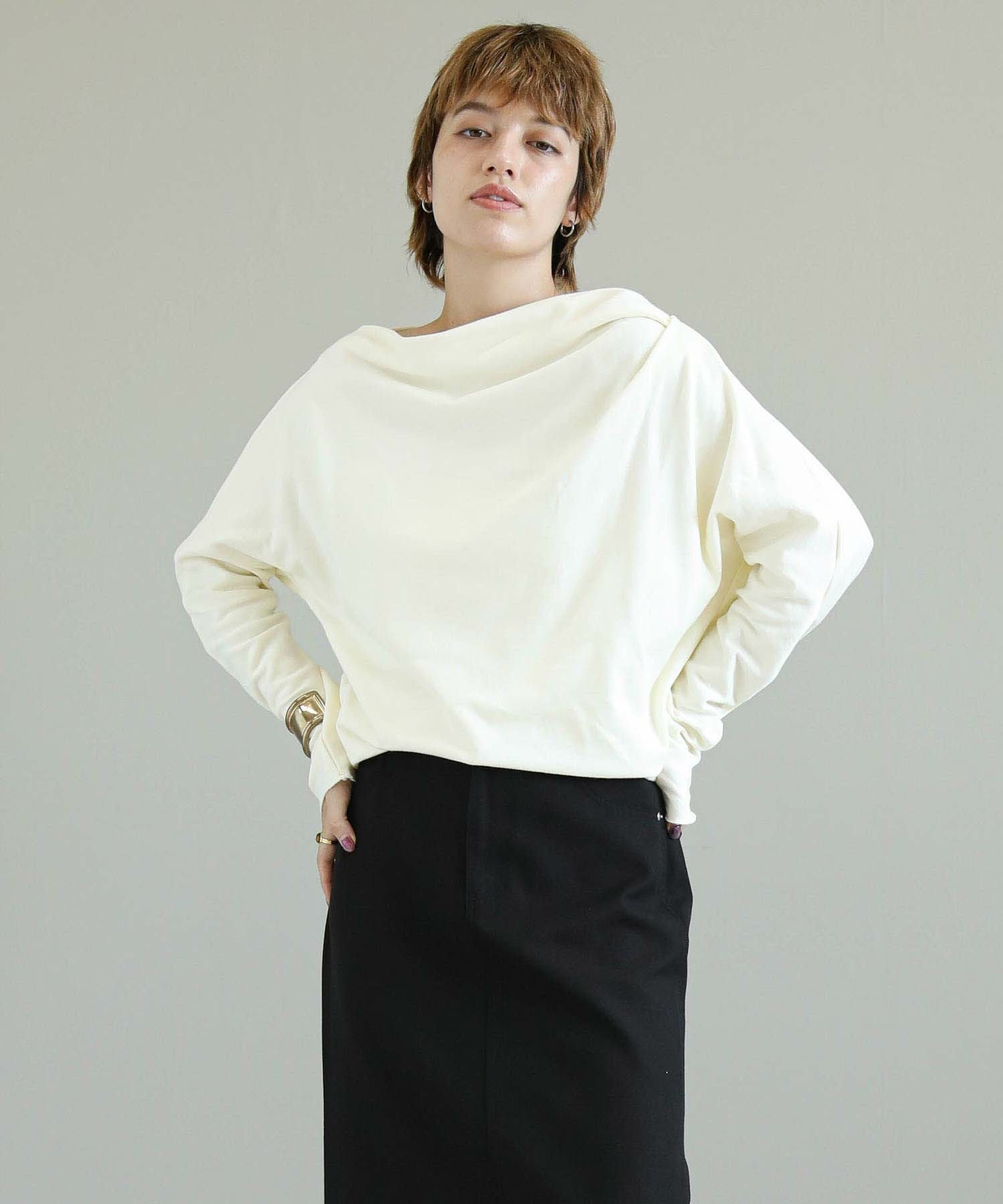 柔らかな素材感が心地よい、アシンメトリーデザインの長袖トップス。