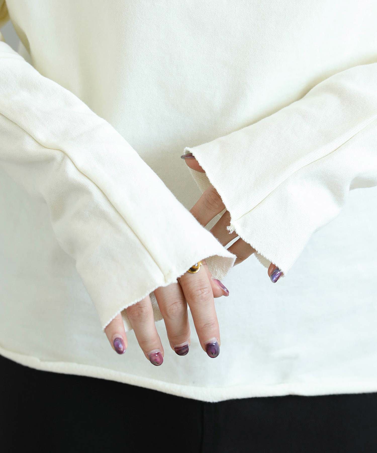 裾や袖をカットオフにしている事でロングスリーブながら軽やかな印象。