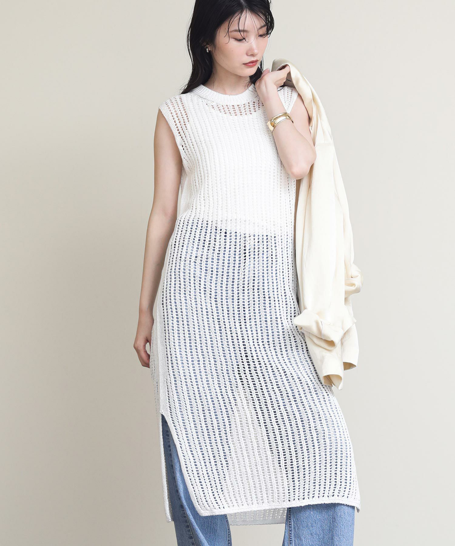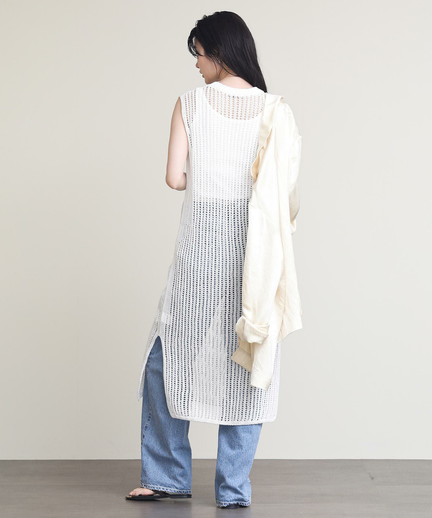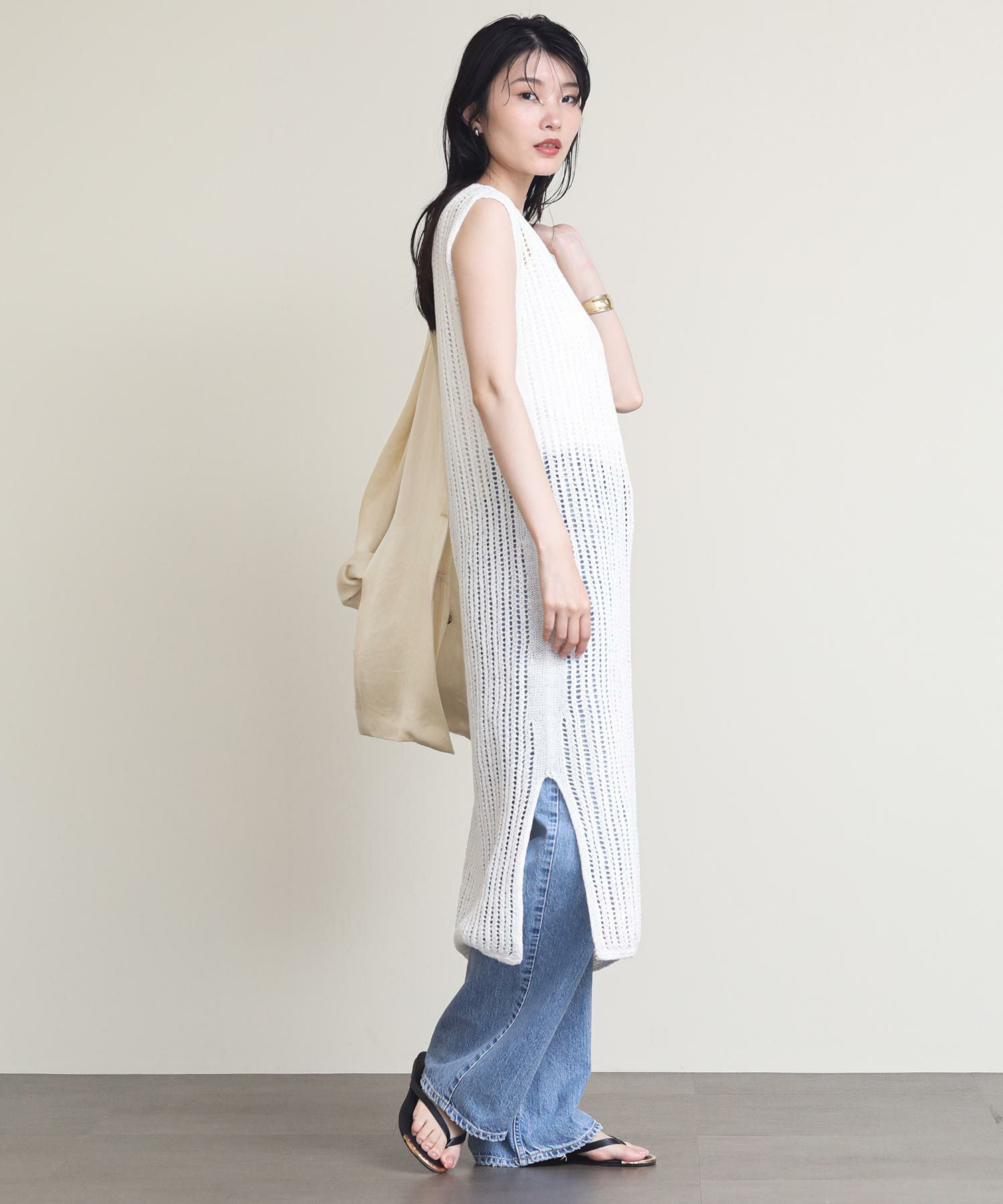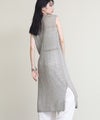リネンはノルマンディー地方で収穫される一等亜麻の上質な部分だけを使用しています。シャリ感のある素材で盛夏まで快適に着られます。タンクトップやデニムなどシンプルなスタイルにレイヤードすると、上質なニットの風合いを活かした着こなしに。両サイドにスリットが入っているので足さばきも◎