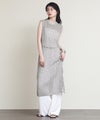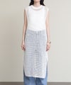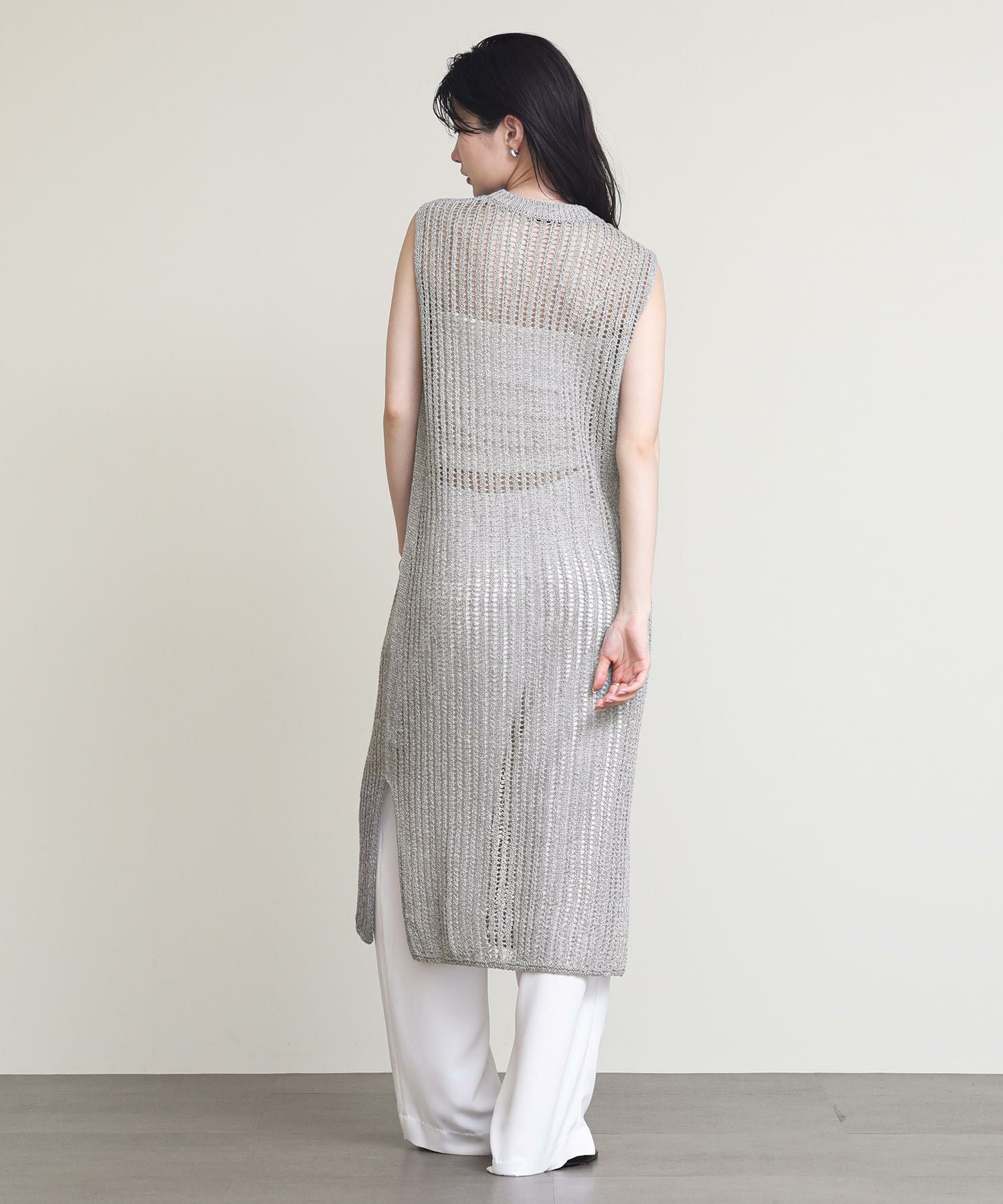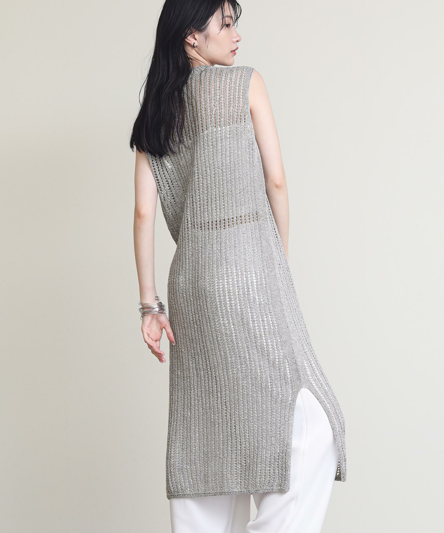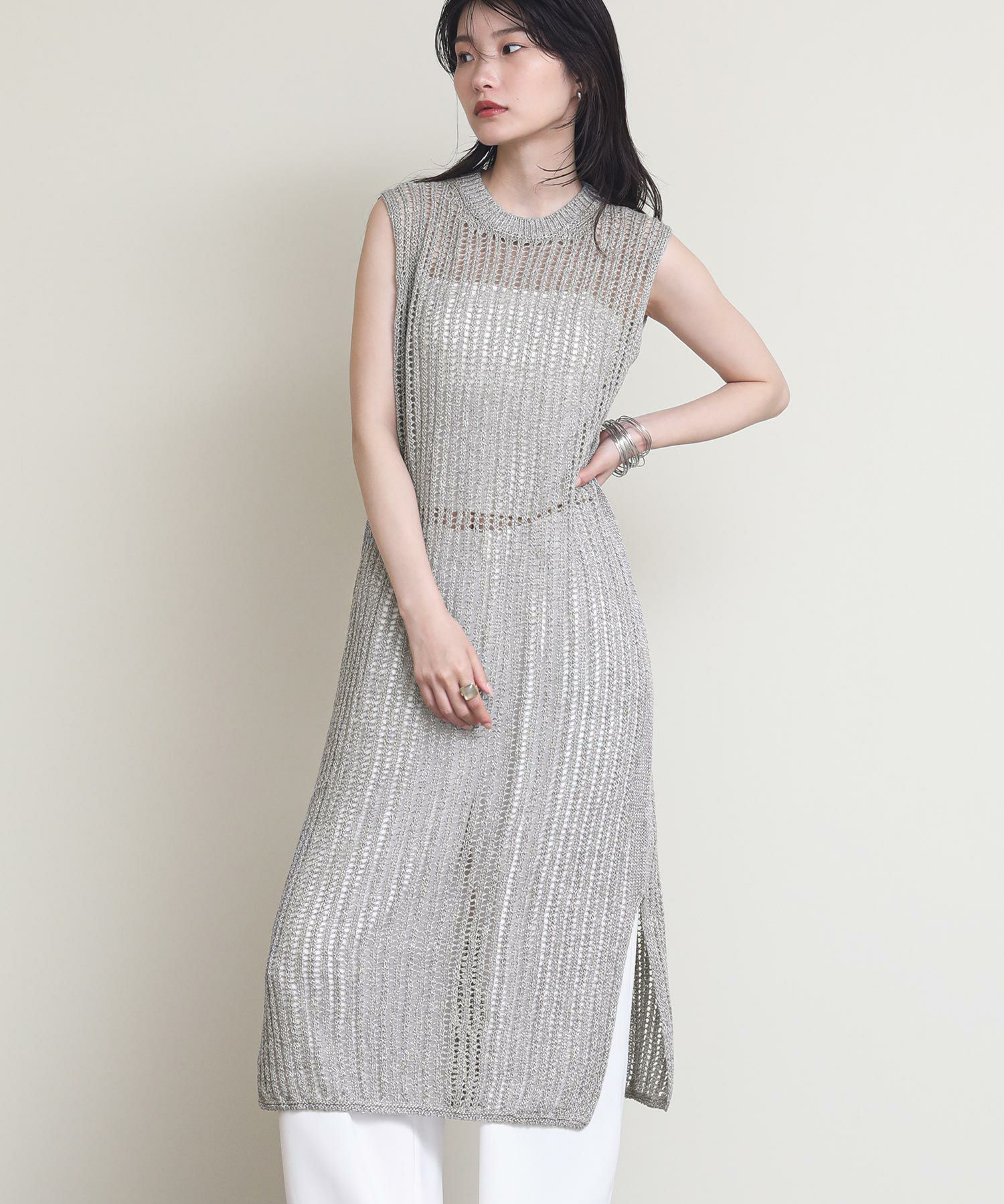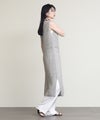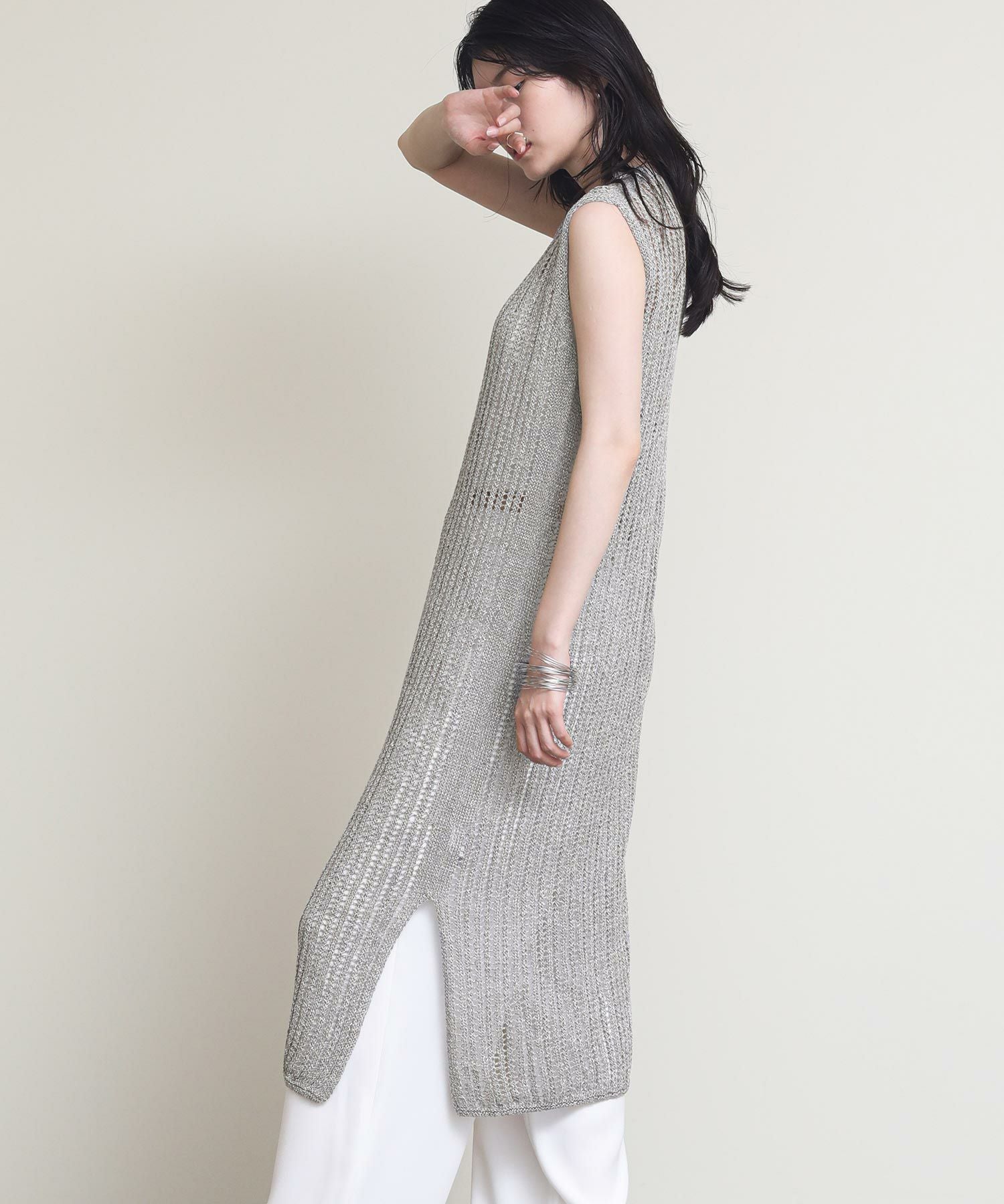 表面に樹脂コーティングを施した糸とリネンを撚糸した清涼感のある風合いのニットワンピース。