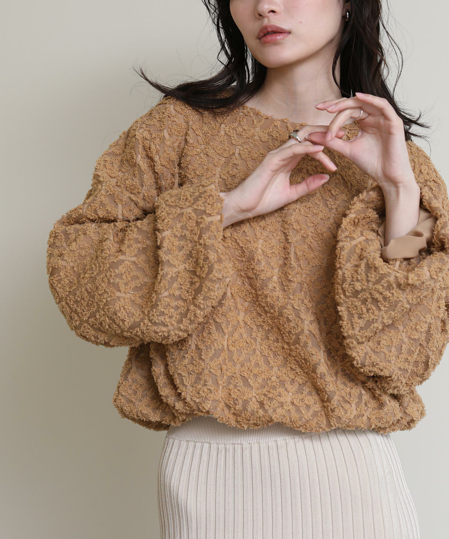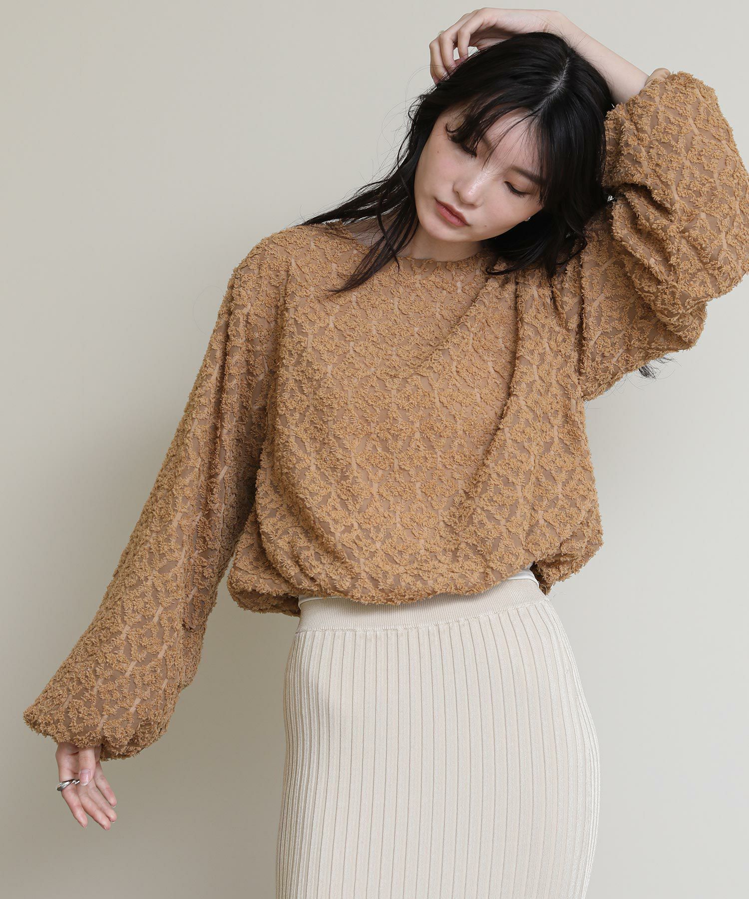 シアー感のあるジャカード素材が上品なブラウス。