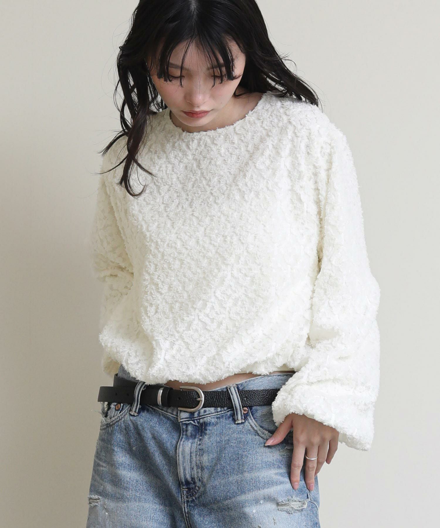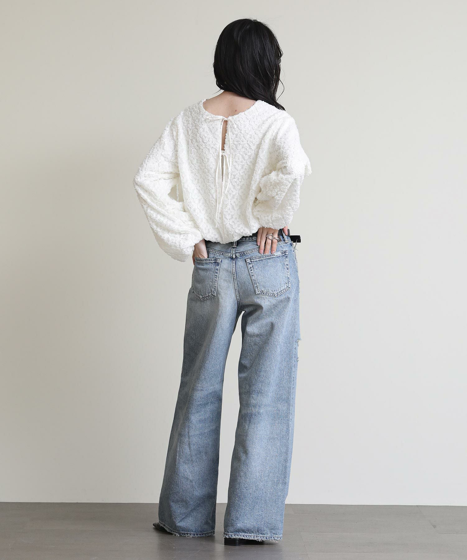 裾と袖口のパルーン仕様と背中リボンの女っぽさが魅力のデザイン。パンツにもスカートにも合わせやすく、きれいめからカジュアルまで幅広いテイストにマッチします。短めのクロップド丈ですっきりと着こなせるアイテムです◎
