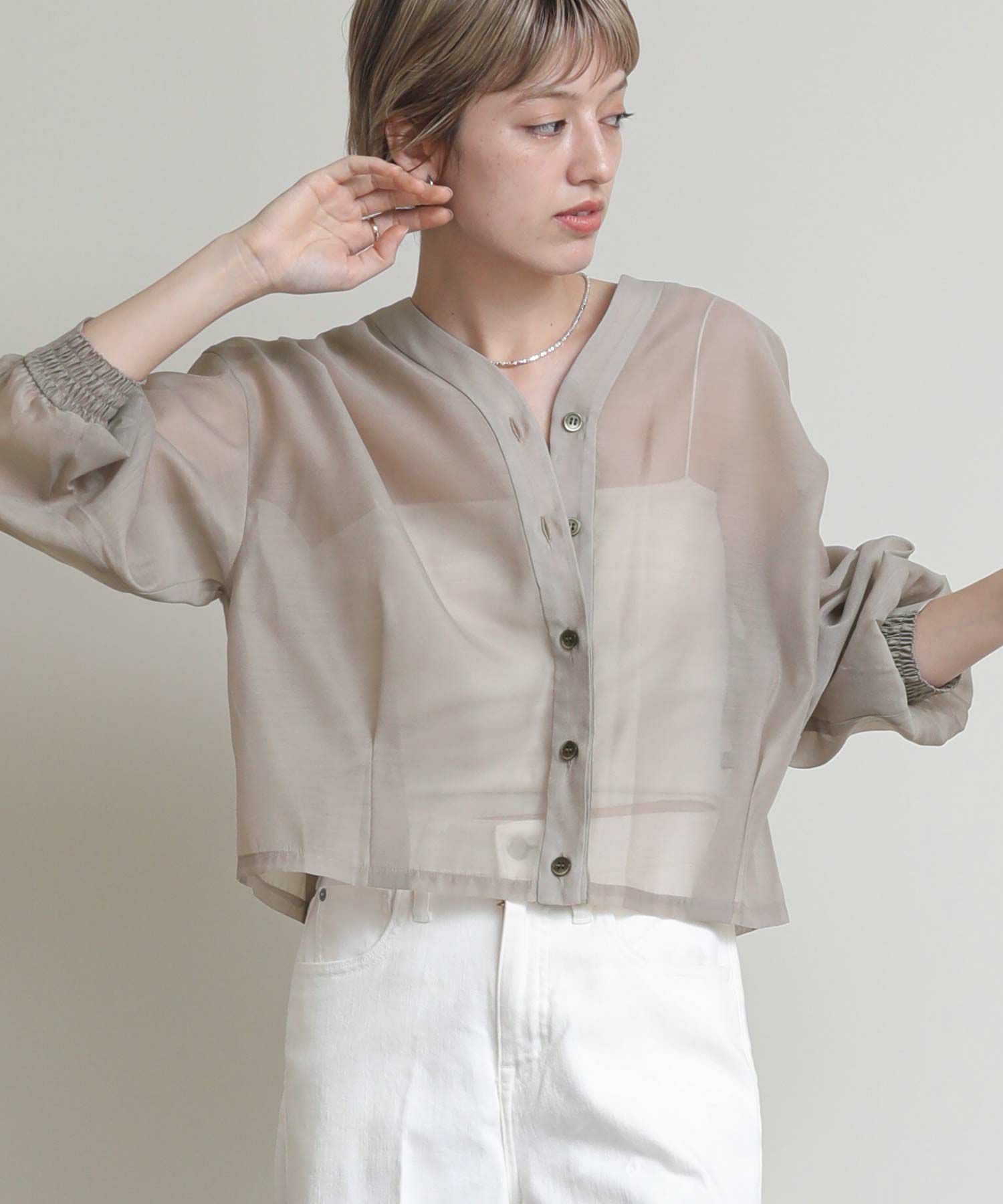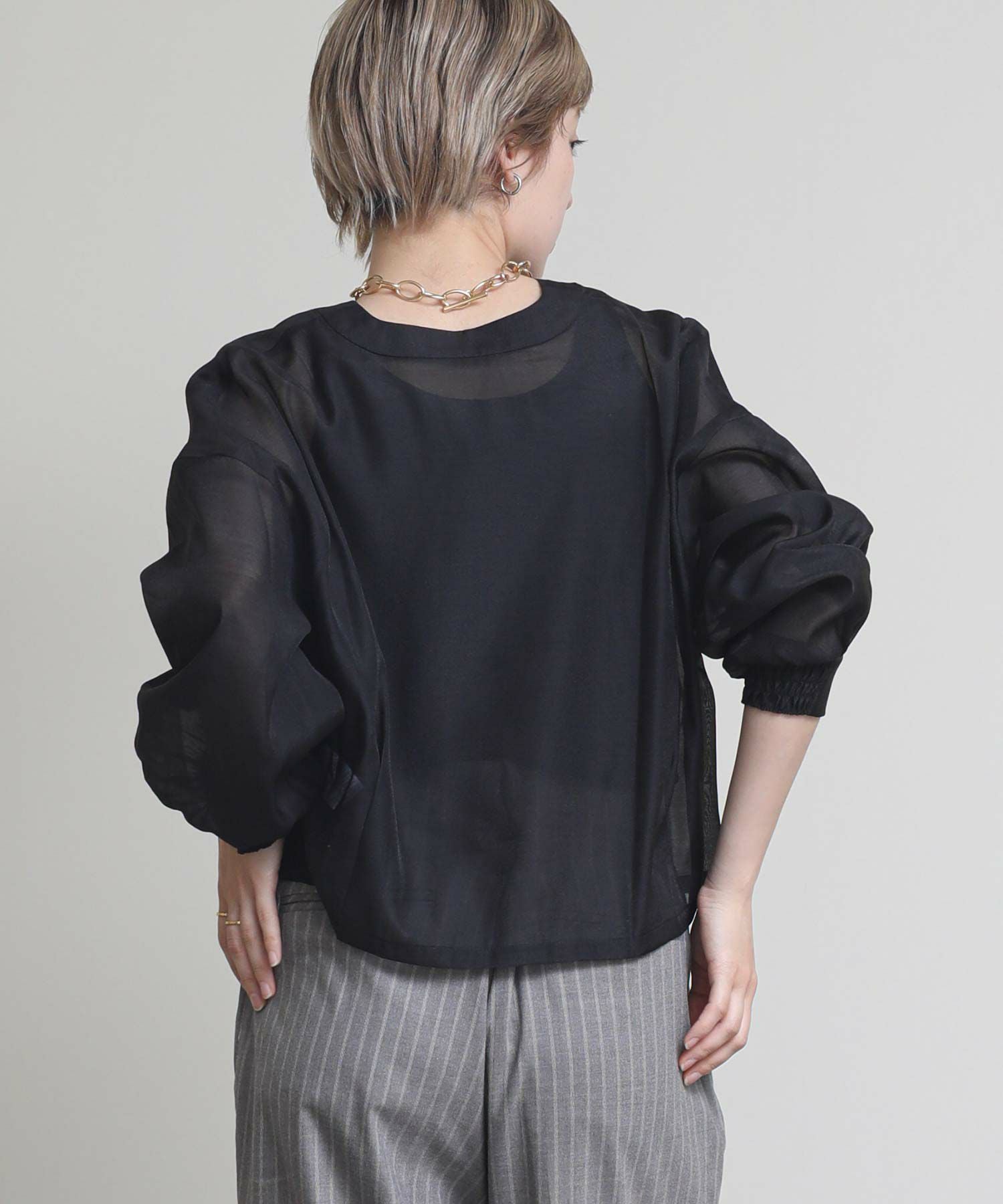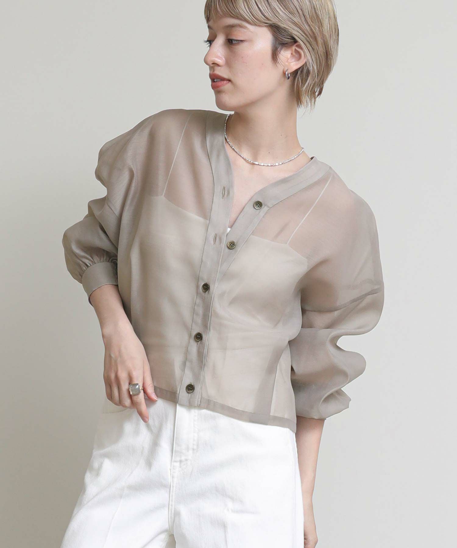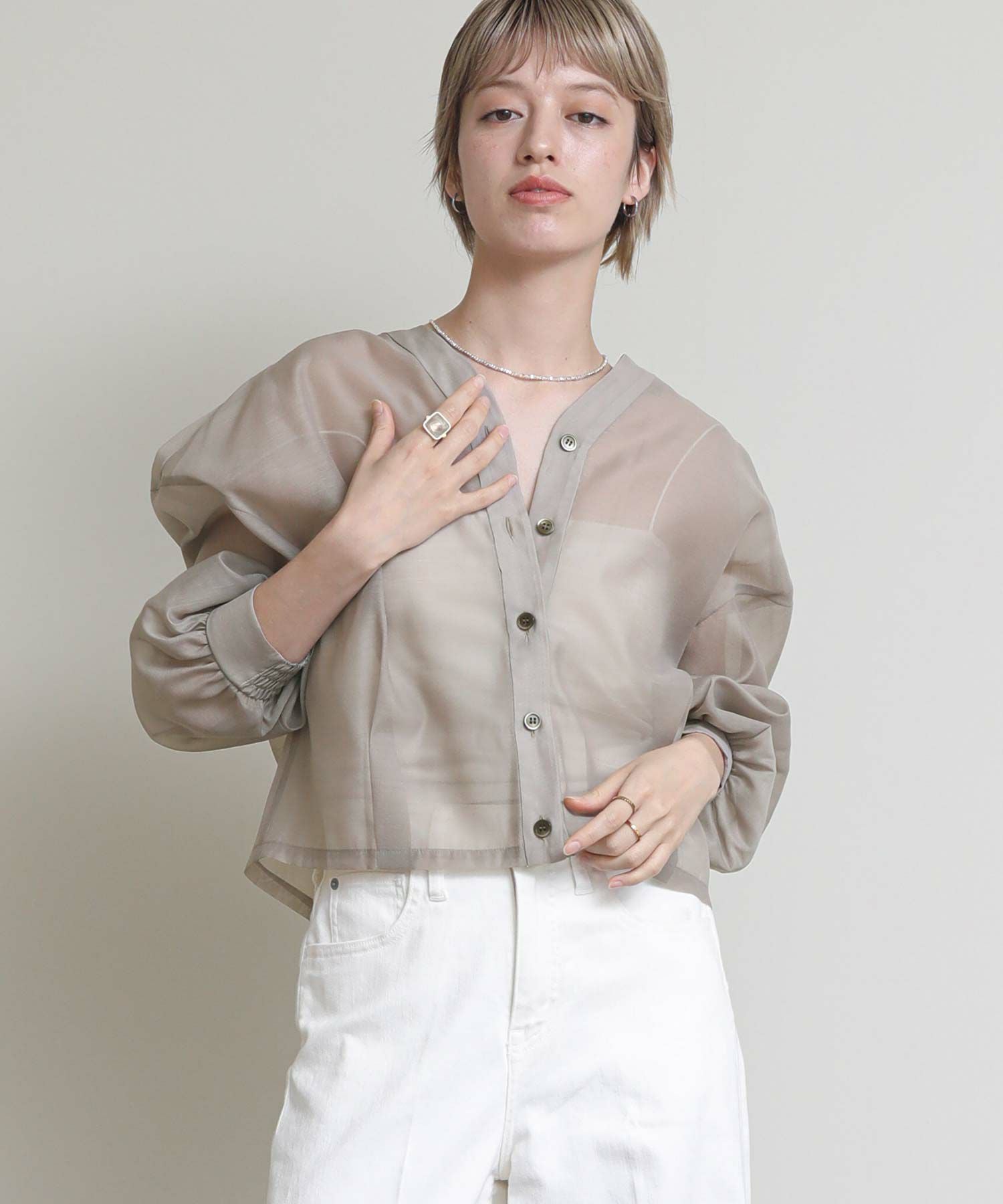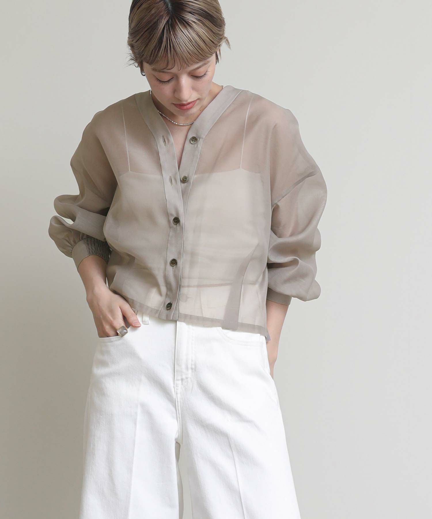 繊細なオーガンジー生地で優しいシアー感を楽しめるブラウス。