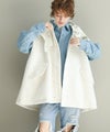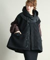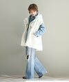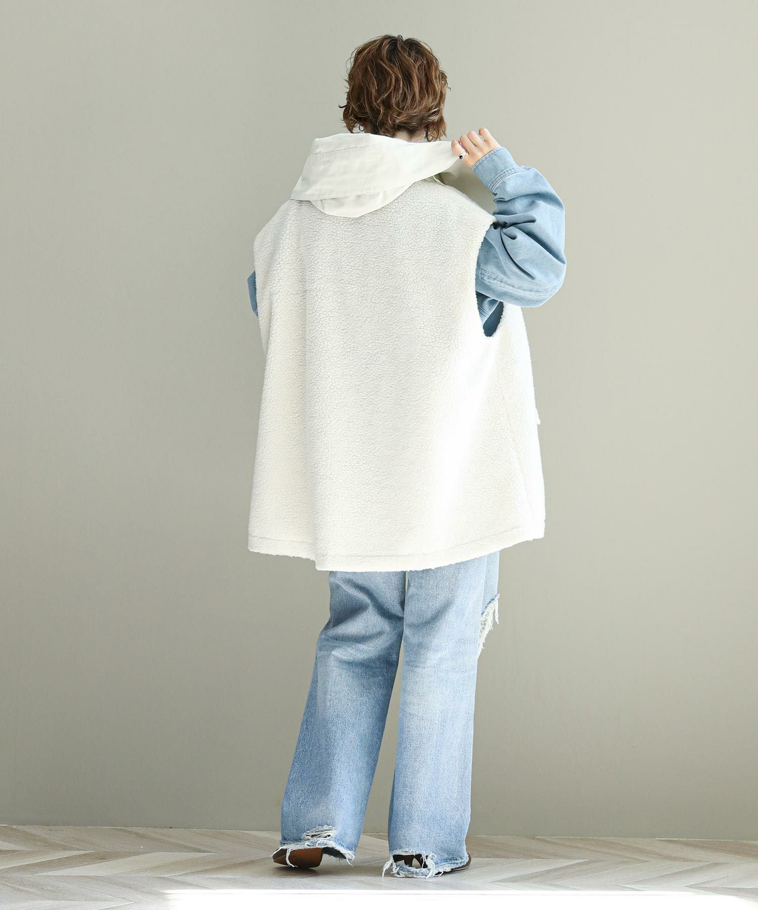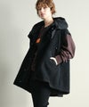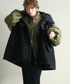 ゆったりとしたサイズ感で厚手のニットやスウェットはもちろん、アウターの上からでも羽織れるデザイン。M65の外付けフードをデザインソースに、しっかり立つ首回りとフードの大きさにこだわり、小顔効果も◎ハリ感のある素材できれいなシルエットを作ります。テーラードジャケットやMA-1の上から羽織るとこなれ感も出ておすすめです。ボアとタフタを同トーンでまとめワーク感が出すぎないようにしています。