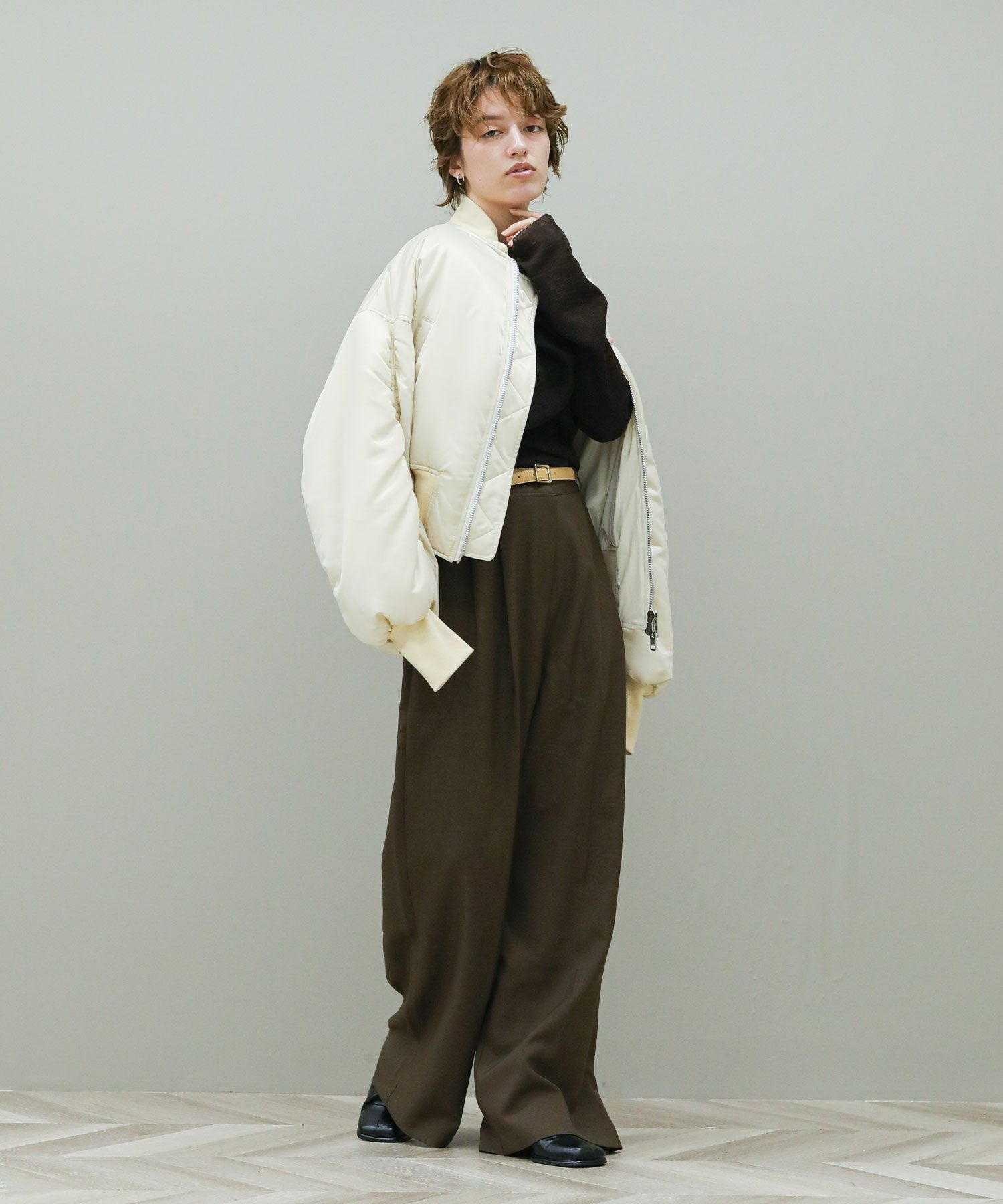 着丈と袖のバランスがポイント。さっと羽織るだけでスタイルが決まります。重厚感のあるファスナーやヘビーなリブなどMA-1らしさに拘りながらも女性らしいスタイルにマッチするシルエットです。今シーズンはライトベージュとカーキの2色。重くなりがちな秋冬スタイルを軽やかに仕上げてくれます。