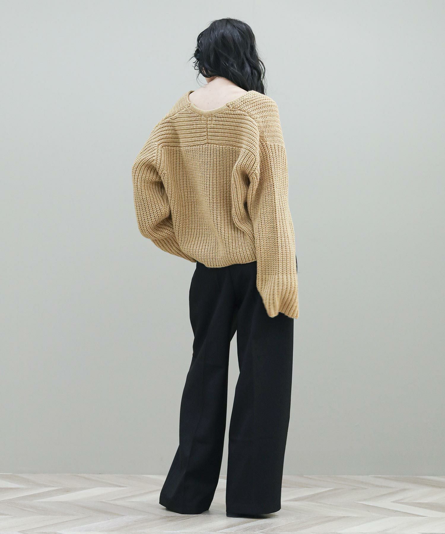 ベーシックな畦ニットですが、幅広の袖やネックラインでトレンド感を出しています。タートルネックやシャツとのレイヤードはもちろん、シンプルにロンTに重ねるだけでもサマになります。