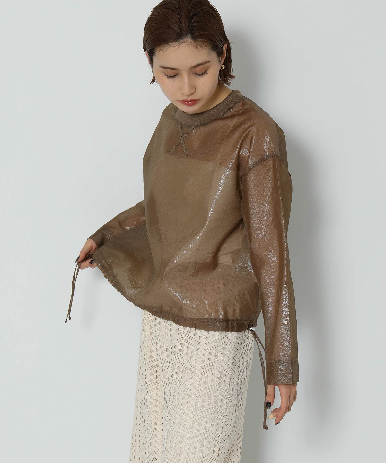 オーガンジーに箔コーティングを施した素材を使用しており、上品な光沢とハリ感が、高級感を演出してくれます。