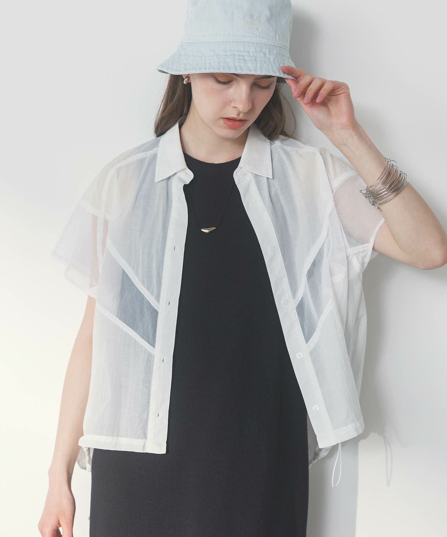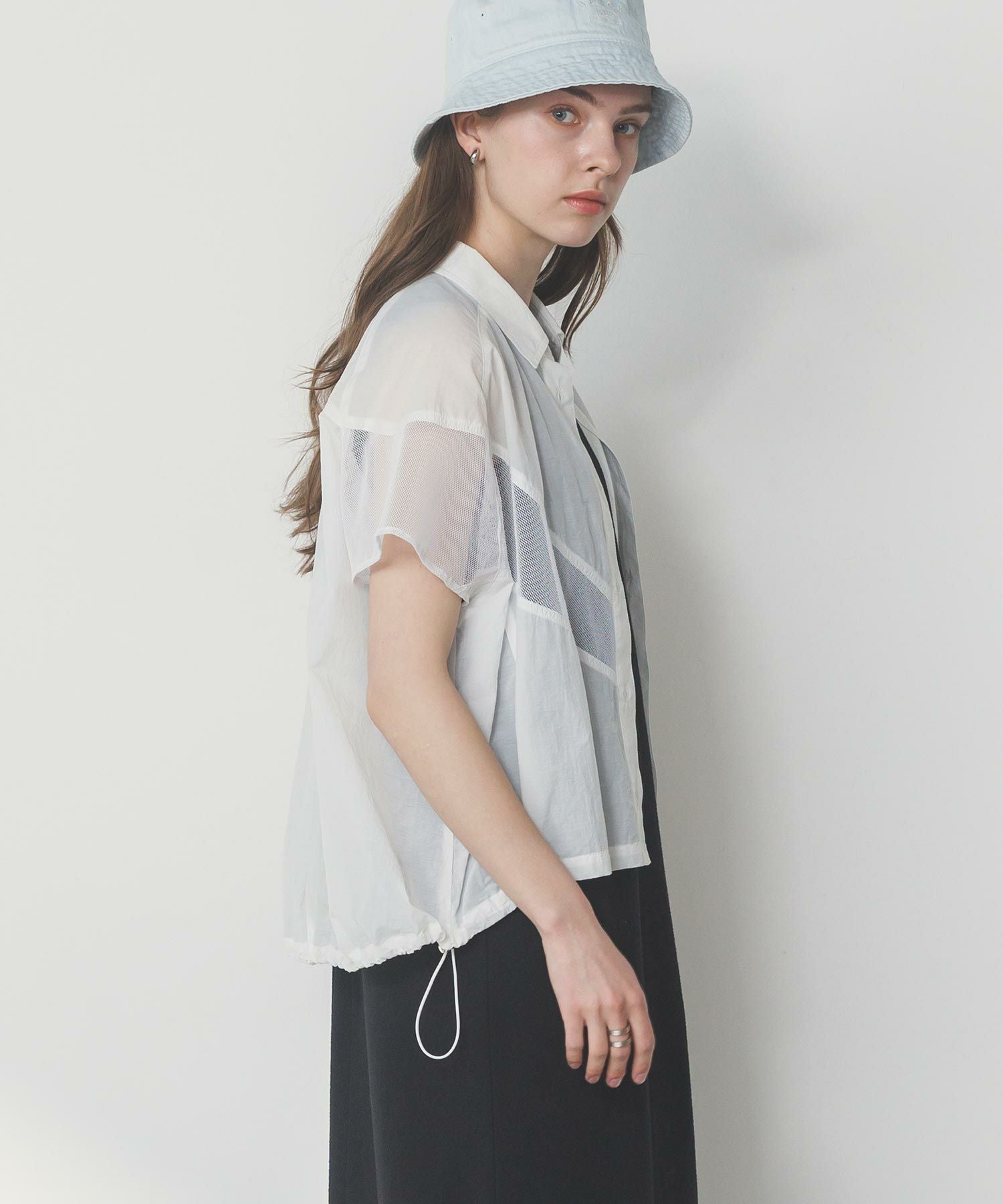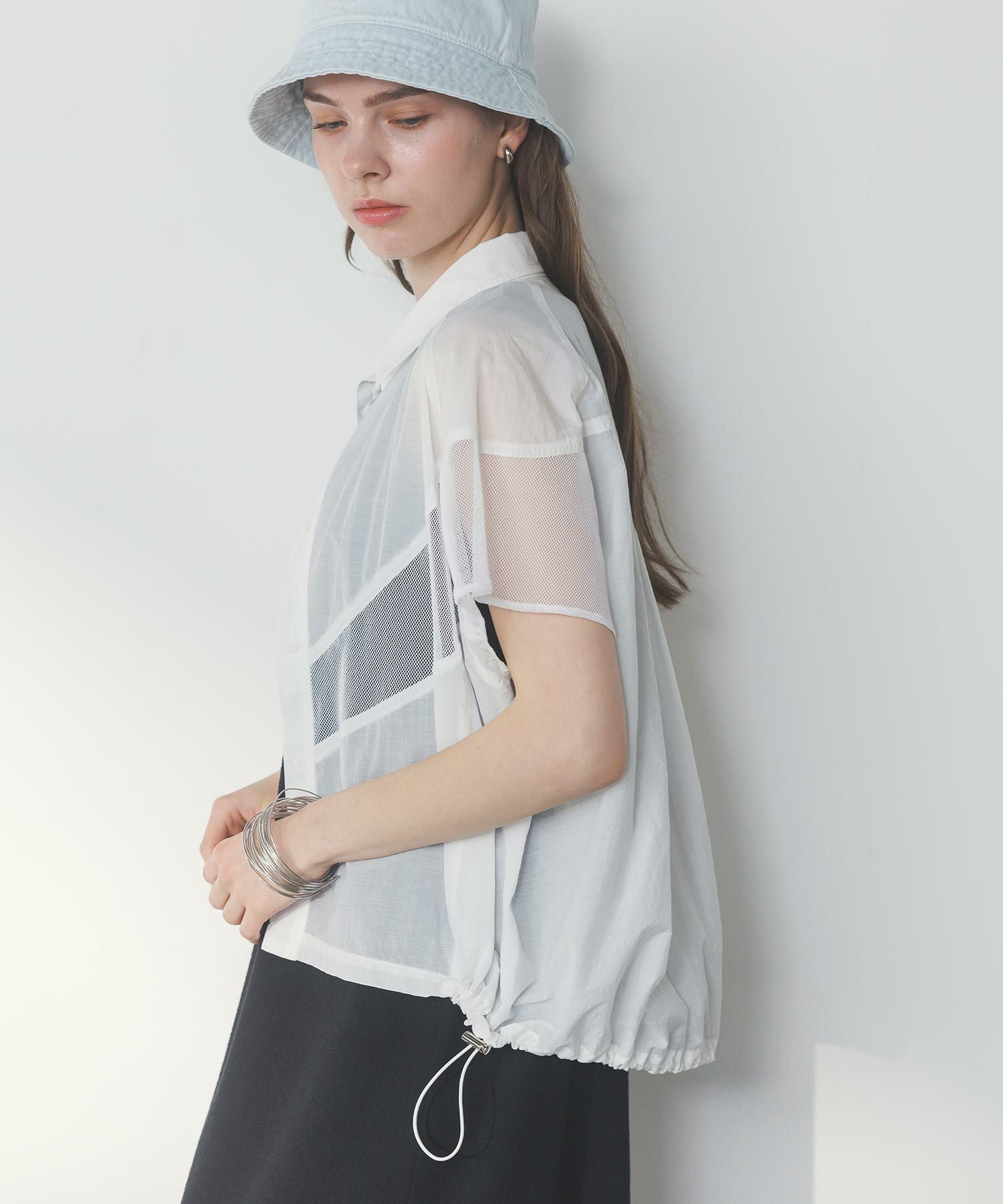 シアー感のあるエアリーな素材で涼しく着用頂けて、二の腕をさりげなくカバーする袖丈やふんわりしたシルエットが気になるパーツをぼかしてくれるデザイン。裾のドロストでシルエットの変化を楽しめるのもポイントです。一枚着としてはもちろん、夏のシンプルなコーデにさっと羽織るだけでサマになるオススメの一枚です。
