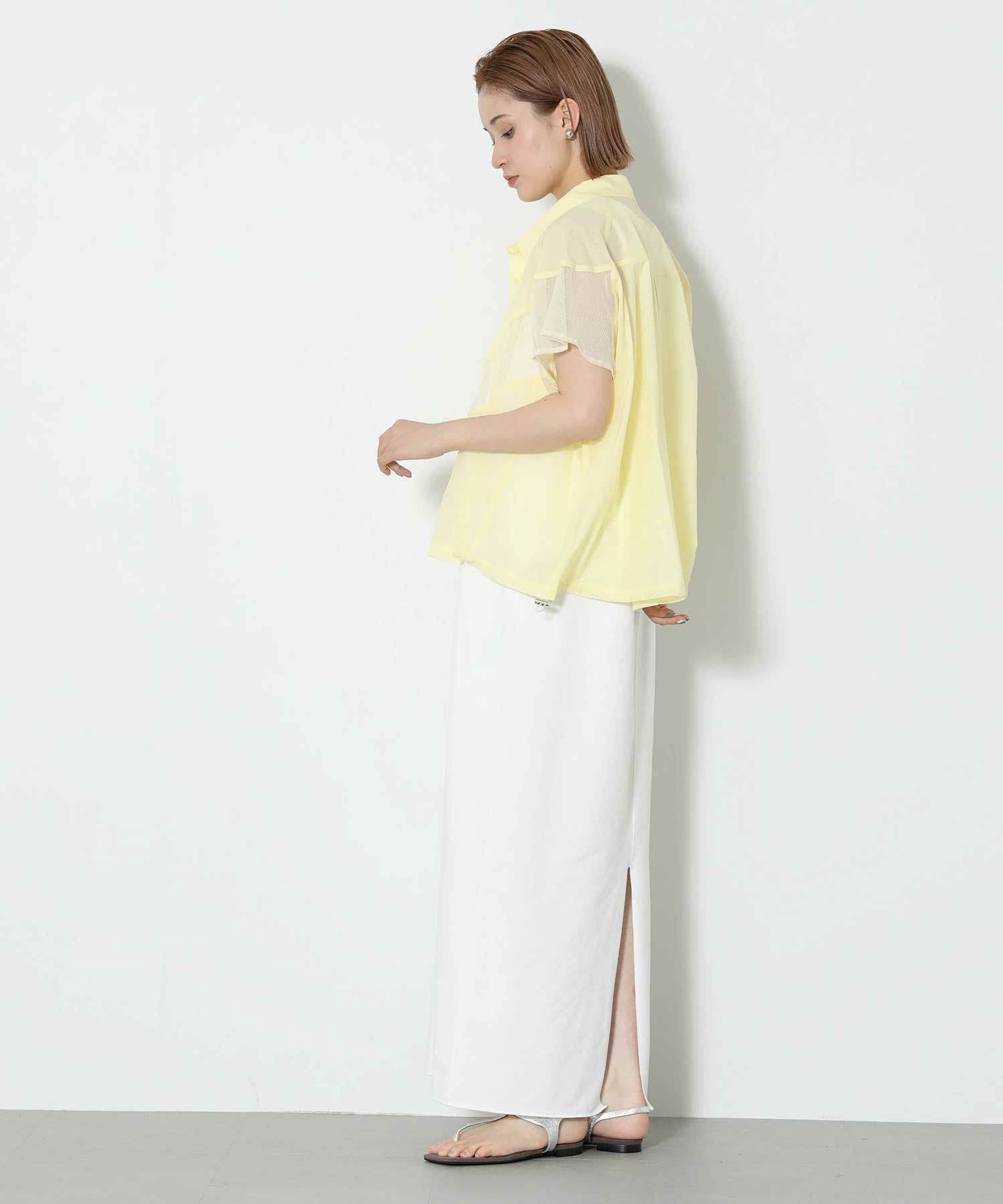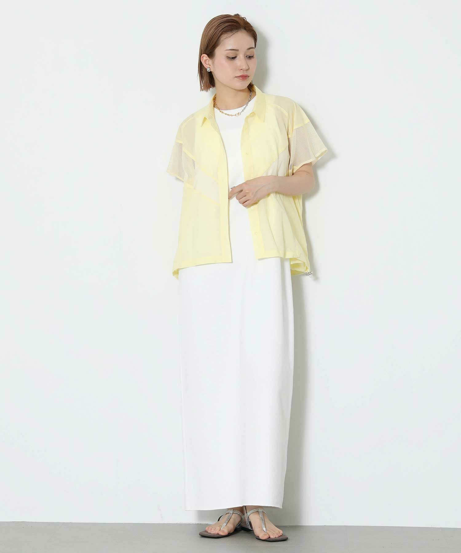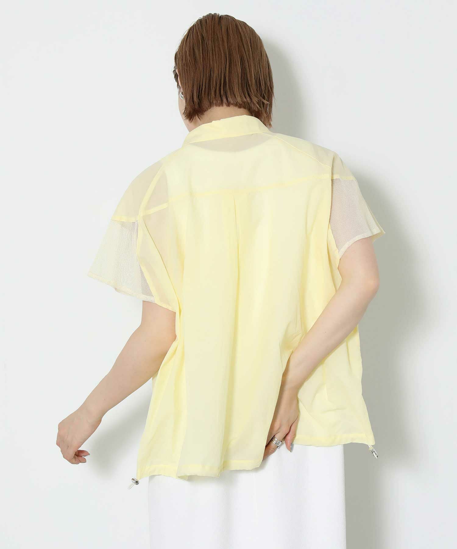 シアー感のあるエアリーな素材で涼しく着用頂けて、二の腕をさりげなくカバーする袖丈やふんわりしたシルエットが気になるパーツをぼかしてくれるデザイン。裾のドロストでシルエットの変化を楽しめるのもポイントです。一枚着としてはもちろん、夏のシンプルなコーデにさっと羽織るだけでサマになるオススメの一枚です。