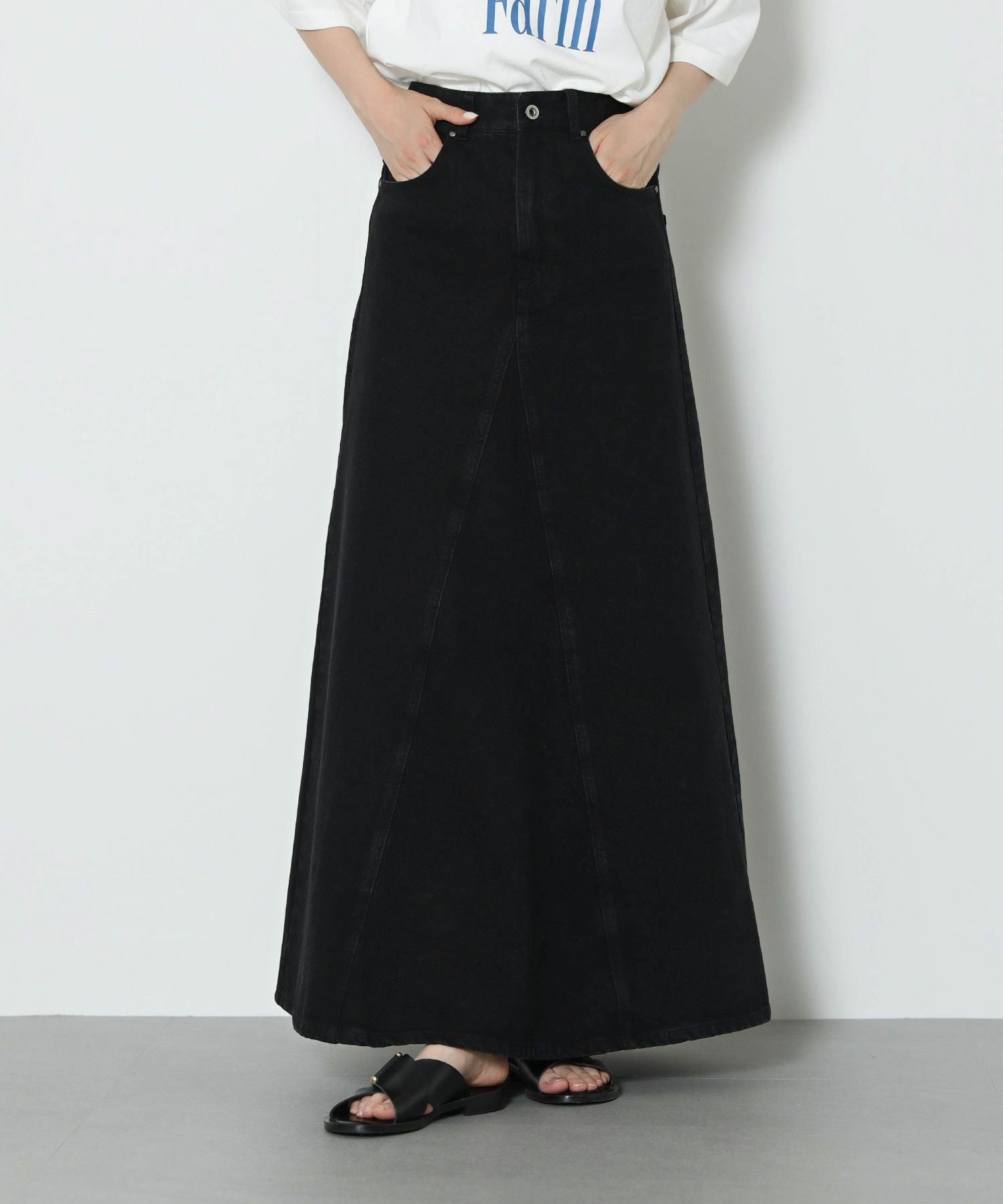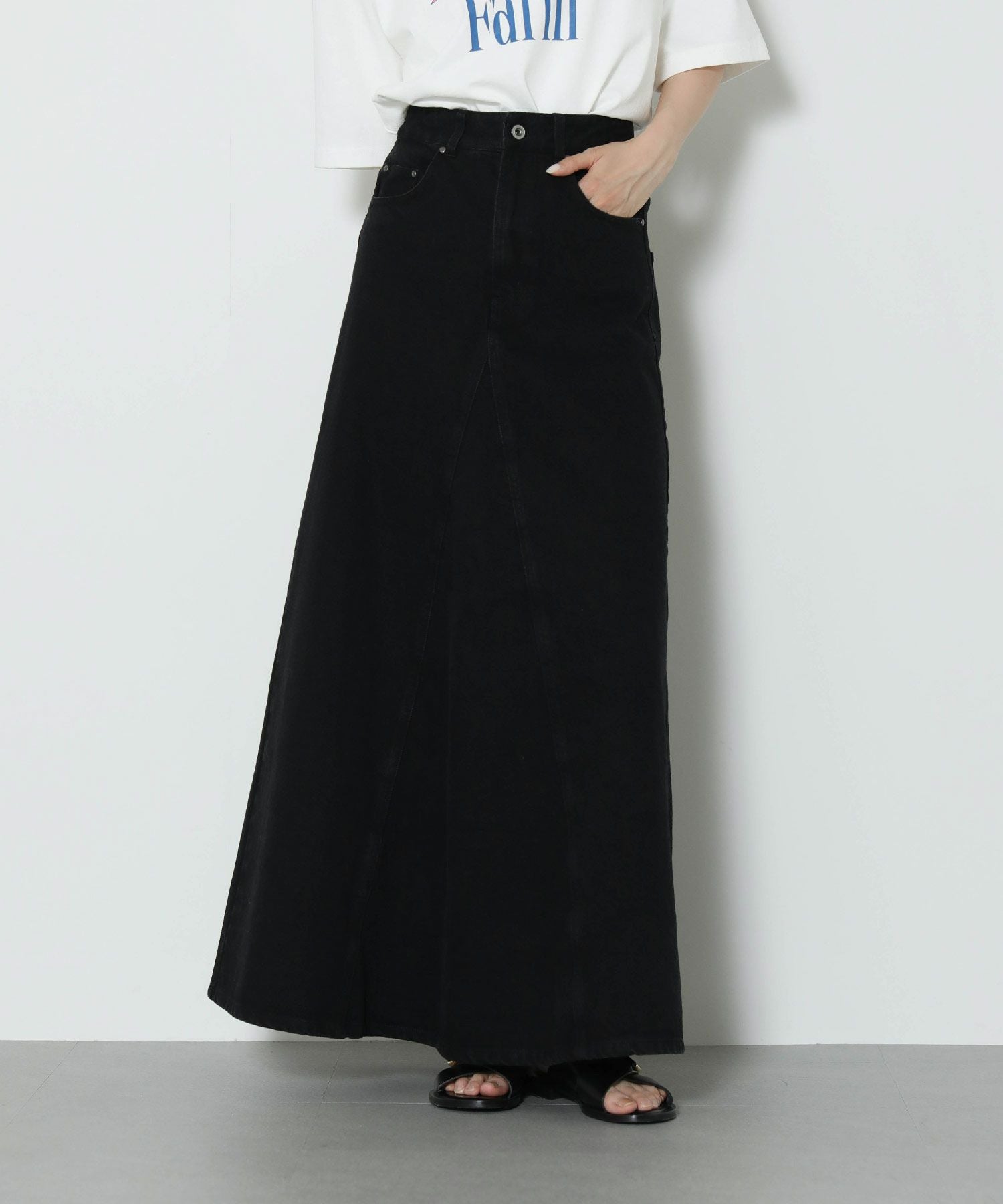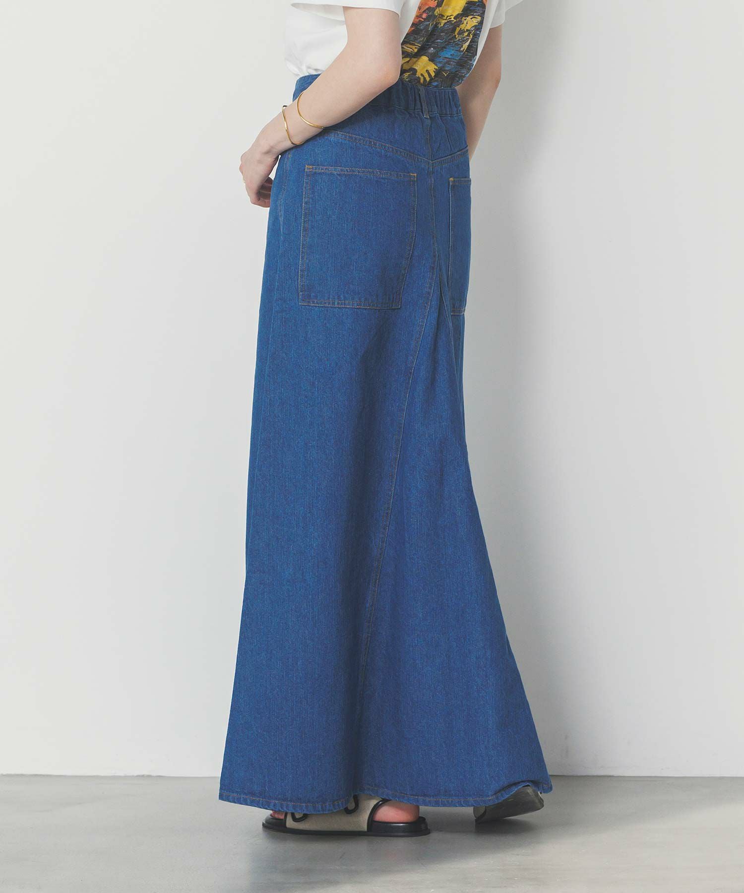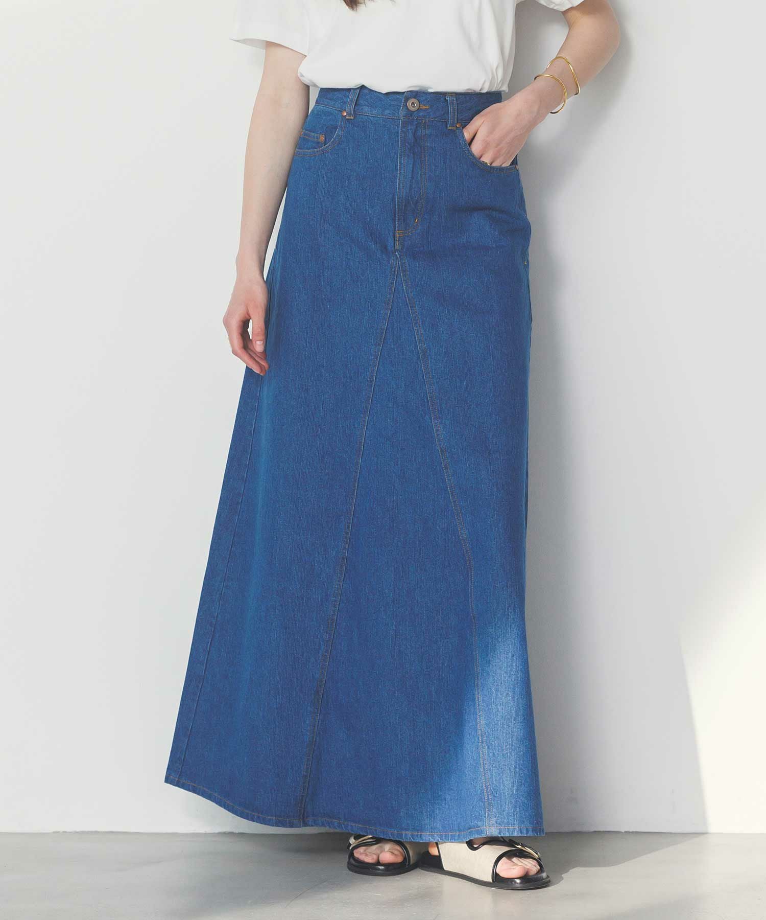 腰まわりをタイトに、裾に広がるAラインシルエットにすることでスタイルアップ効果のあるデニムスカートが登場。