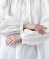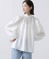 肩幅をコンパクトにデザインし、ギャザ-でたっぷりと分量をだしたパフスリーブがフェミニンさをプラスし大人かわいい装いに。