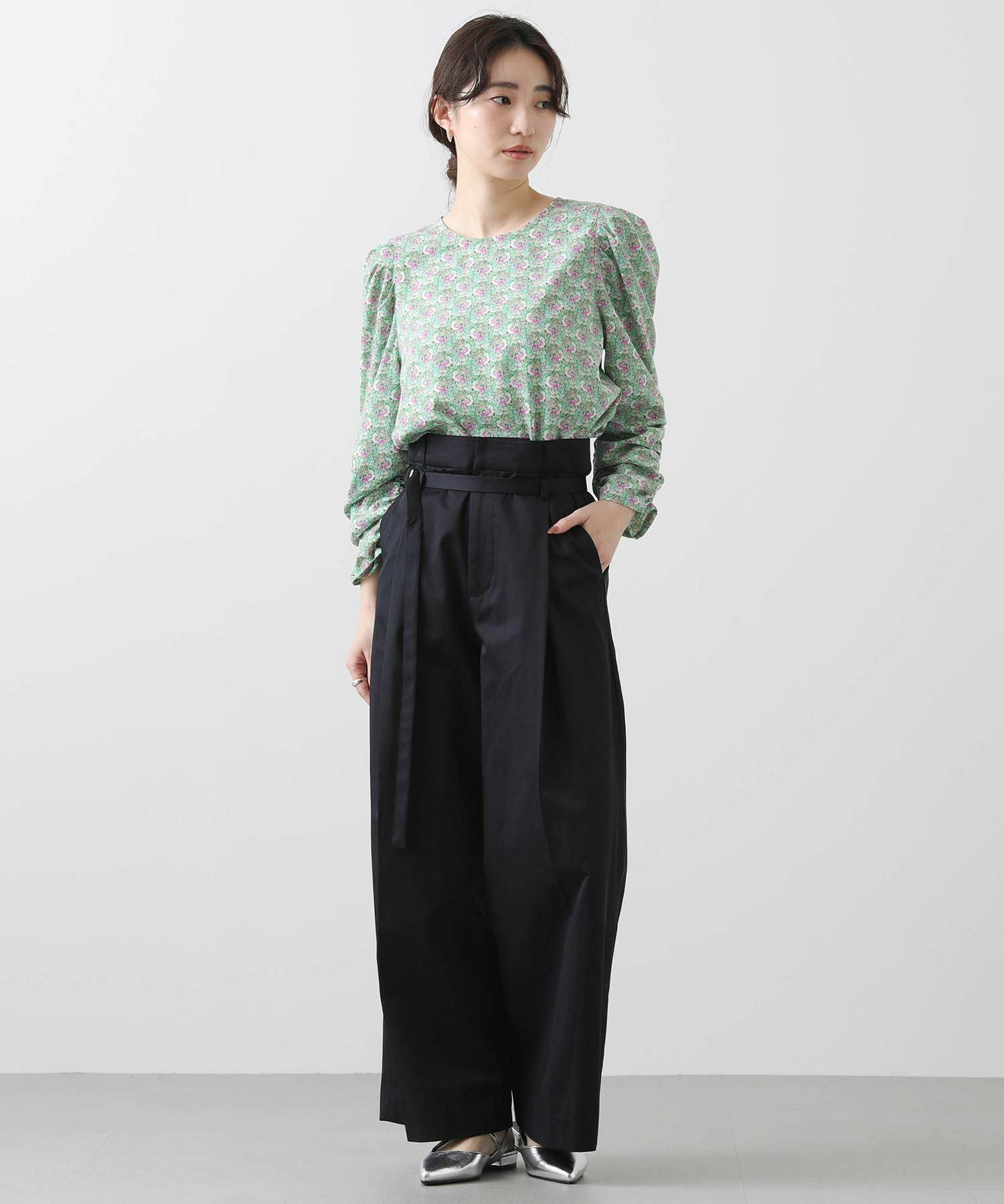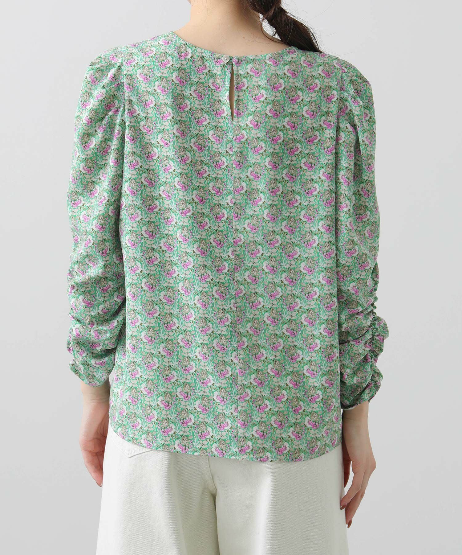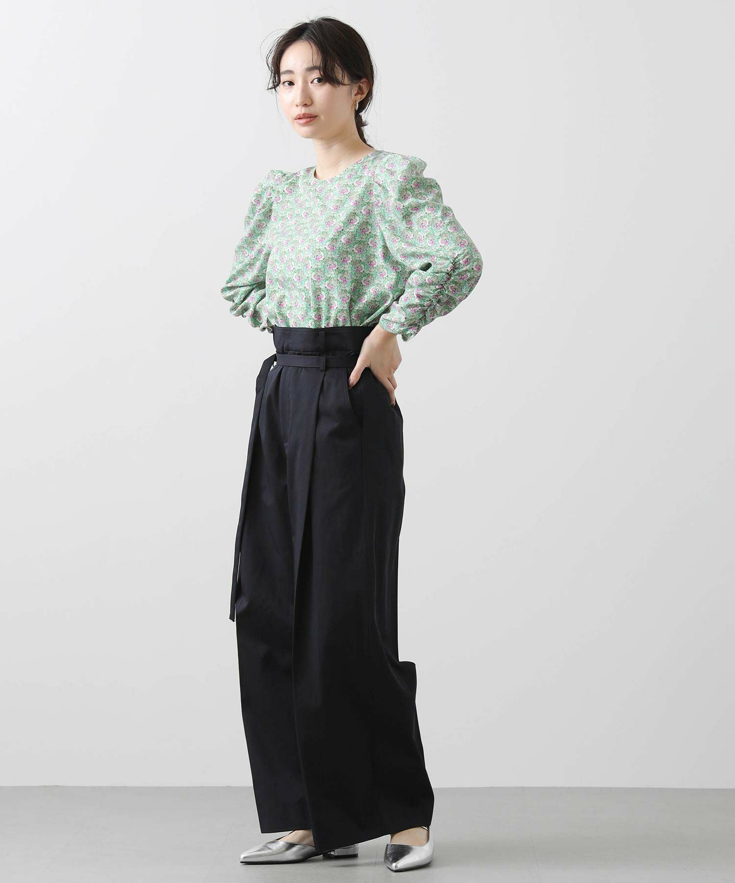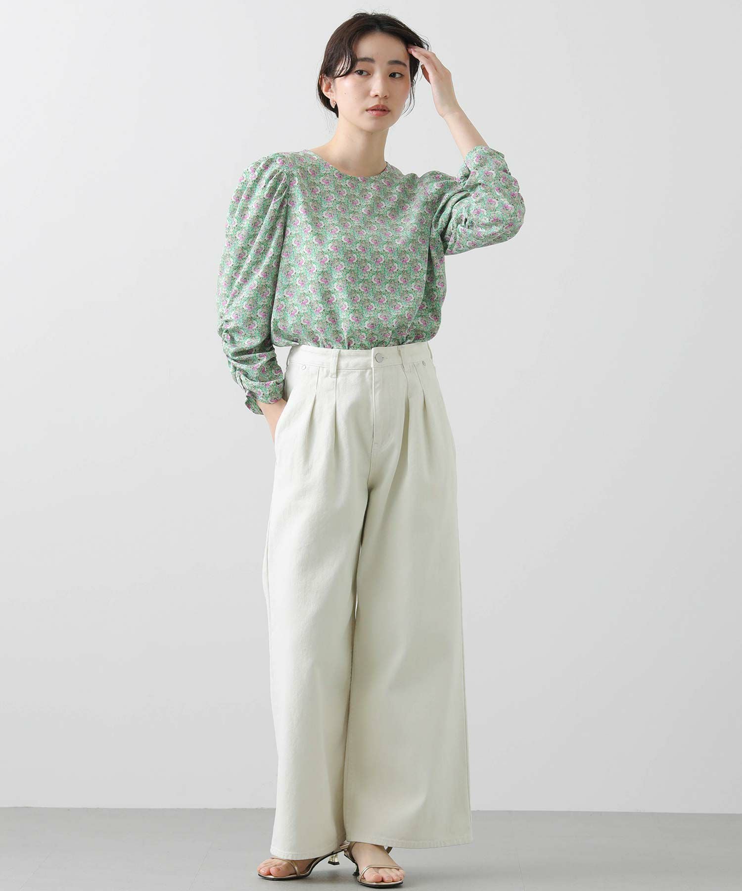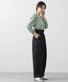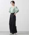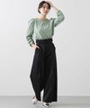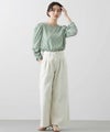 肩山にタック、袖口にギャザーを入れて女性らしさと大人っぽい雰囲気に仕上げました。シンプルな身頃デザインと長すぎない丈感で、インでもアウトでも着やすくなっています。