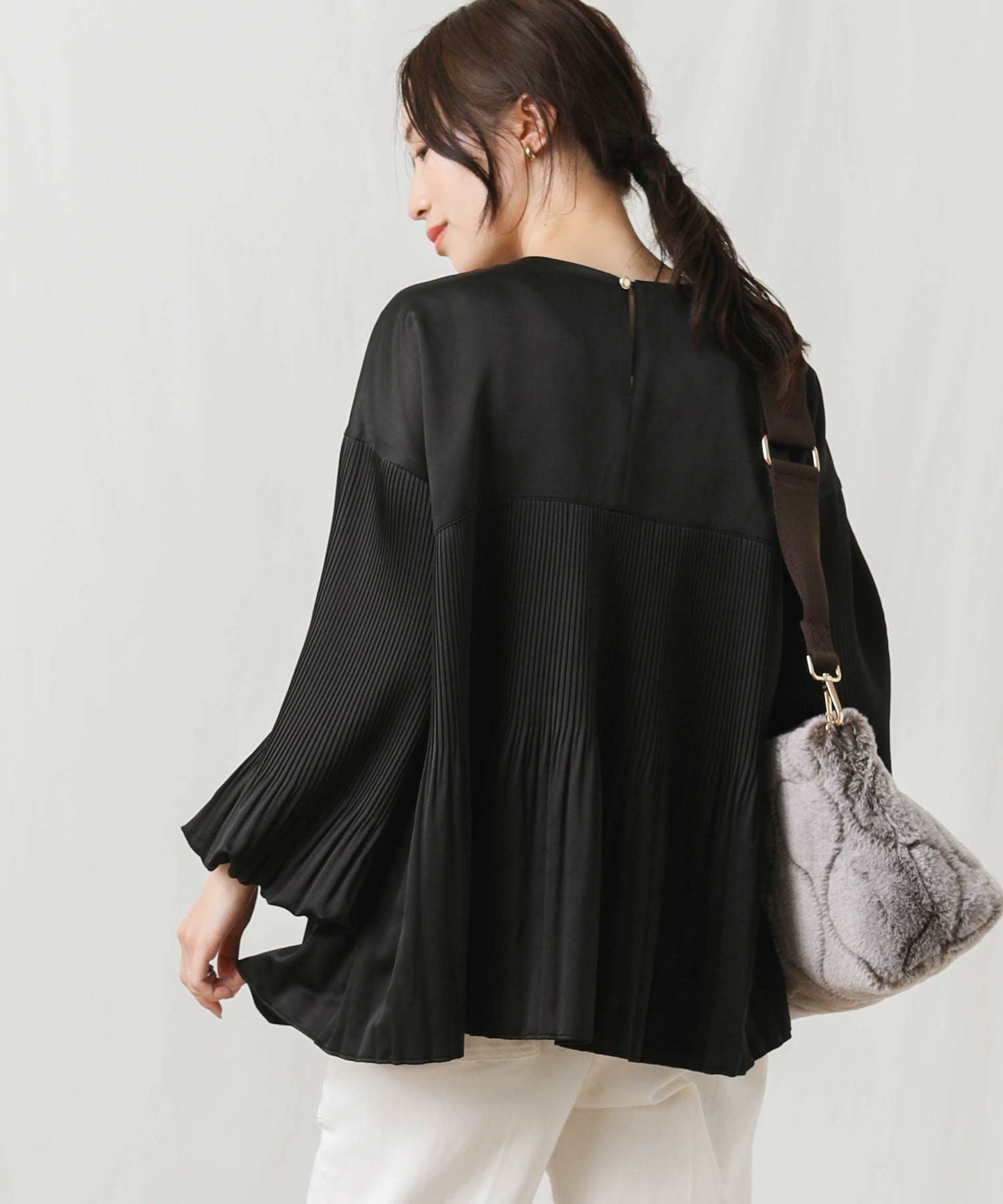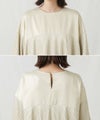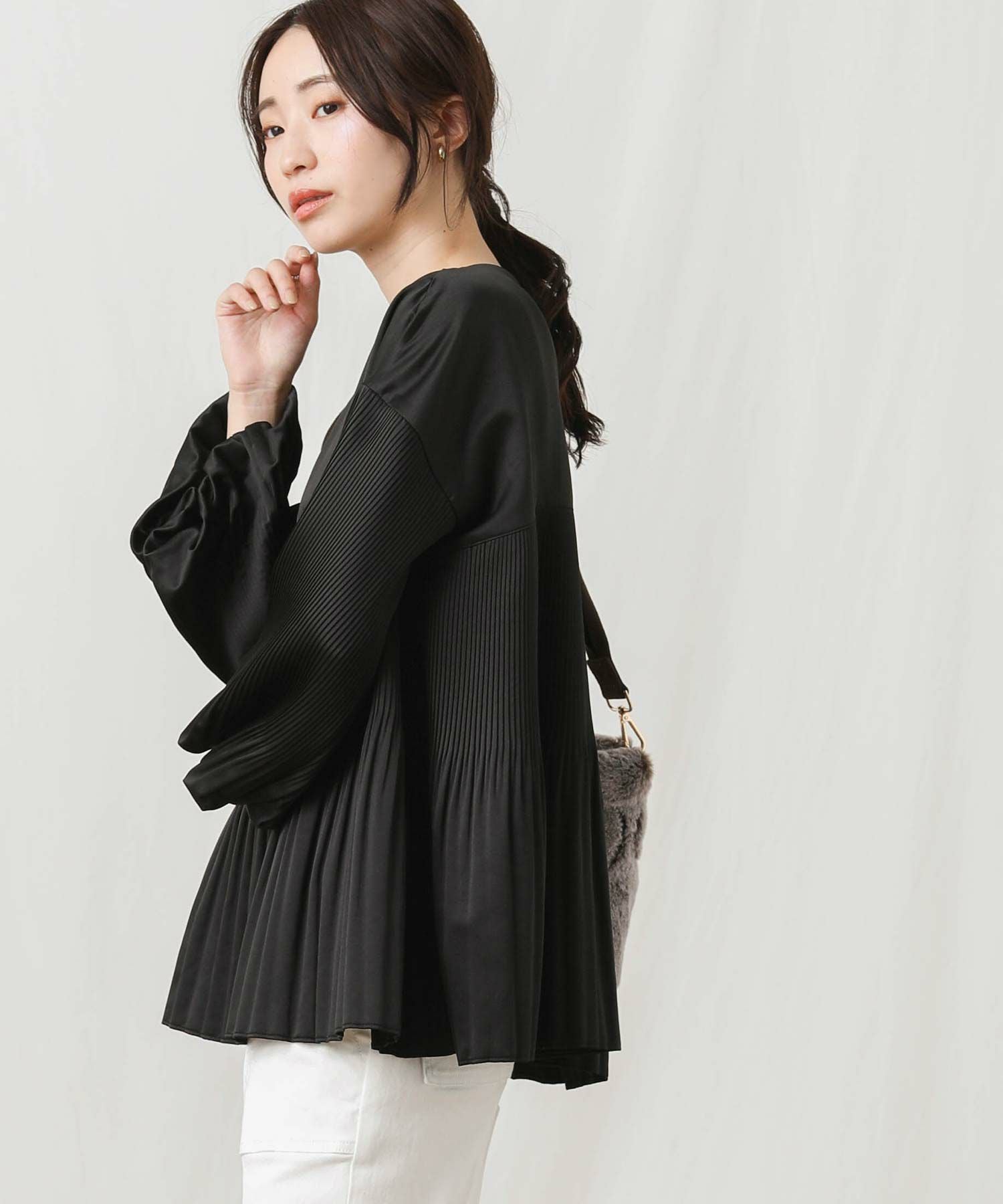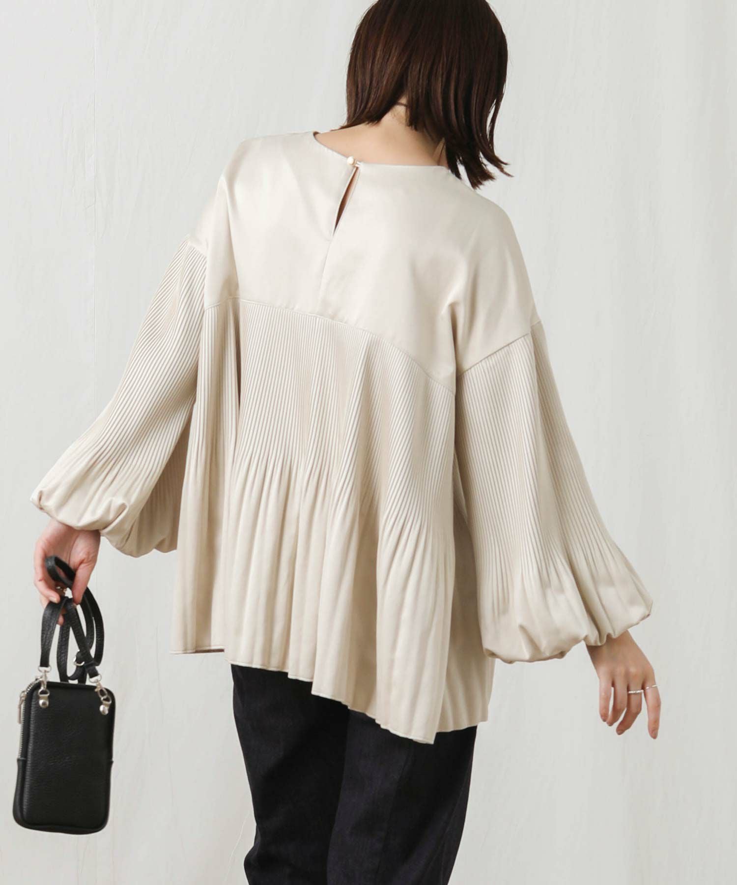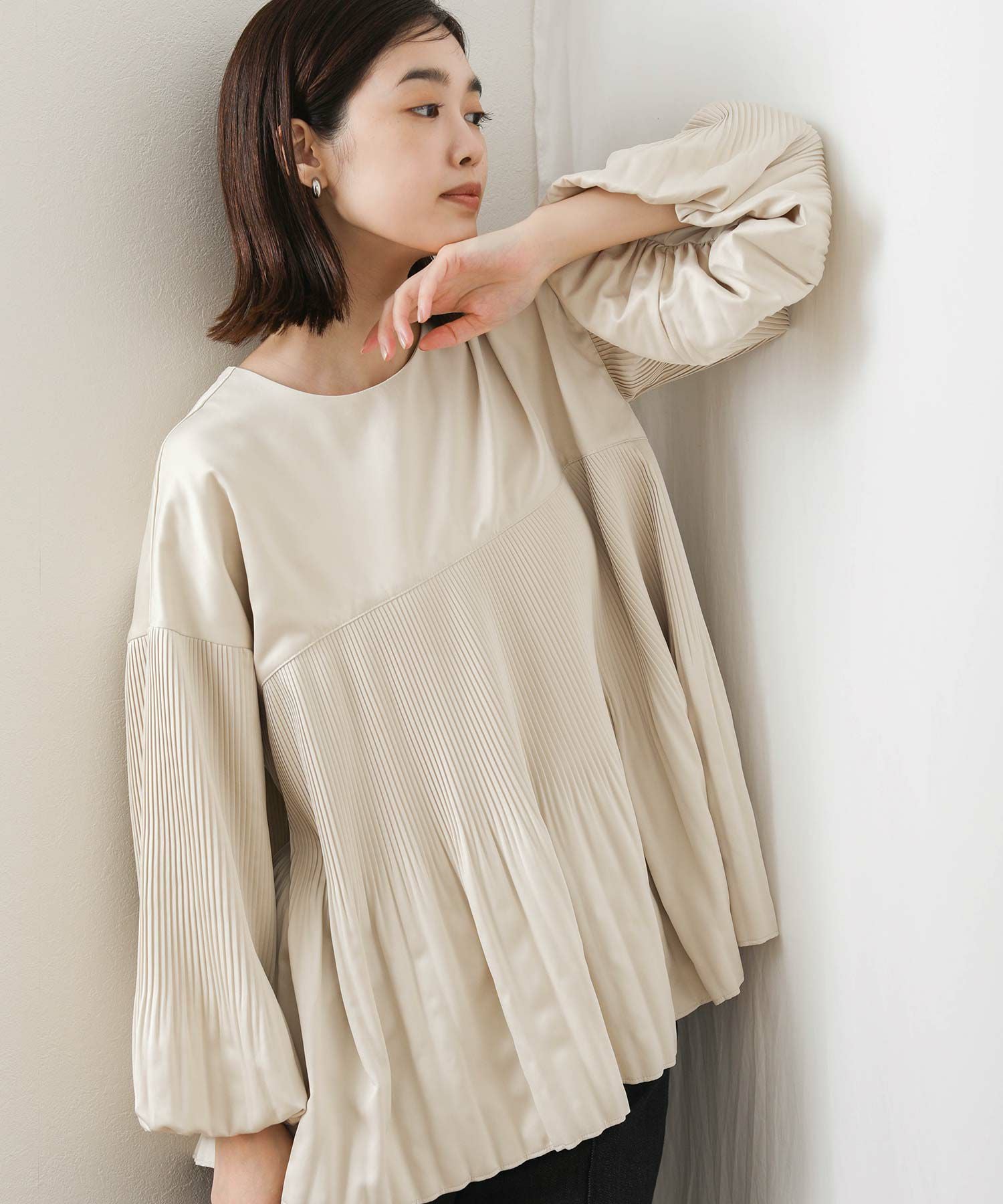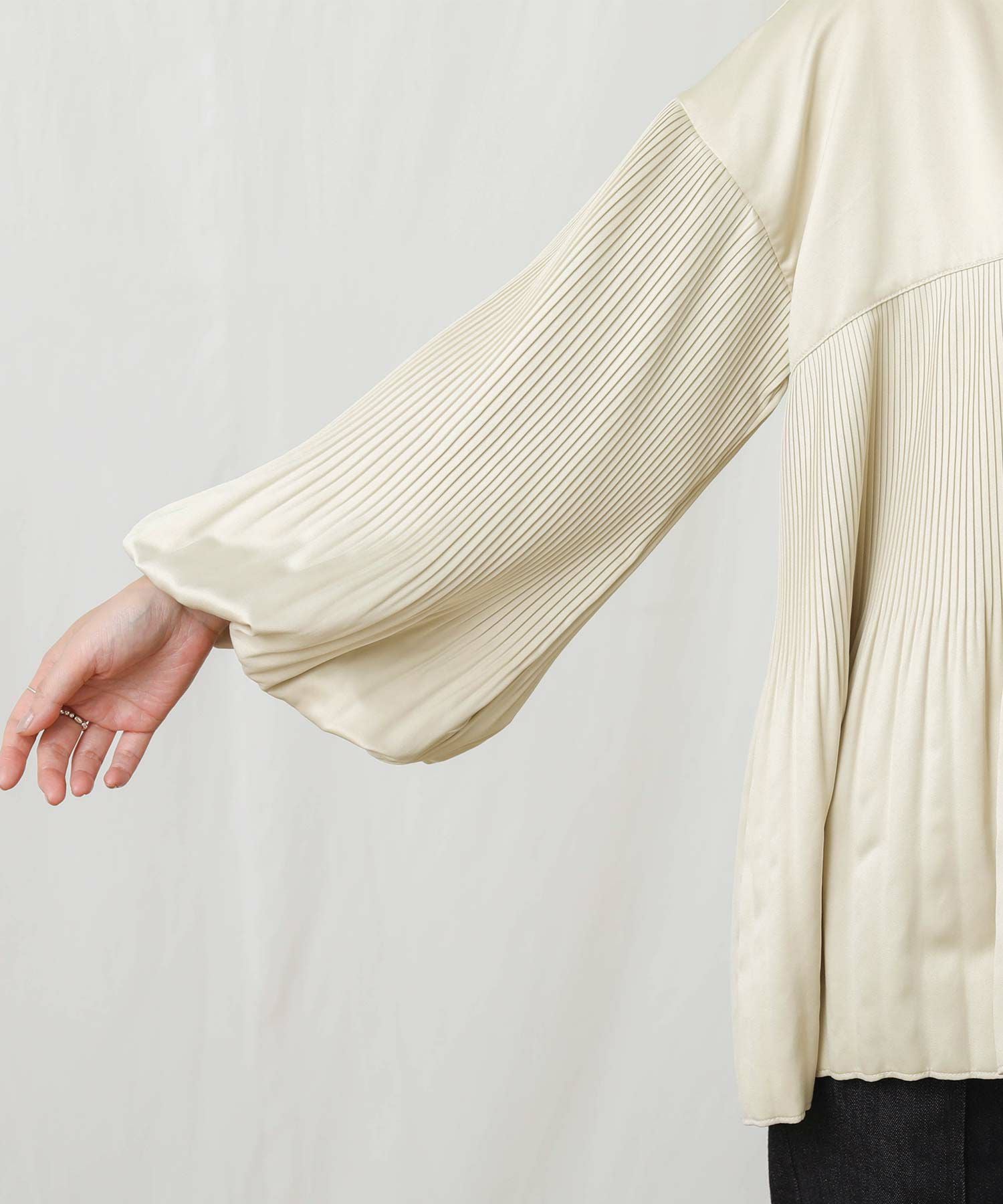 上品な光沢のあるサテン生地を使用。袖のボリューム感と裾の消しプリーツの動きがポイント。