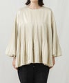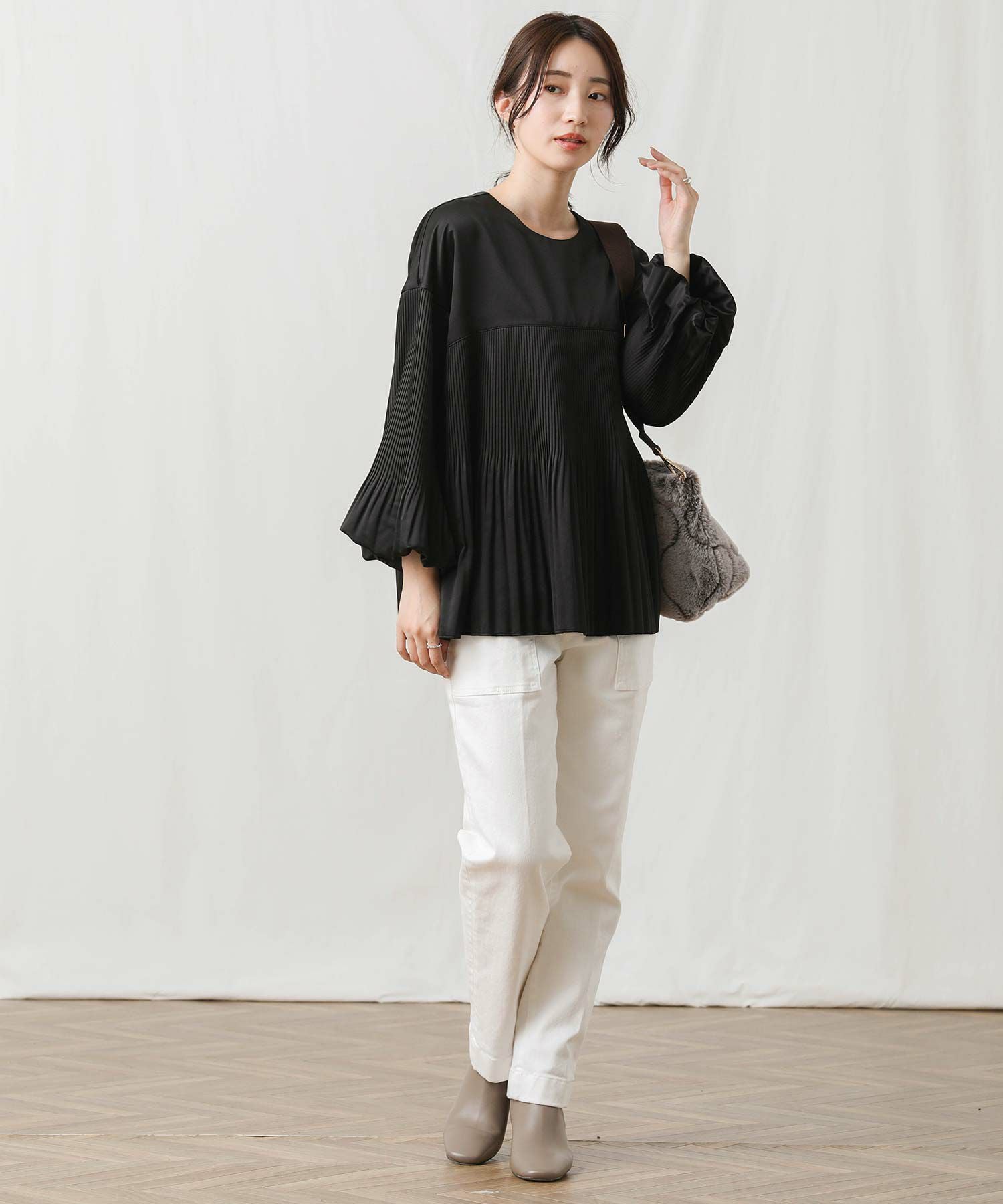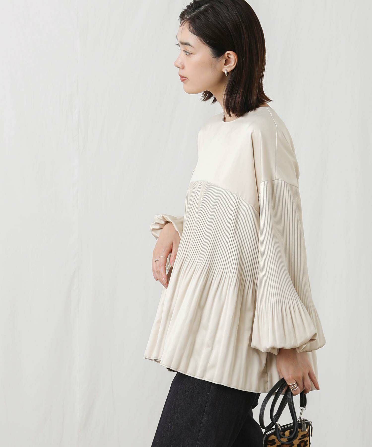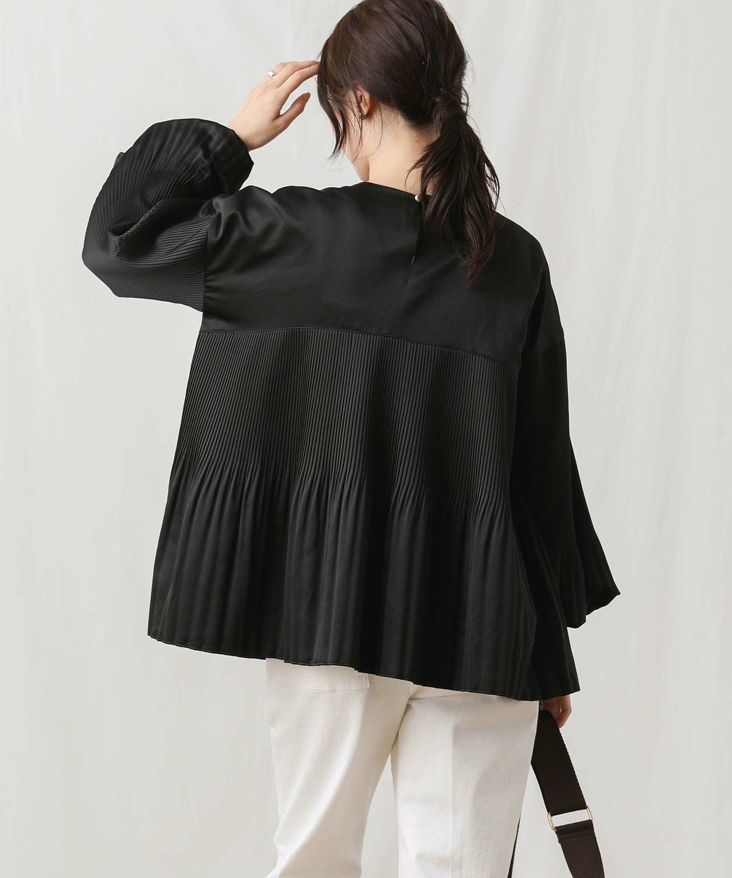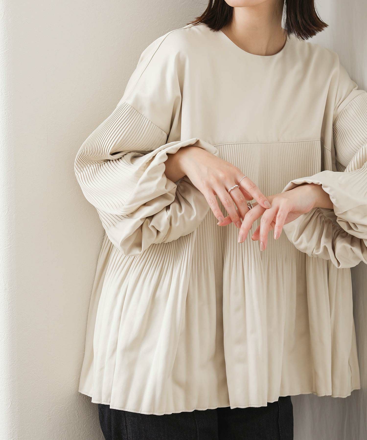 上品な光沢のあるサテン生地を使用。袖のボリューム感と裾の消しプリーツの動きがポイント。