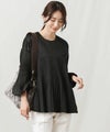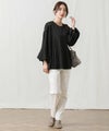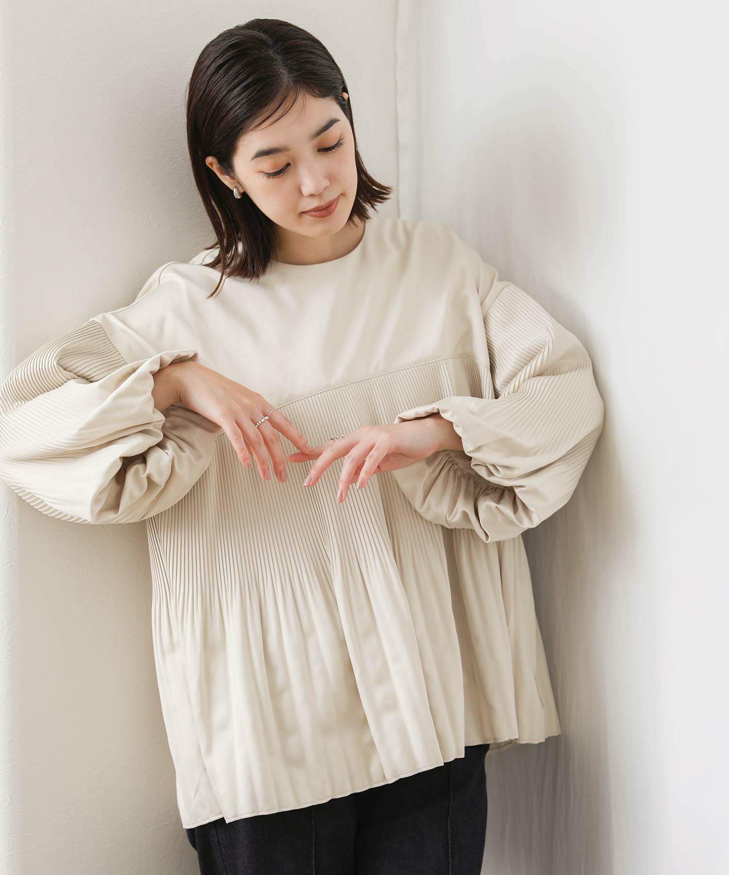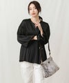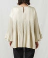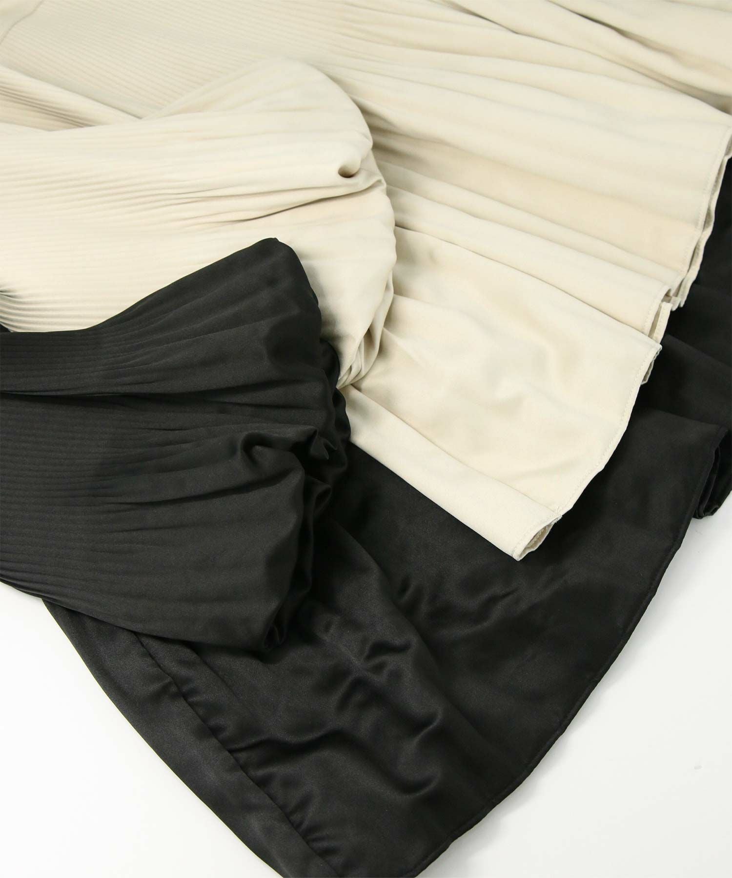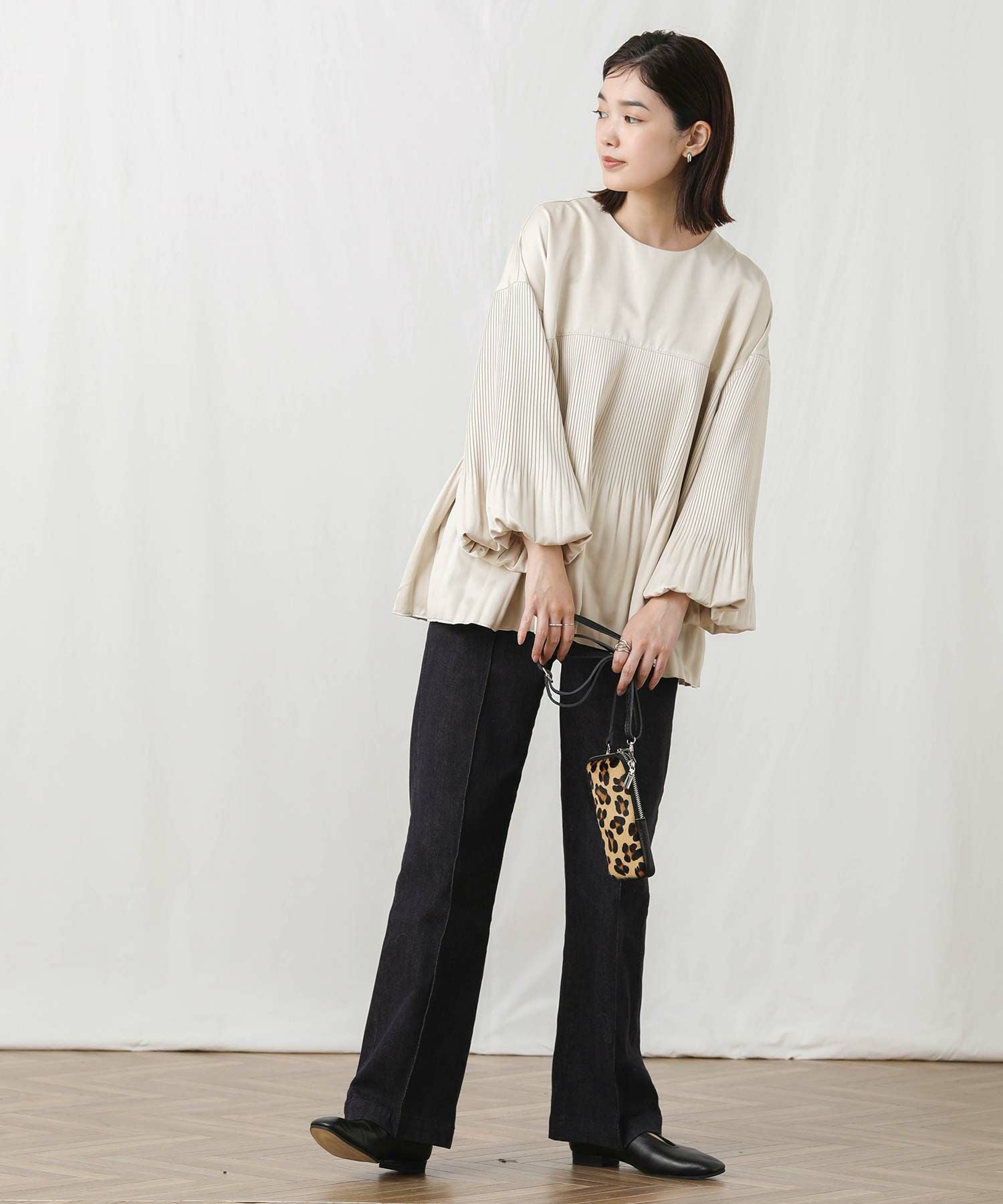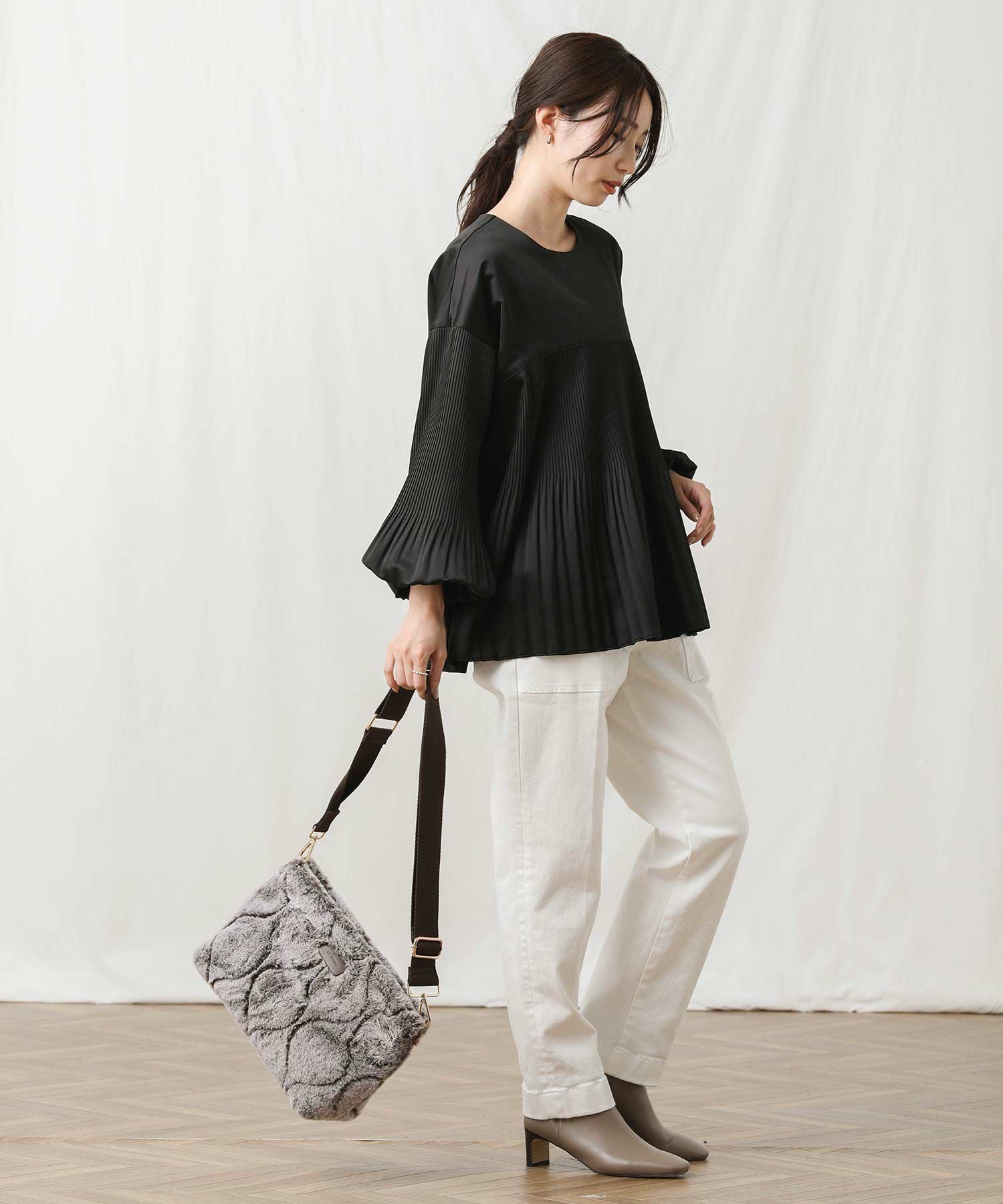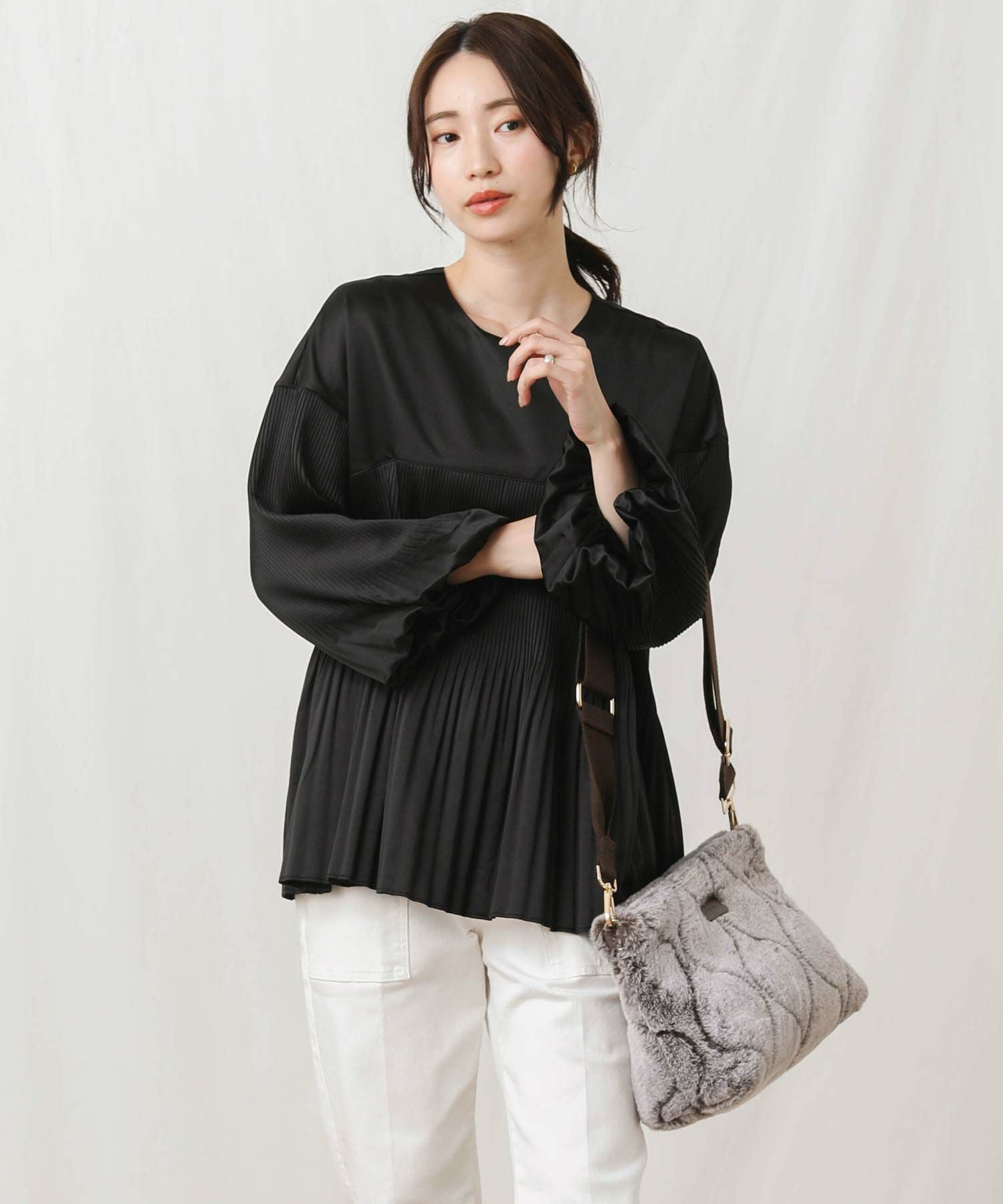 上品な光沢のあるサテン生地を使用。袖のボリューム感と裾の消しプリーツの動きがポイント。