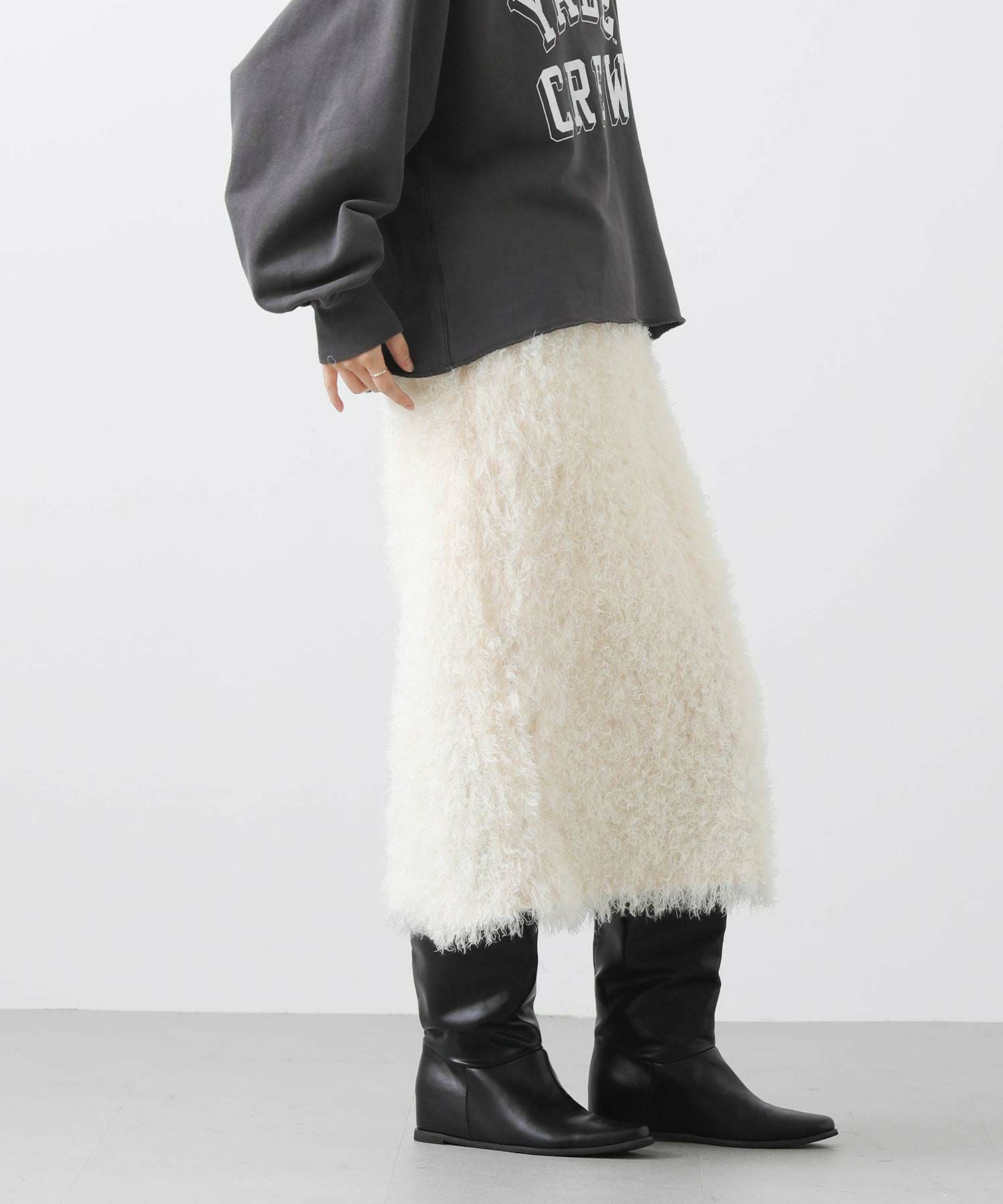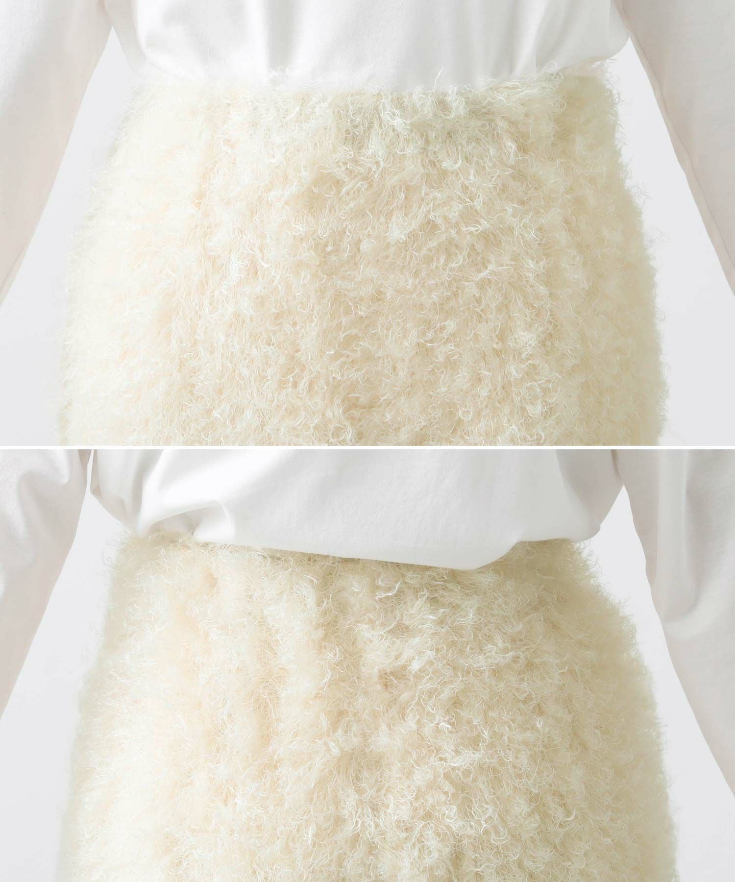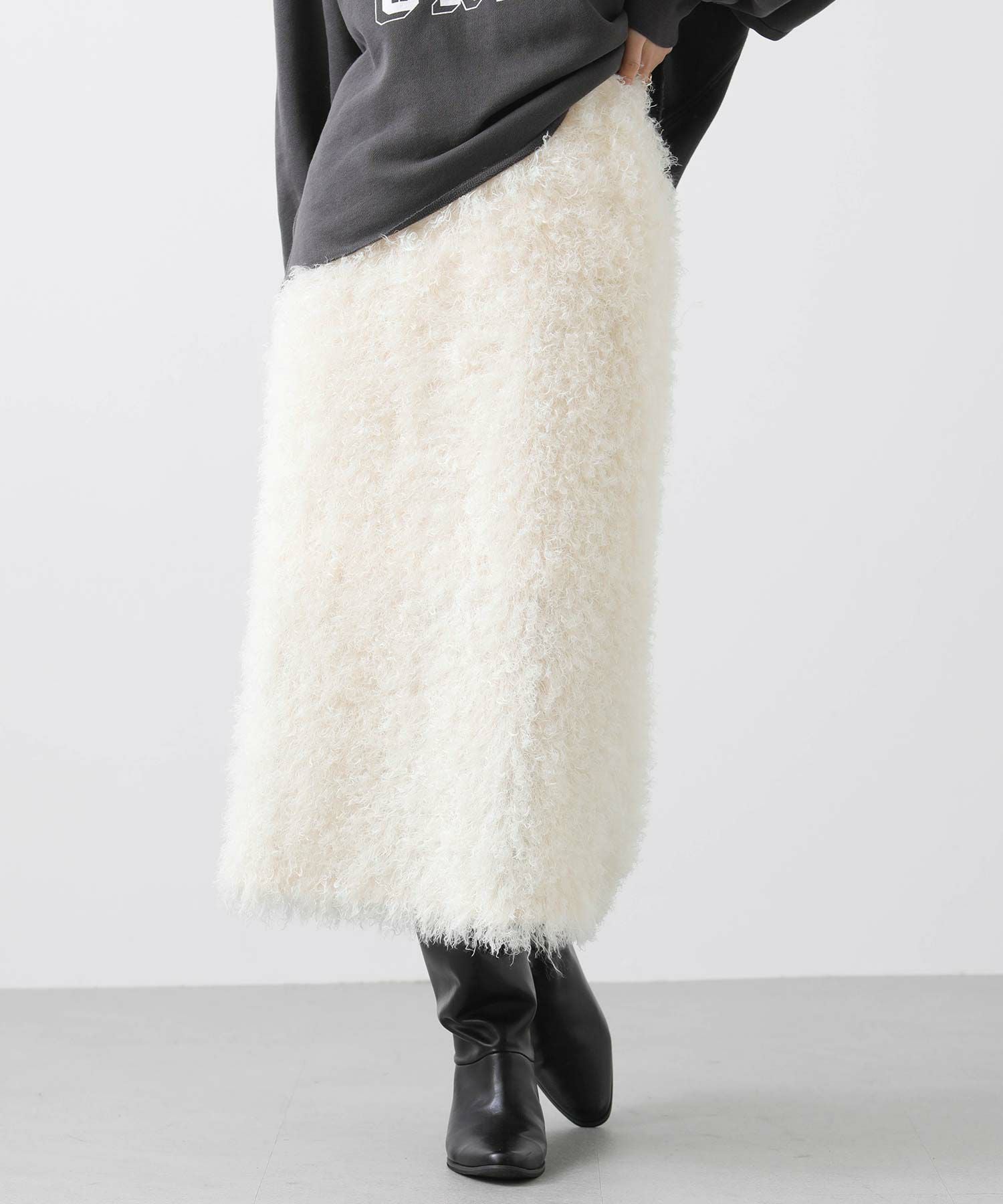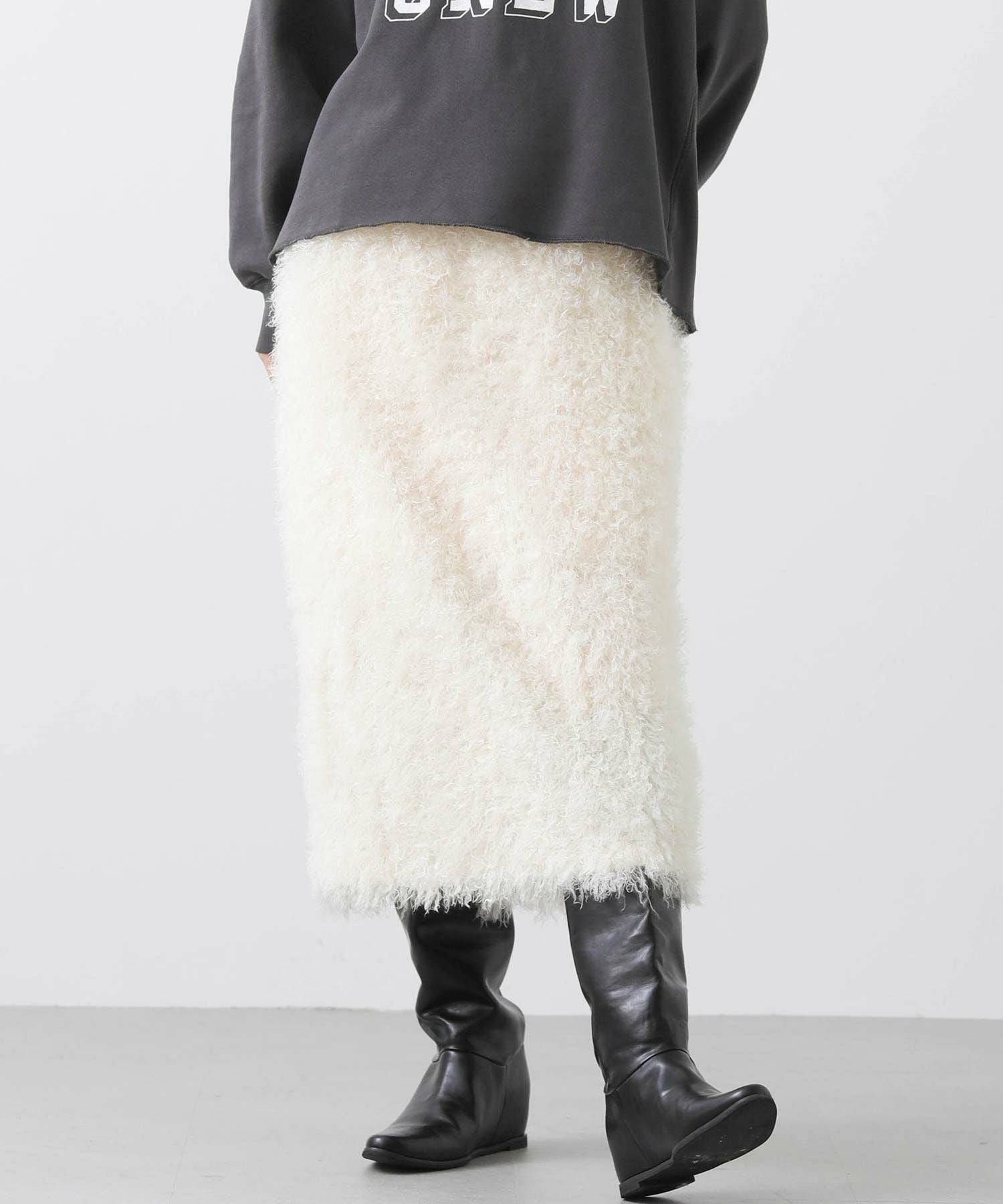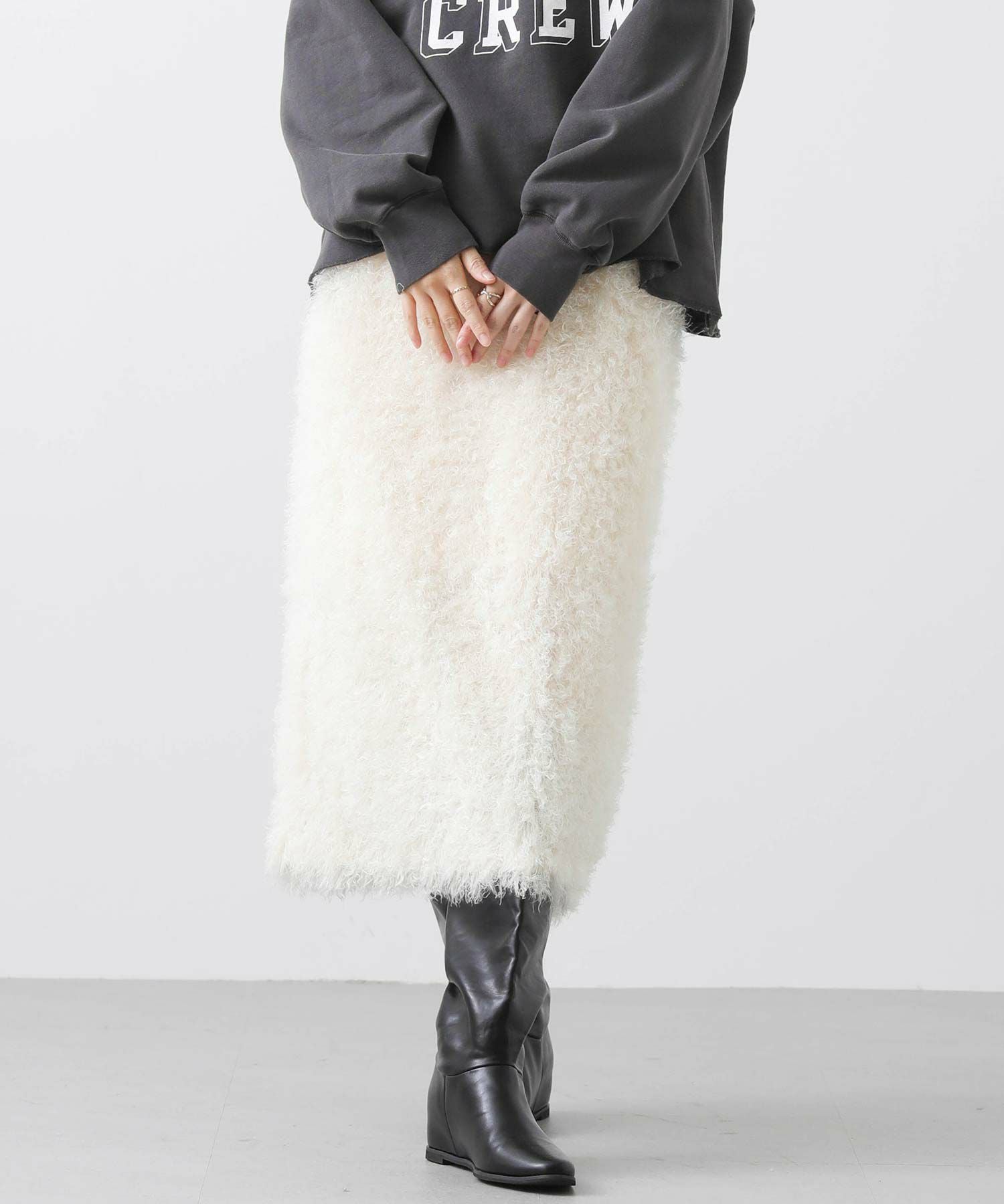 ファー素材が華やかなIラインスカート。カールした毛で表面感のある素材なので、着用するだけで目を惹くアイテムです。