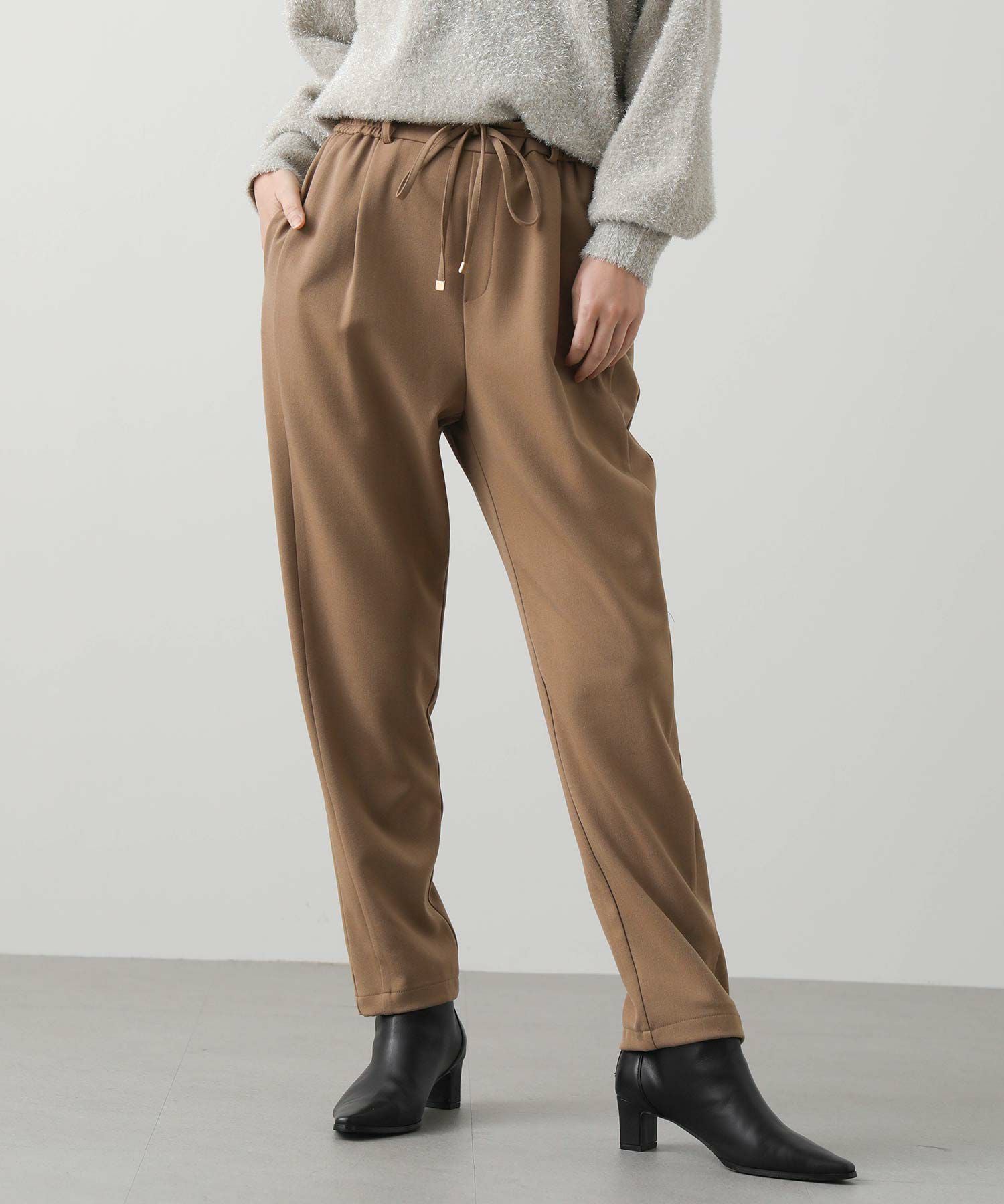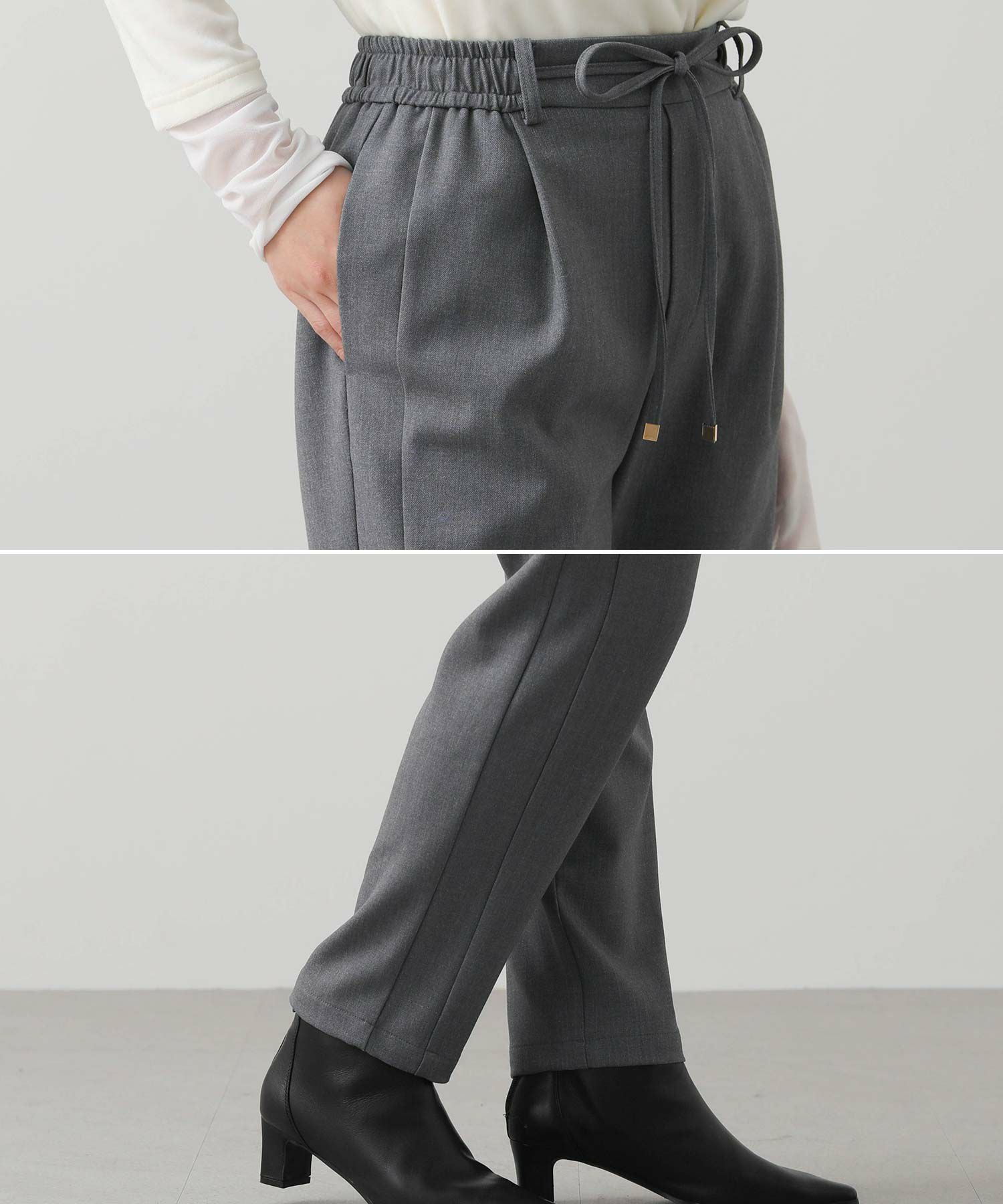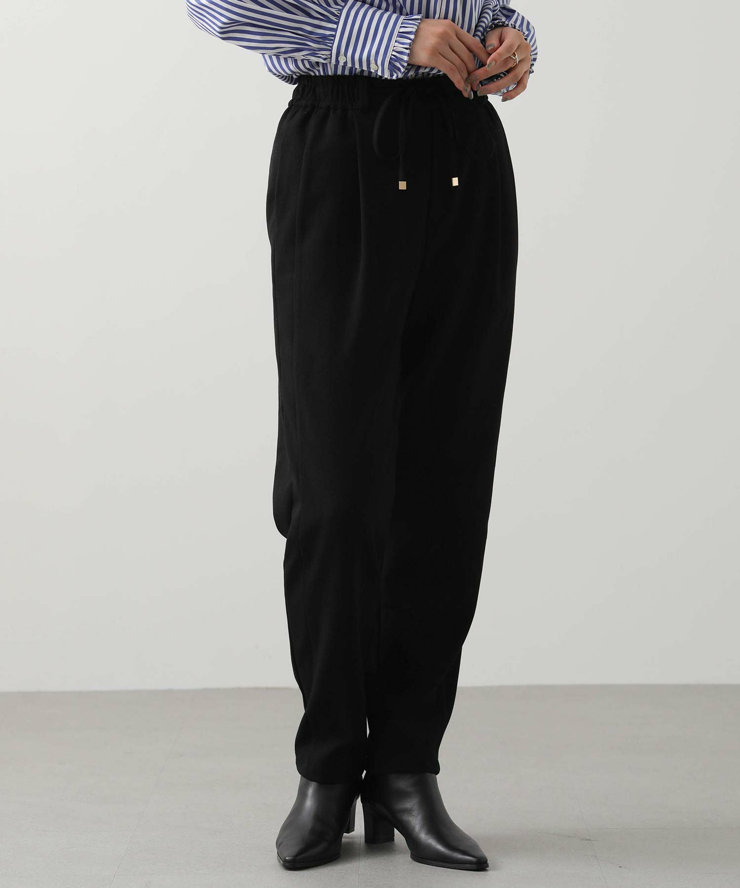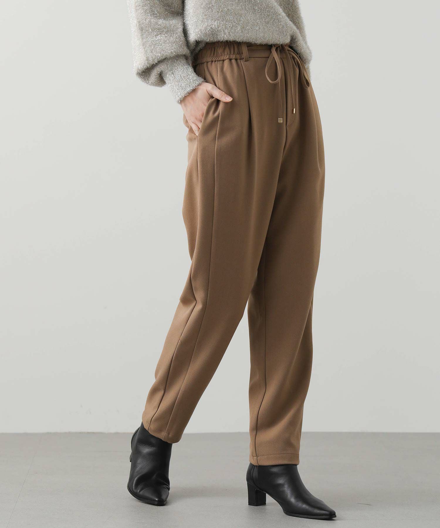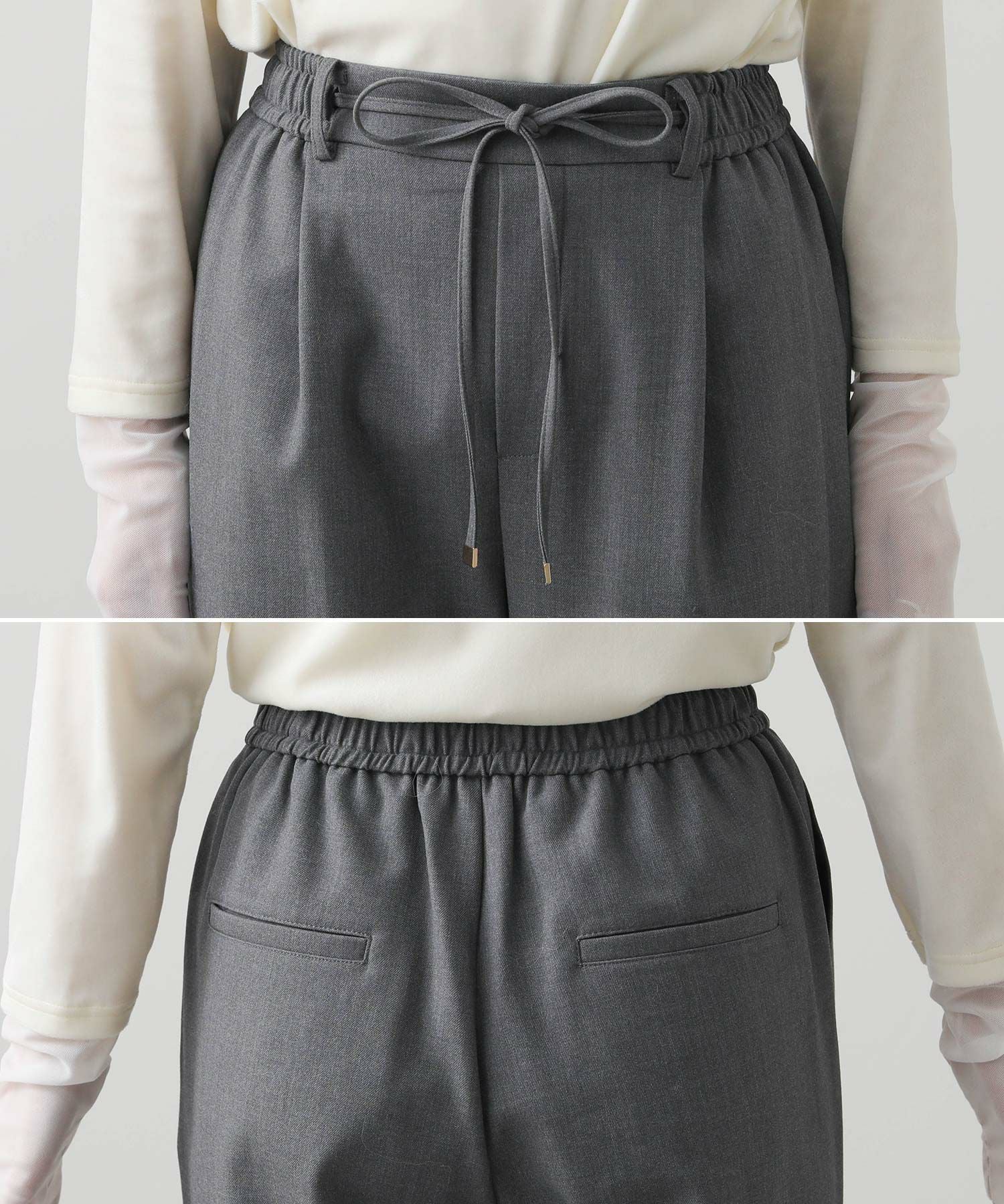 ウエストはゴム仕様で細紐ベルトは外側からも内側からも調整でき、先端にゴールド金具を施しカジュアル過ぎない印象に。オンオフ問わずに幅広いシーンで活躍してくれます。