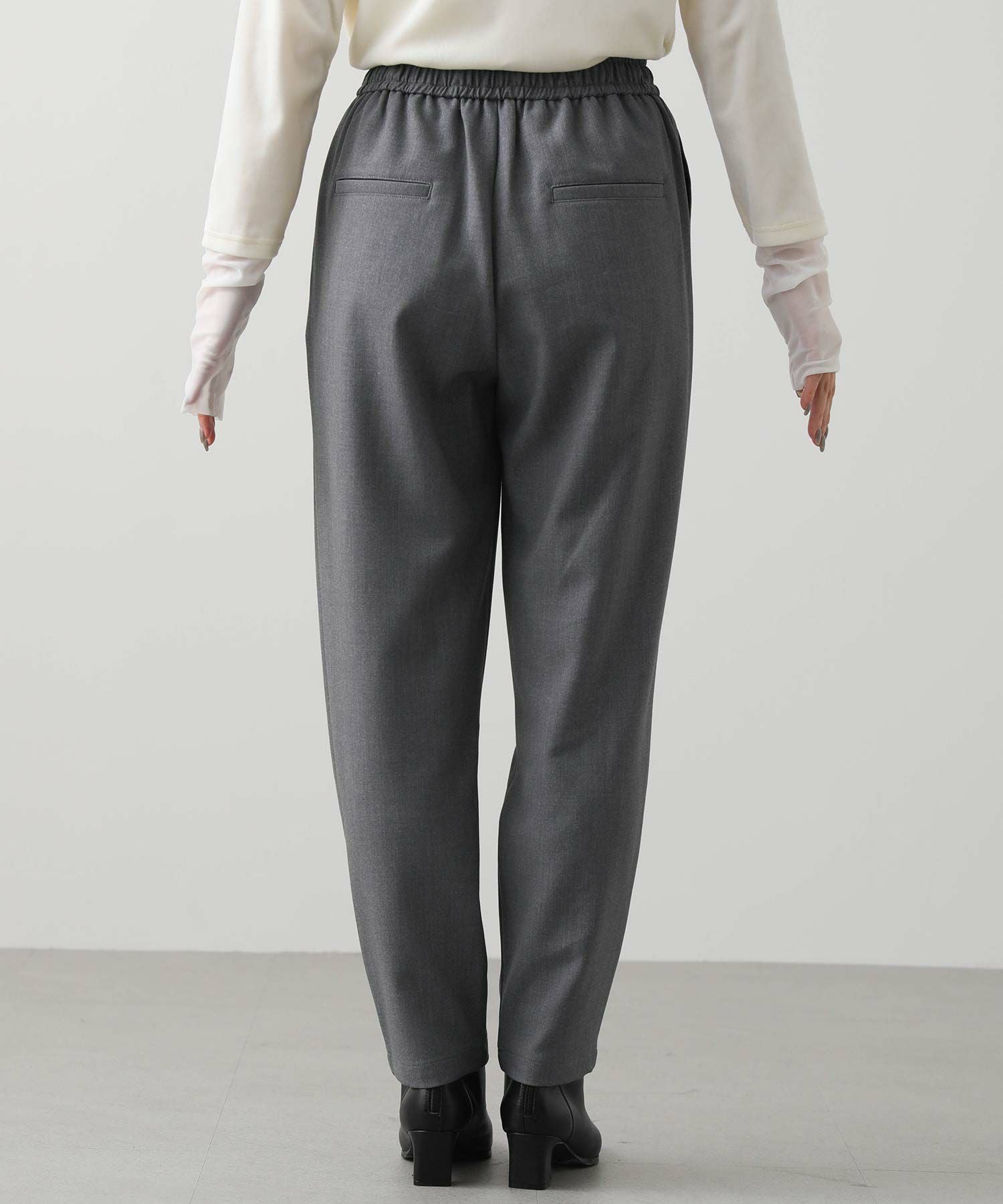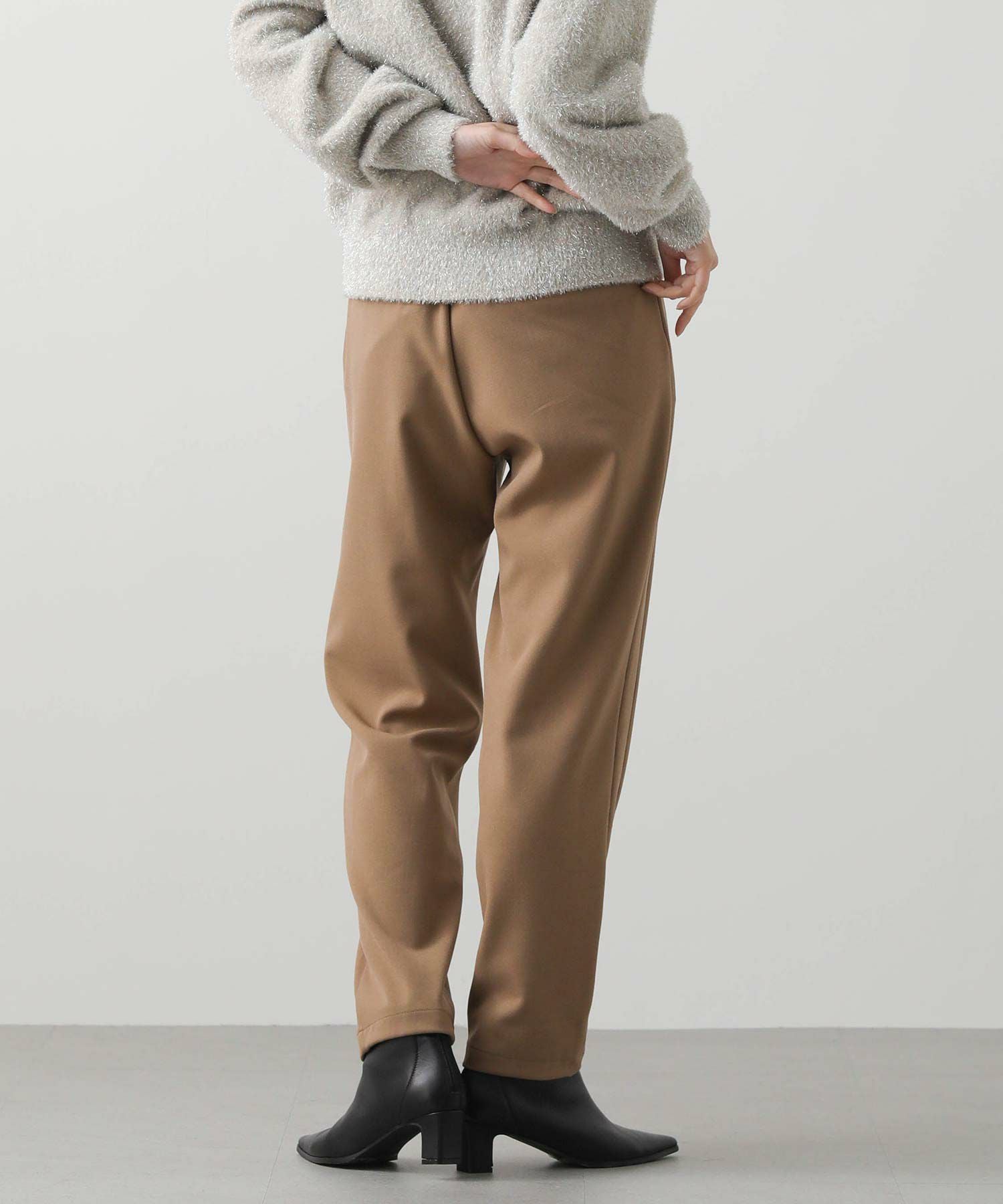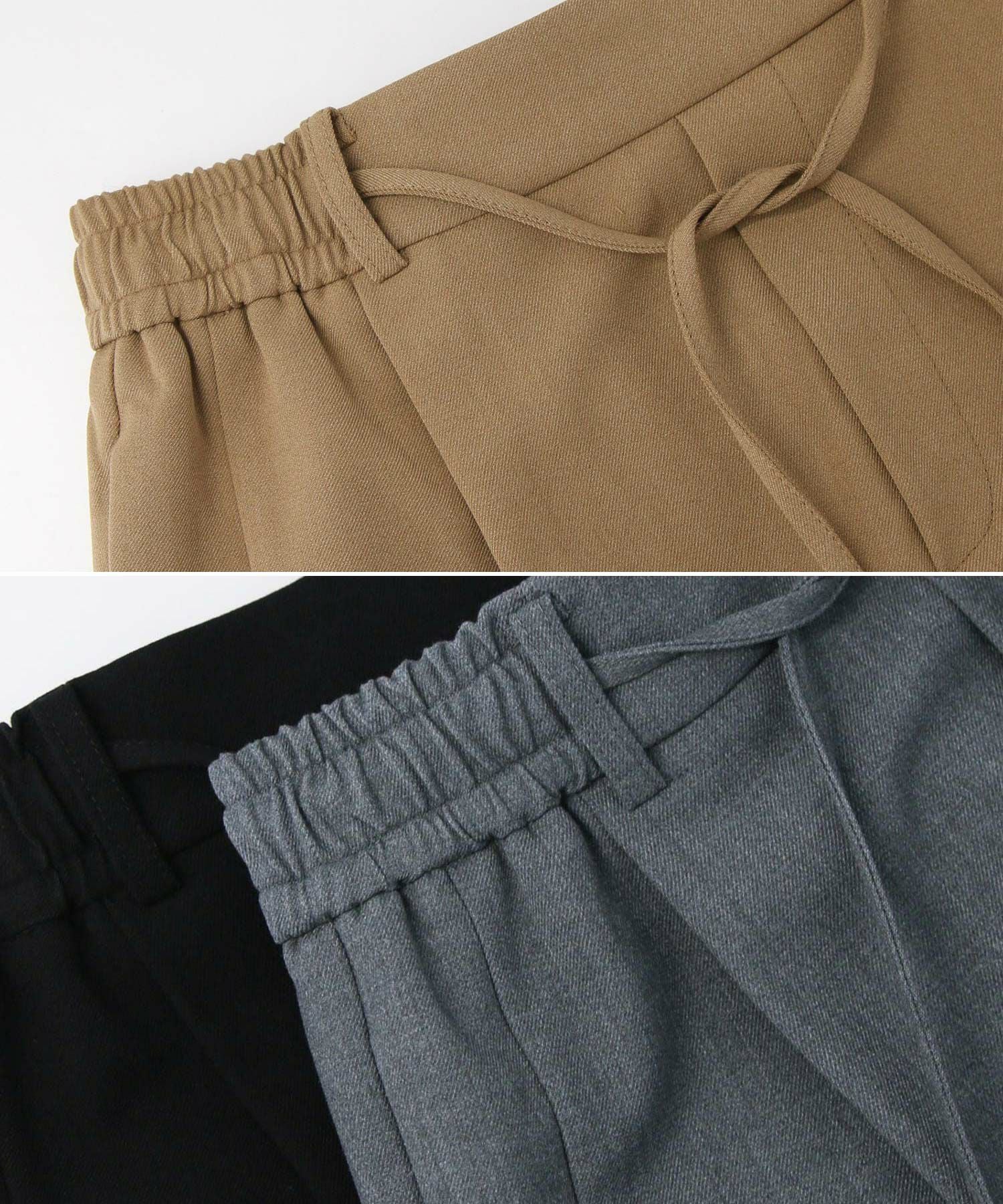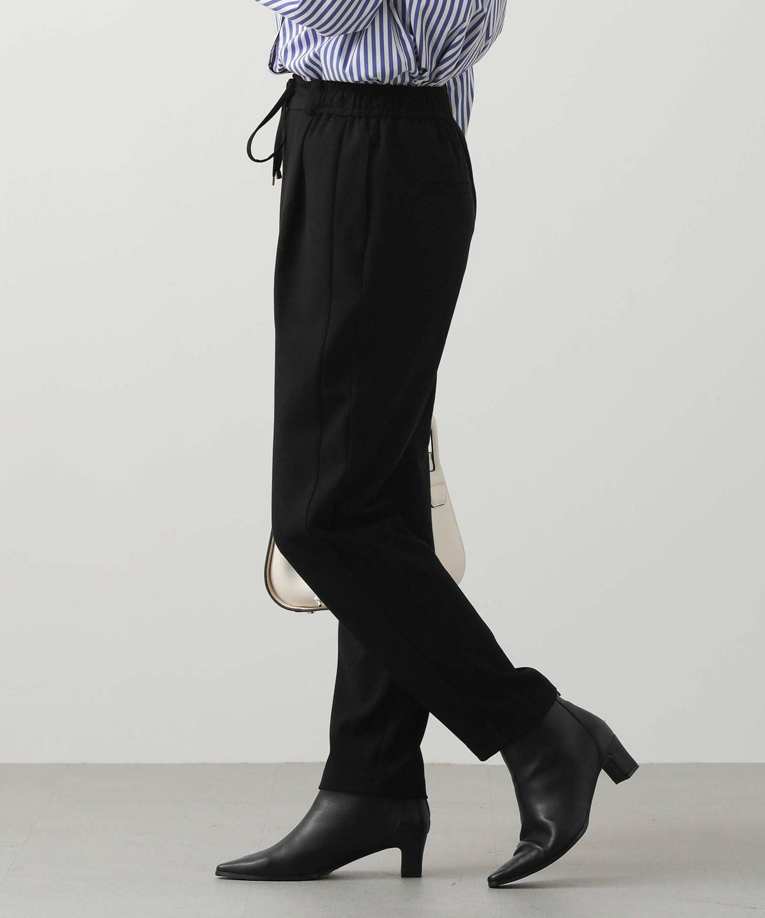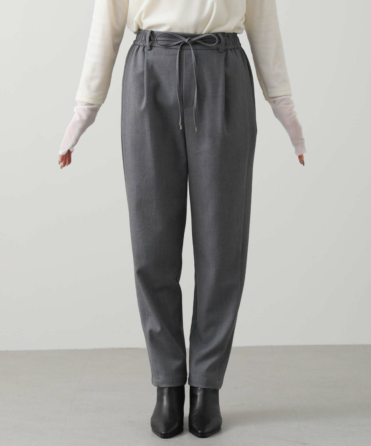 ウエストはゴム仕様で細紐ベルトは外側からも内側からも調整でき、先端にゴールド金具を施しカジュアル過ぎない印象に。オンオフ問わずに幅広いシーンで活躍してくれます。