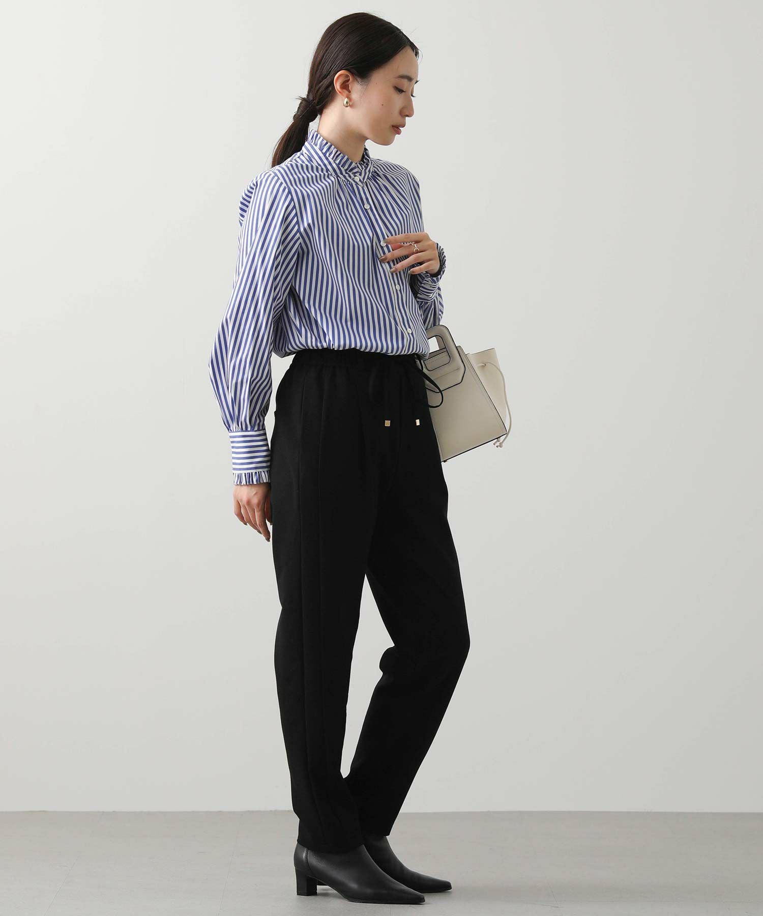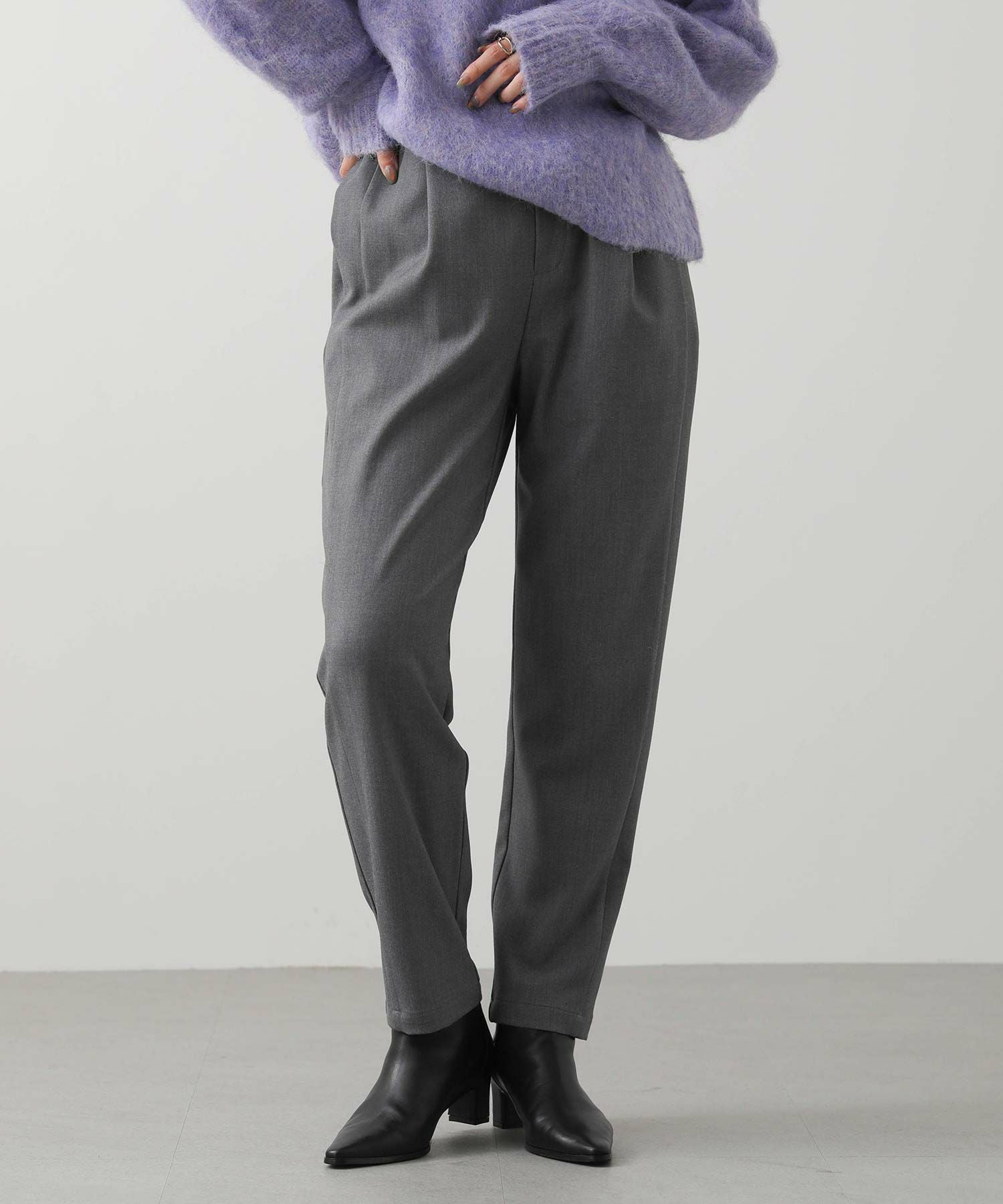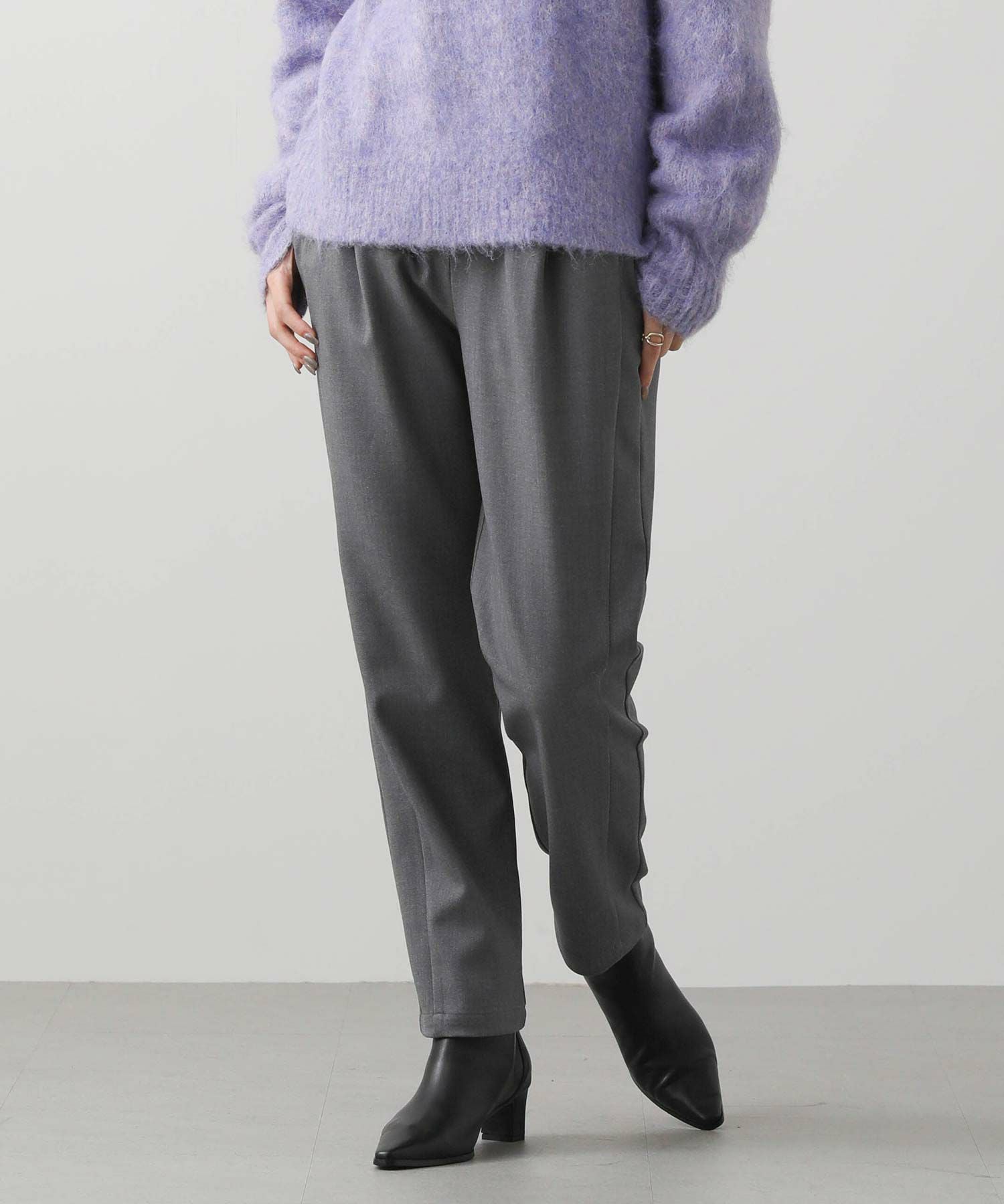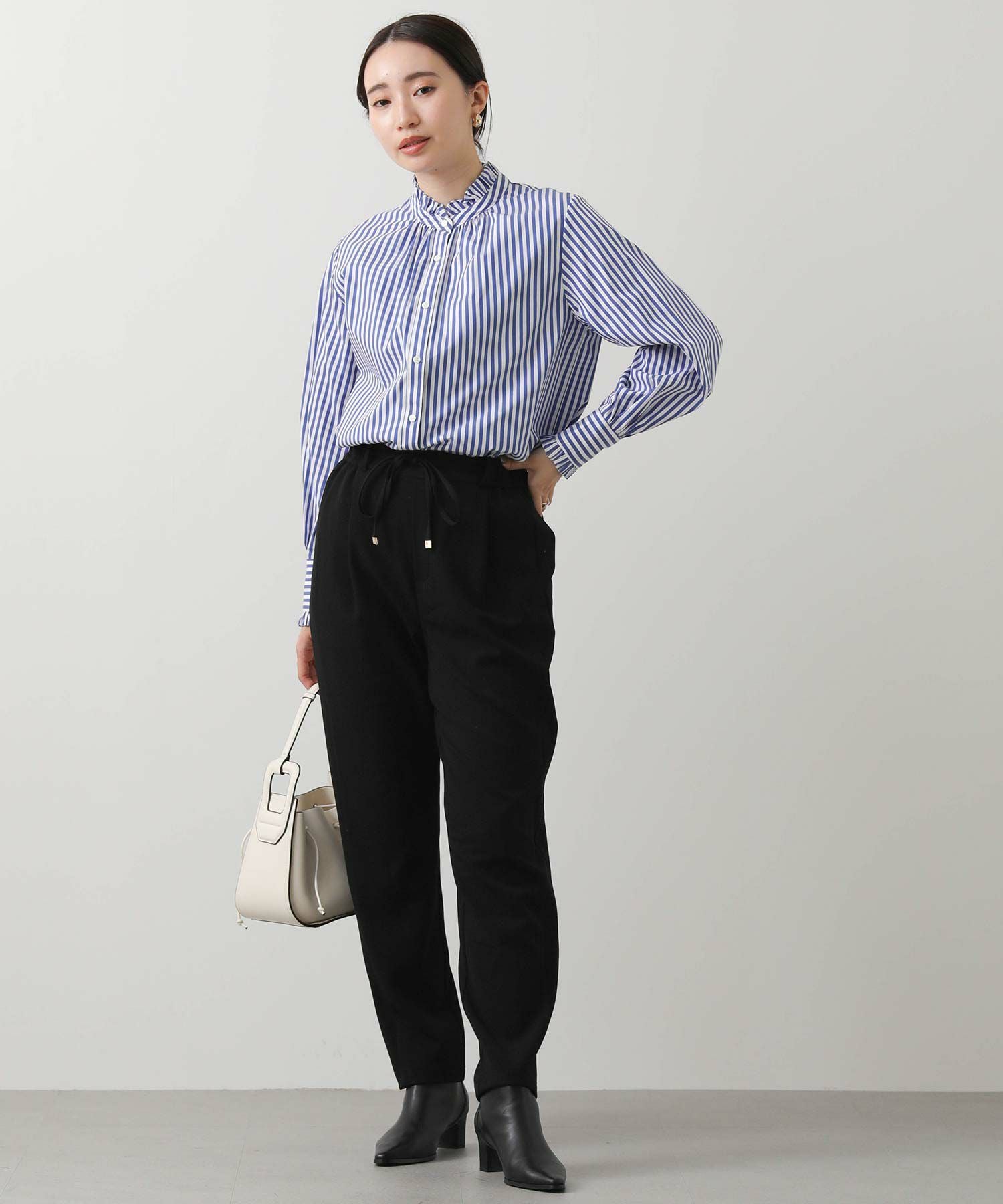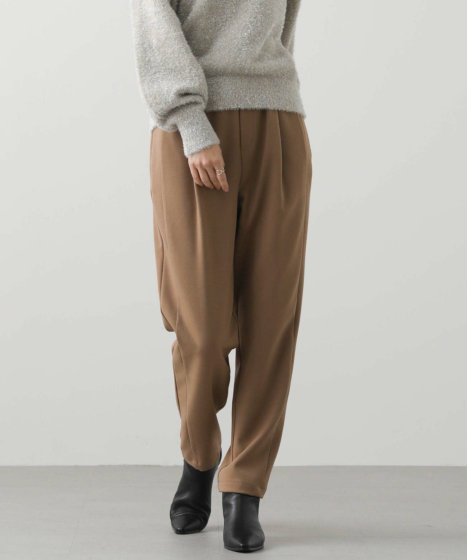 ウエストはゴム仕様で細紐ベルトは外側からも内側からも調整でき、先端にゴールド金具を施しカジュアル過ぎない印象に。オンオフ問わずに幅広いシーンで活躍してくれます。