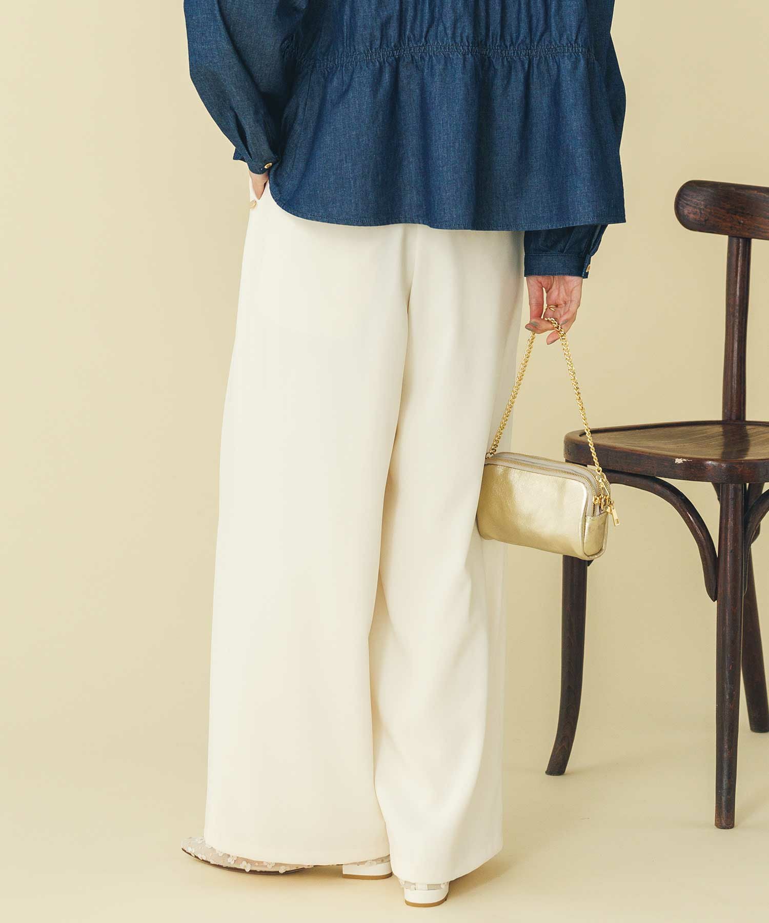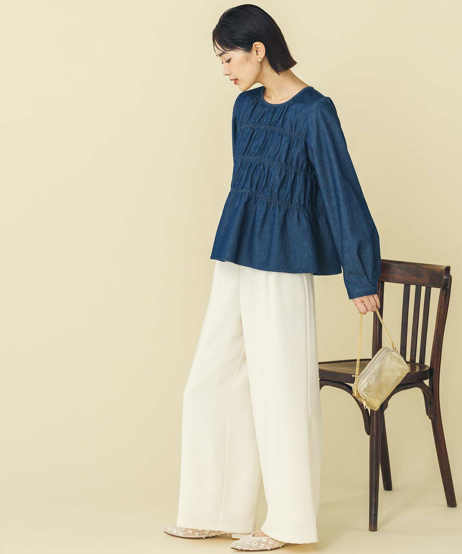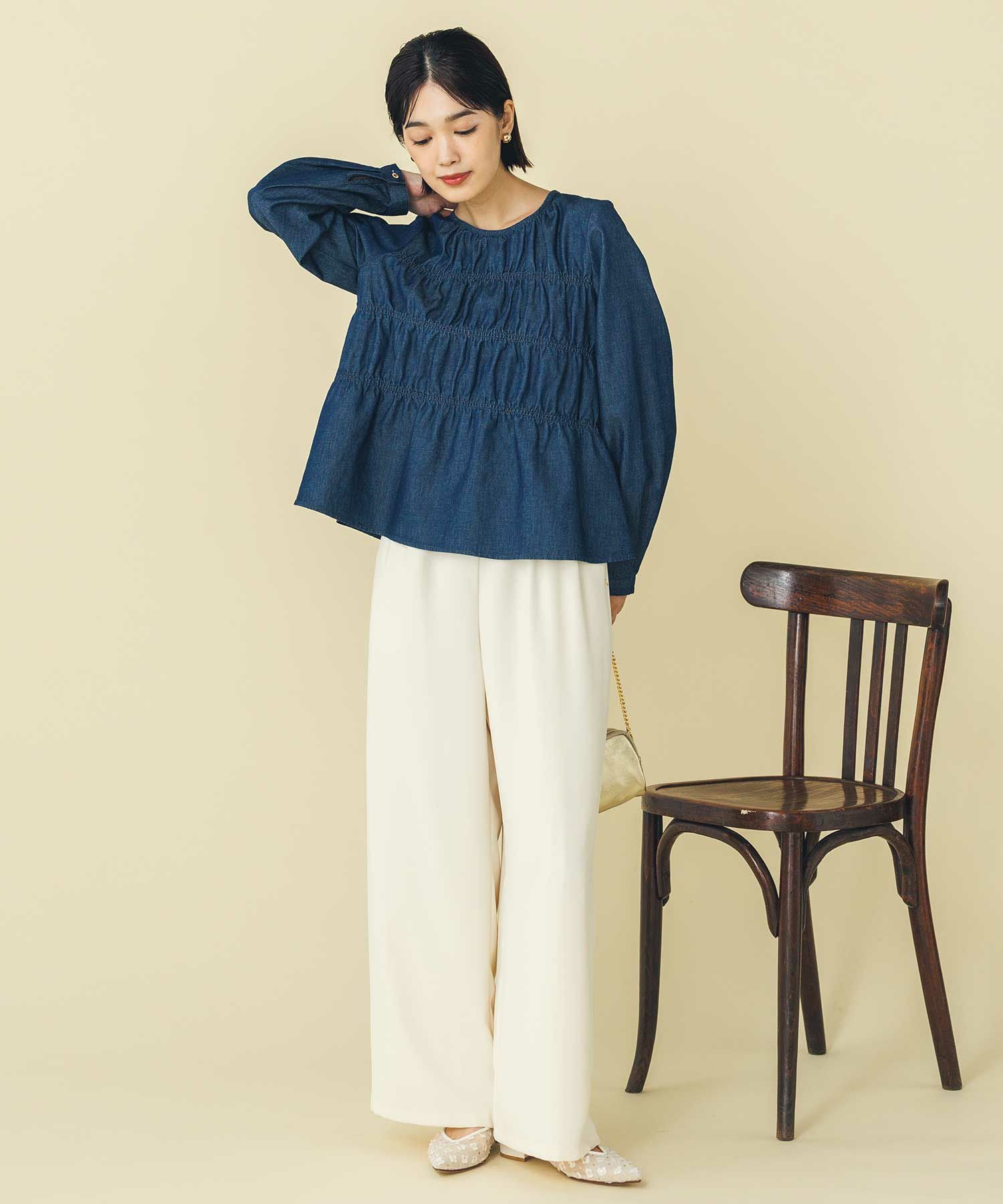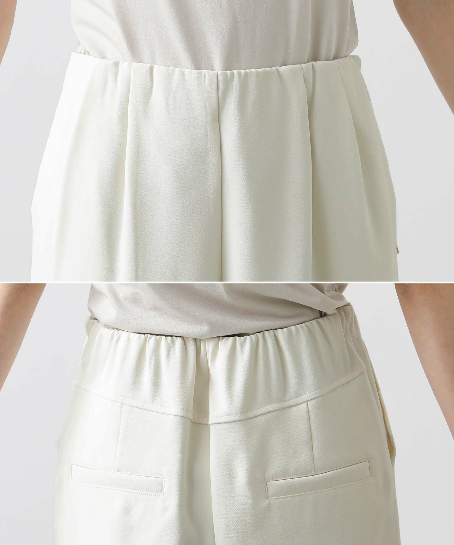 ふっくらとしたふくらみが高級感があり、絶妙な落ち感とハリ感で身体のラインをカバーしてくれる合繊素材を使用。シワが気になりにくいのも嬉しい。