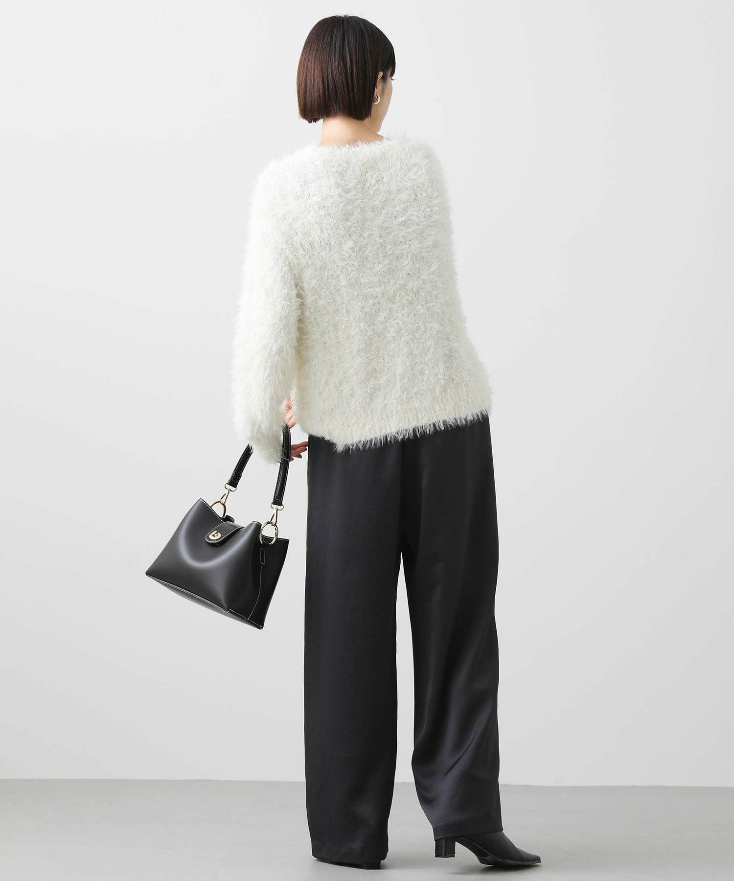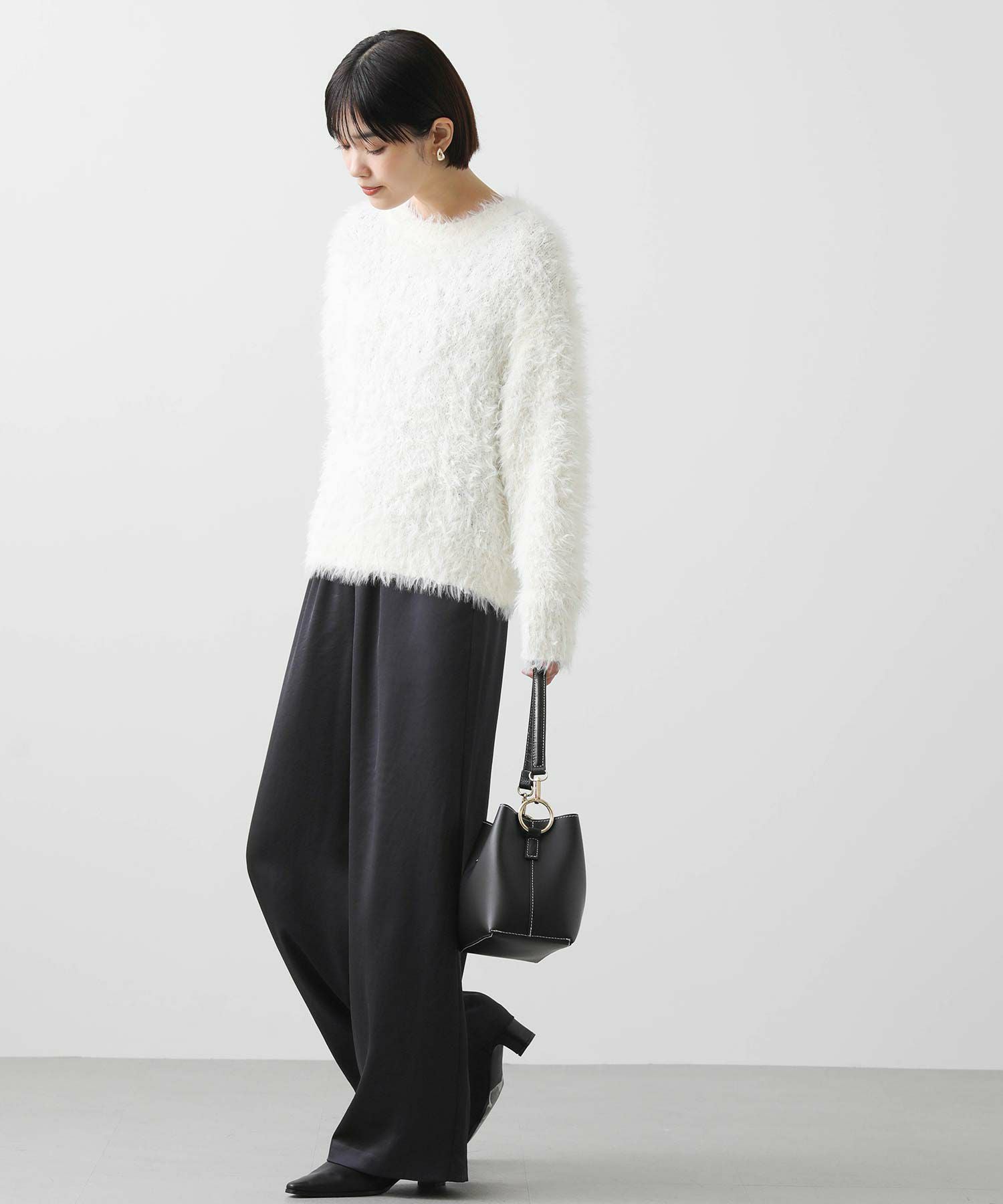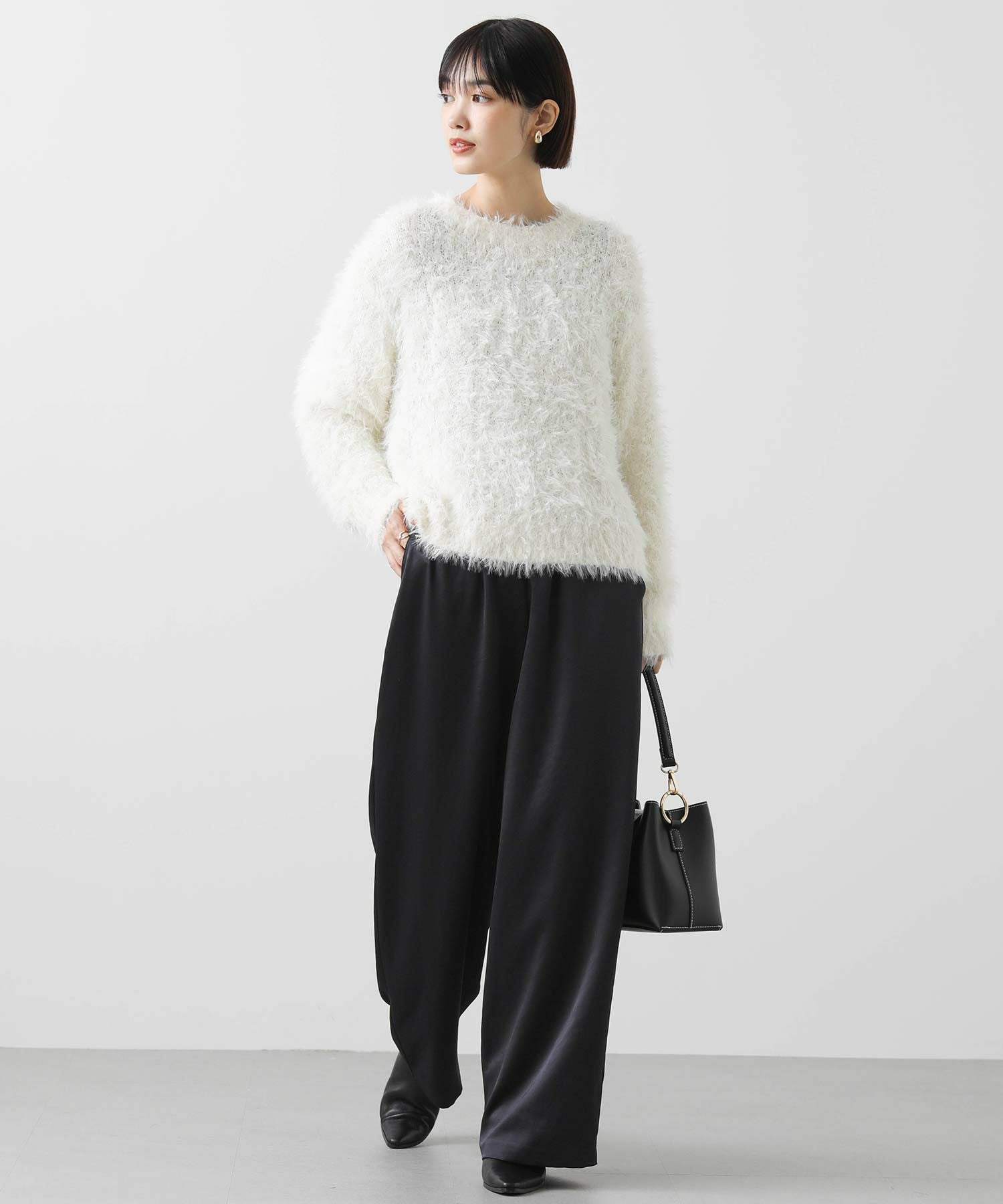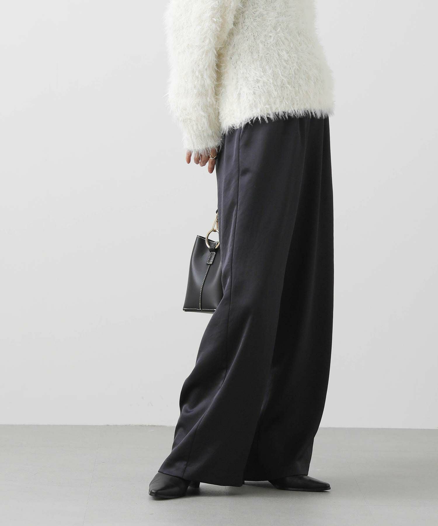 スタイリング次第でエレガントにもカジュアルにも対応する万能な1本。特にニットのゆるふわな表情との組み合わせが相性◎なおすすめコーデ。これからの時季の着まわしアイテムとして重宝するパンツです。