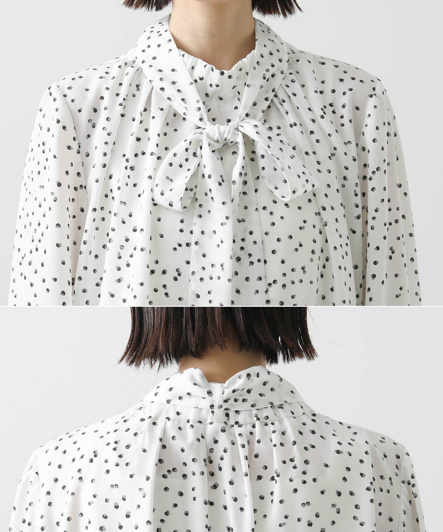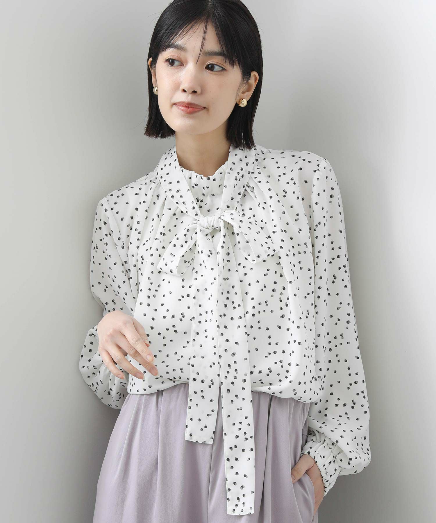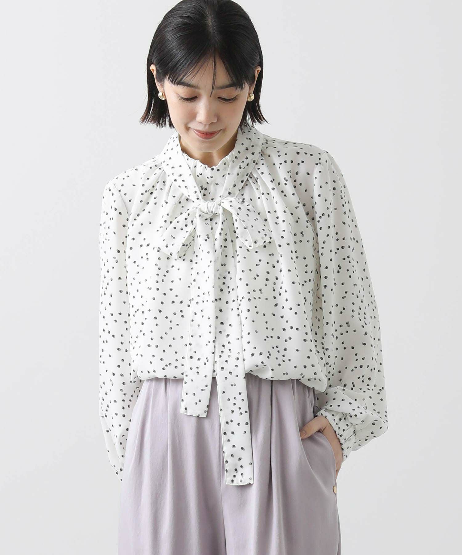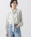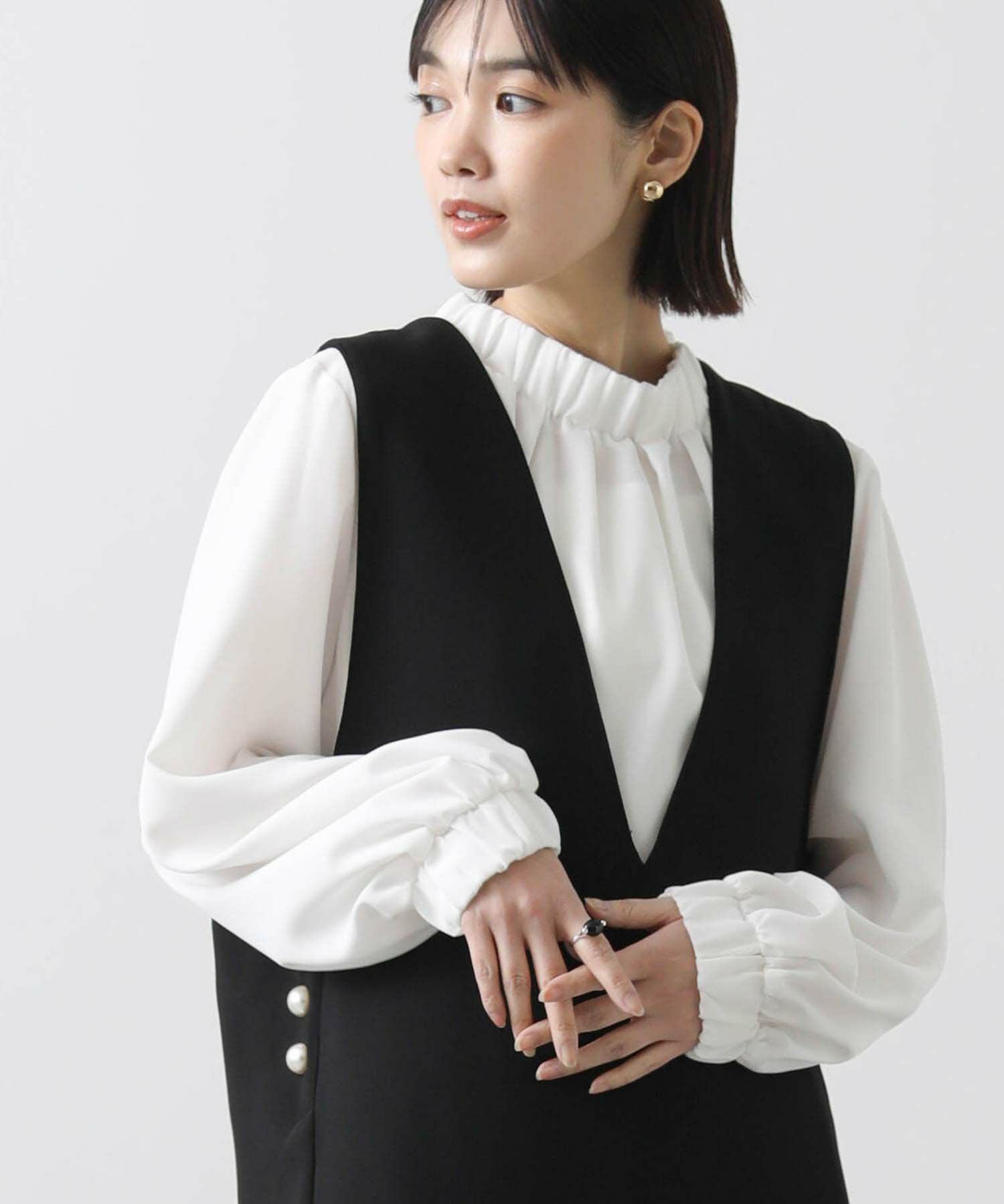 衿元のギャザー&タックデザインが顔回りを華やかに見せてくれるブラウス。