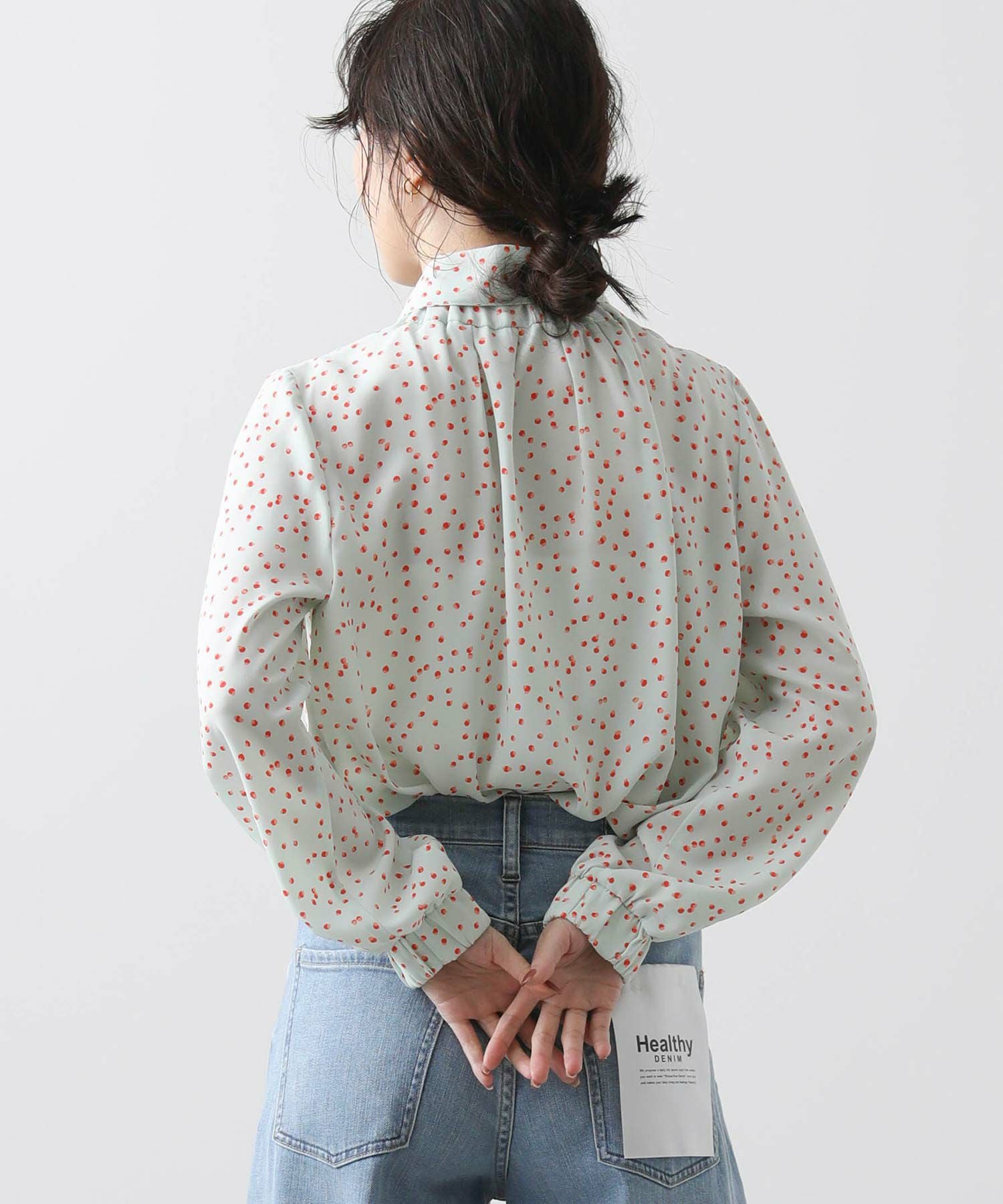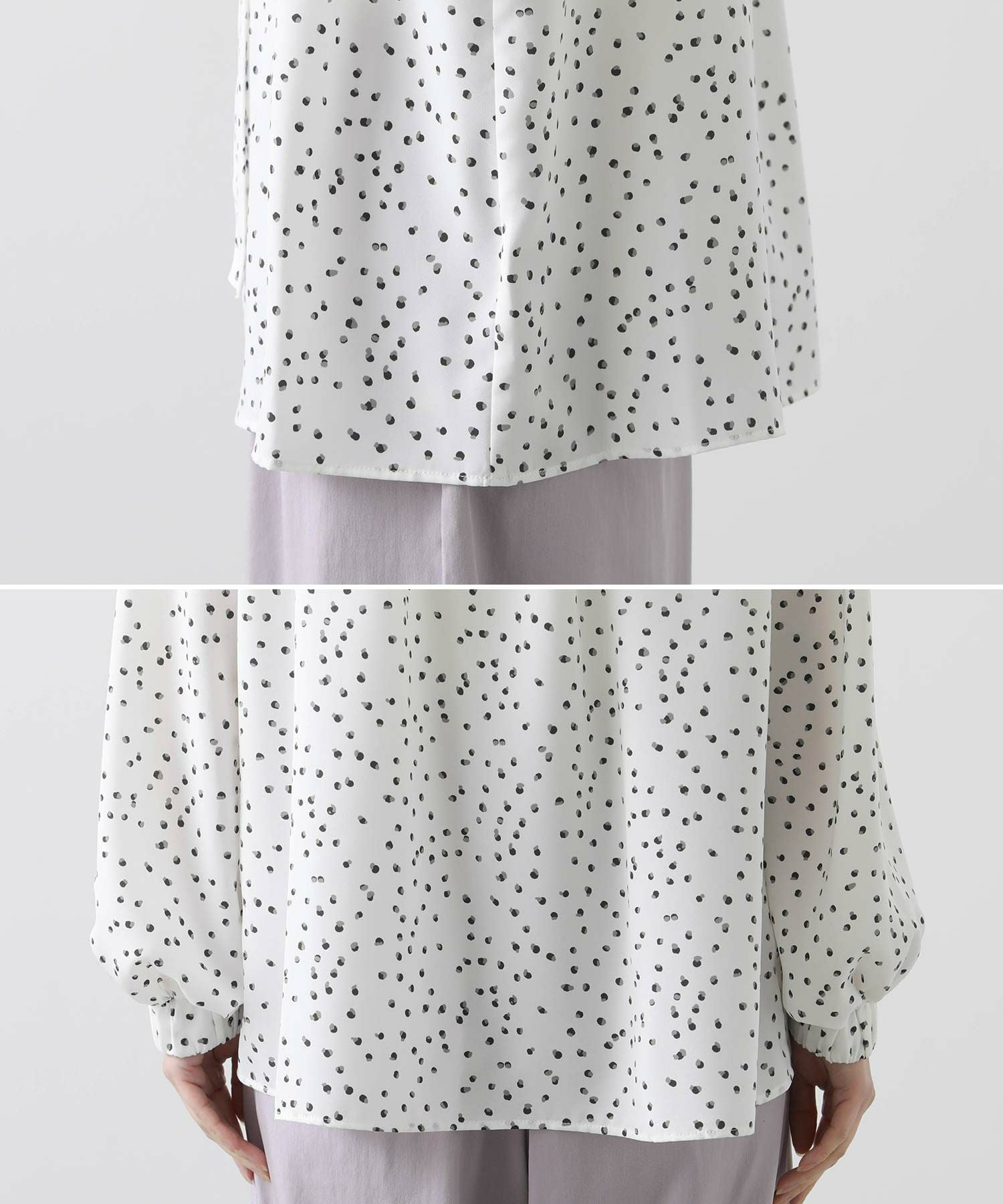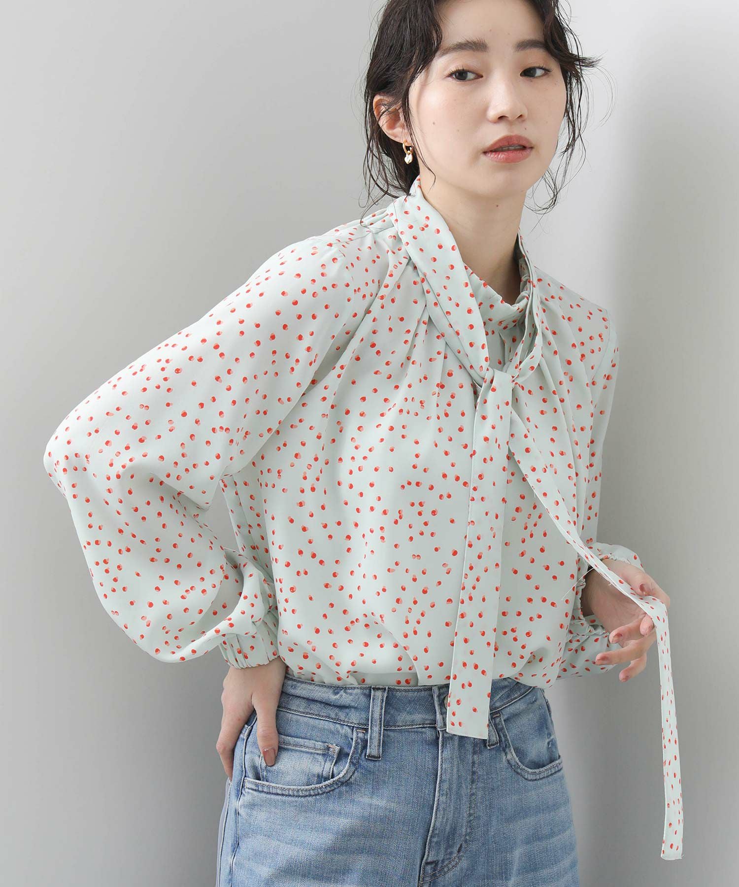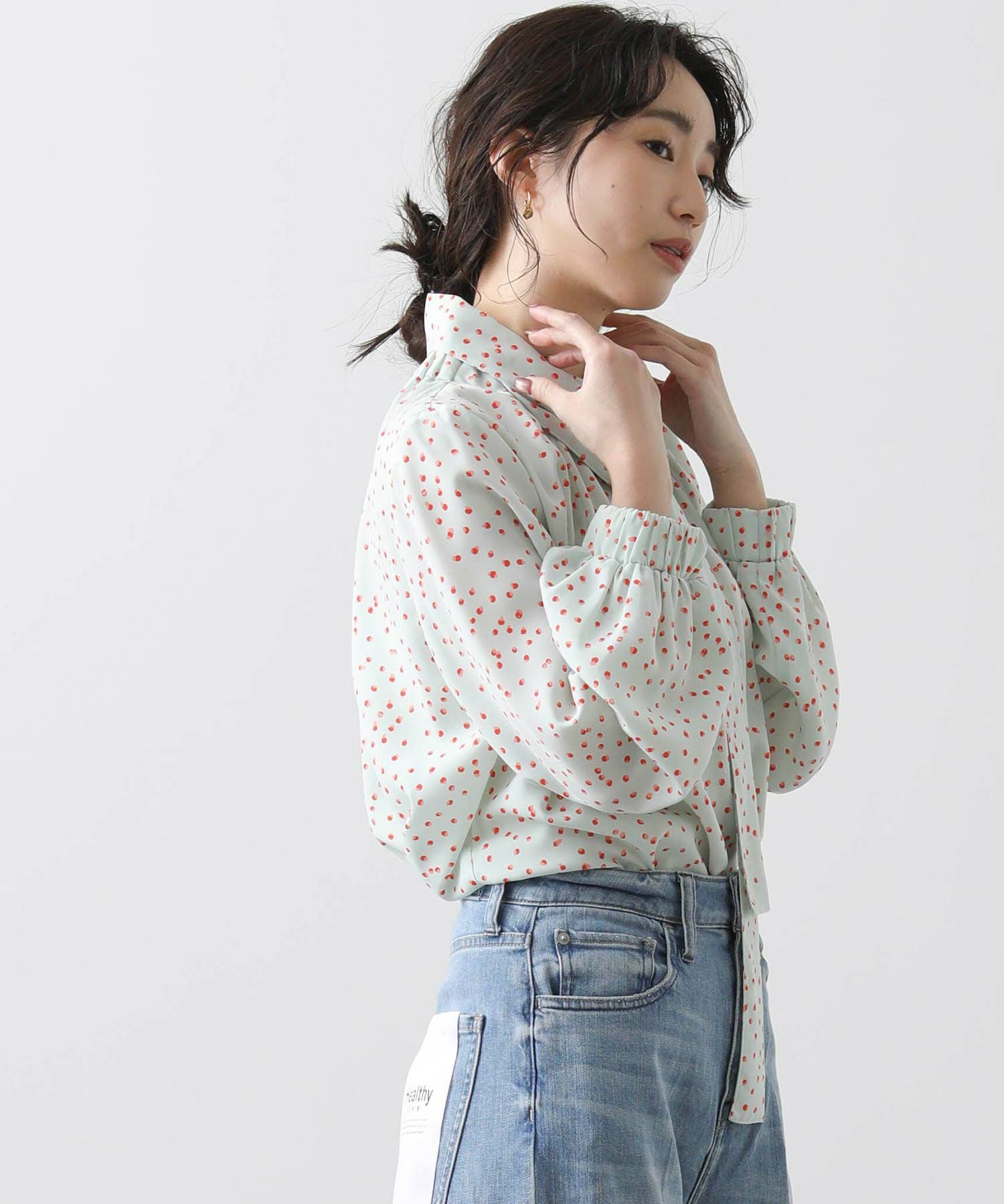 衿元のギャザー&タックデザインが顔回りを華やかに見せてくれるブラウス。