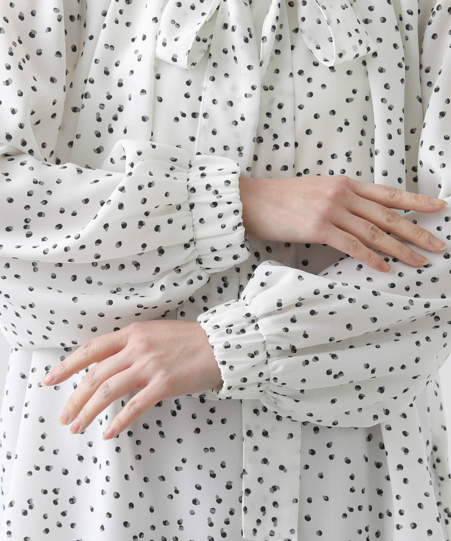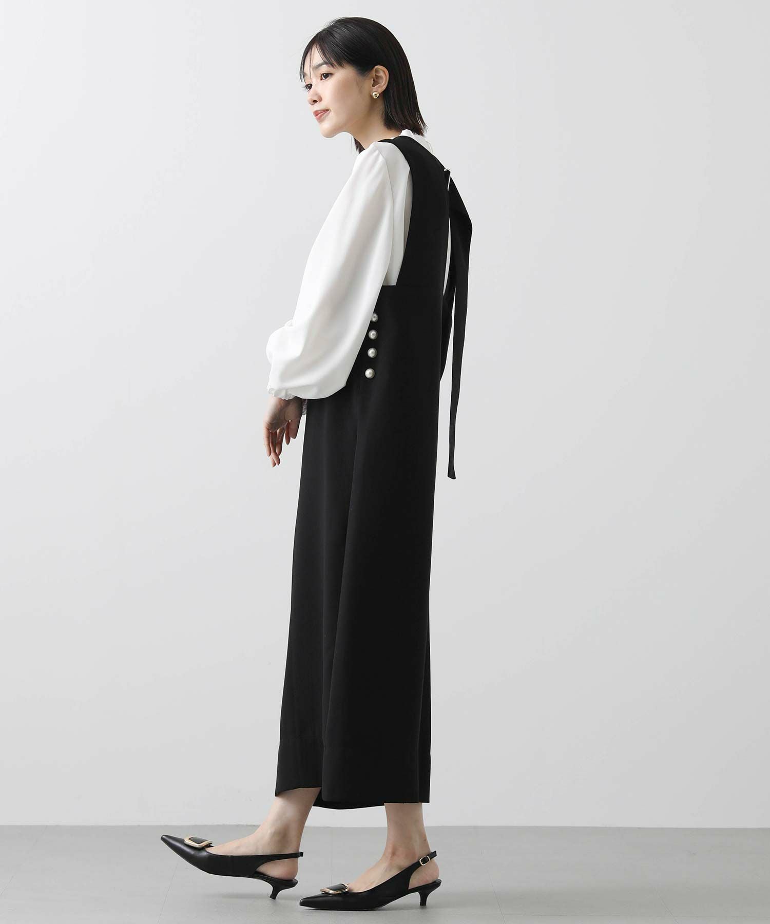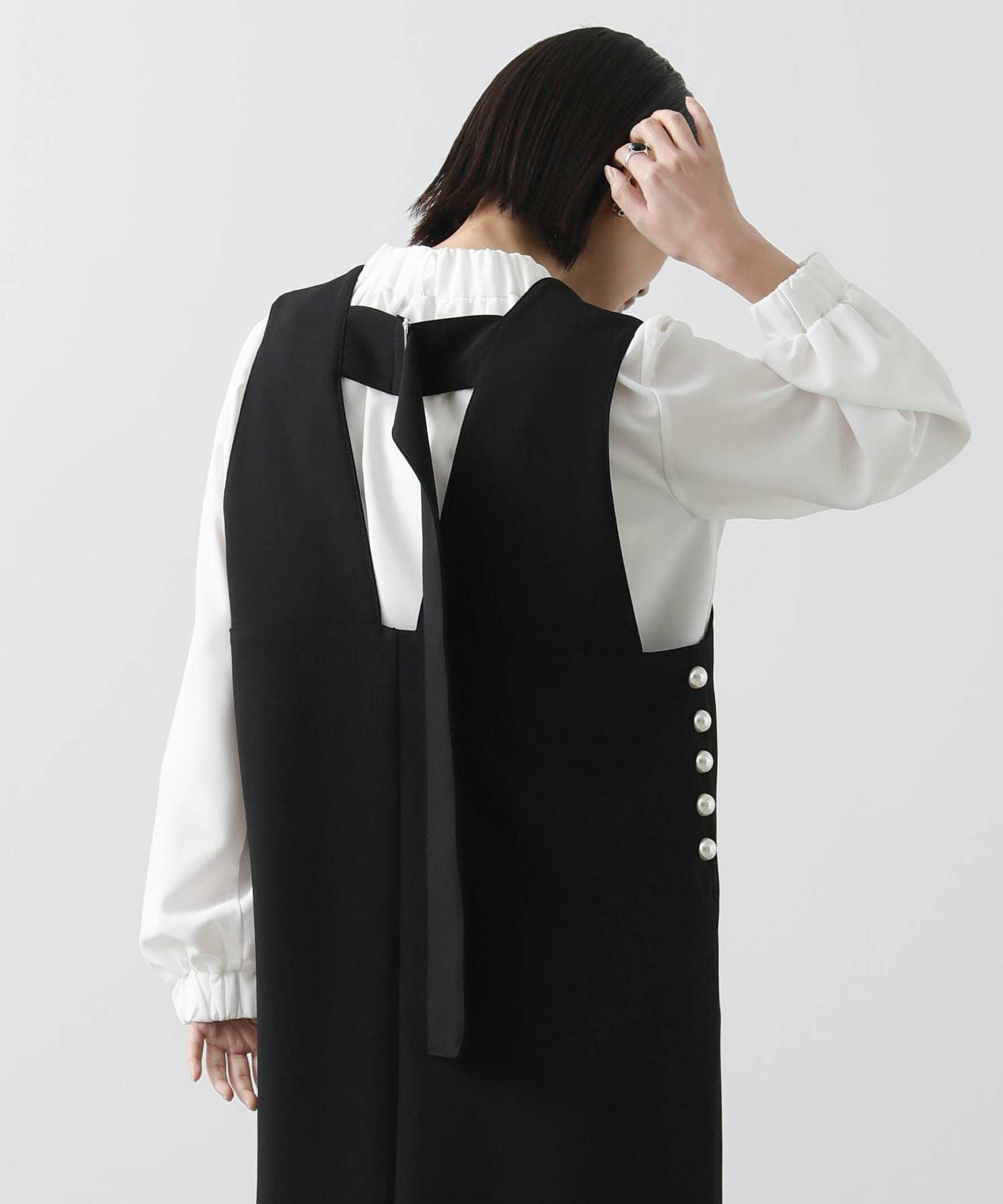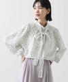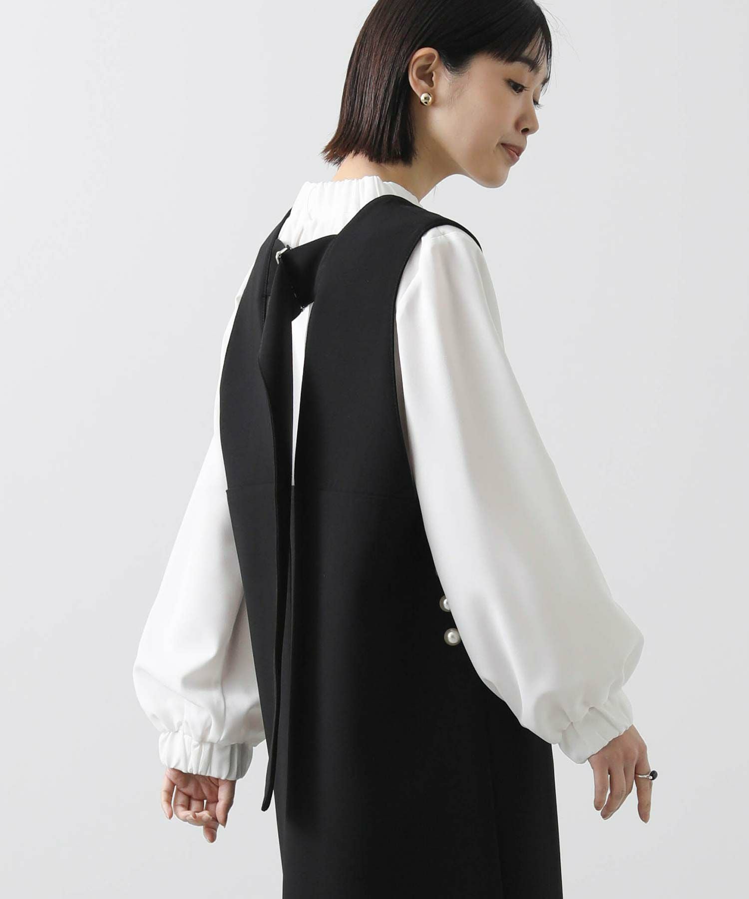 身頃前後にたっぷりと分量をとっており、幅広い体形の方に着ていただきやすいサイジングになっています。取り外し可能なリボンタイ付き。