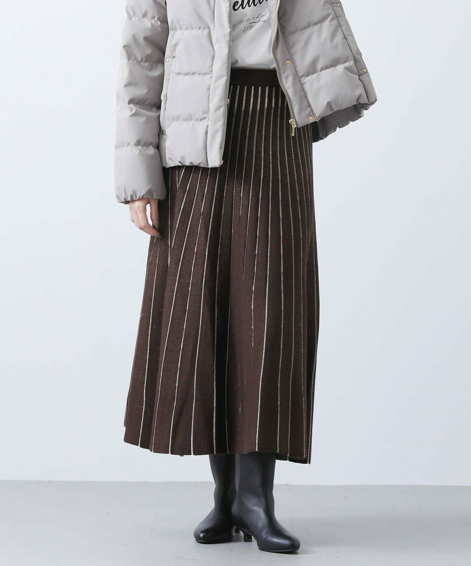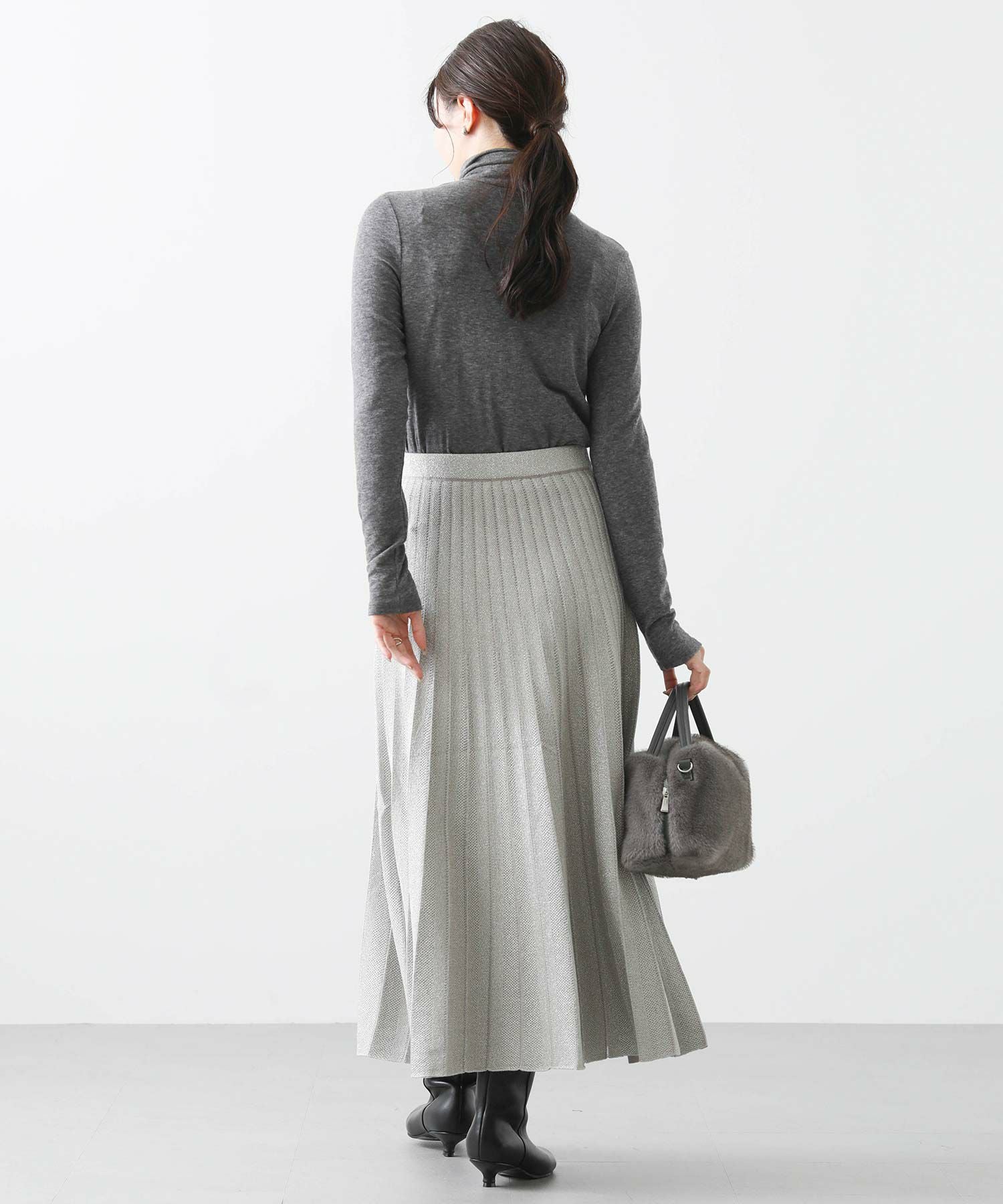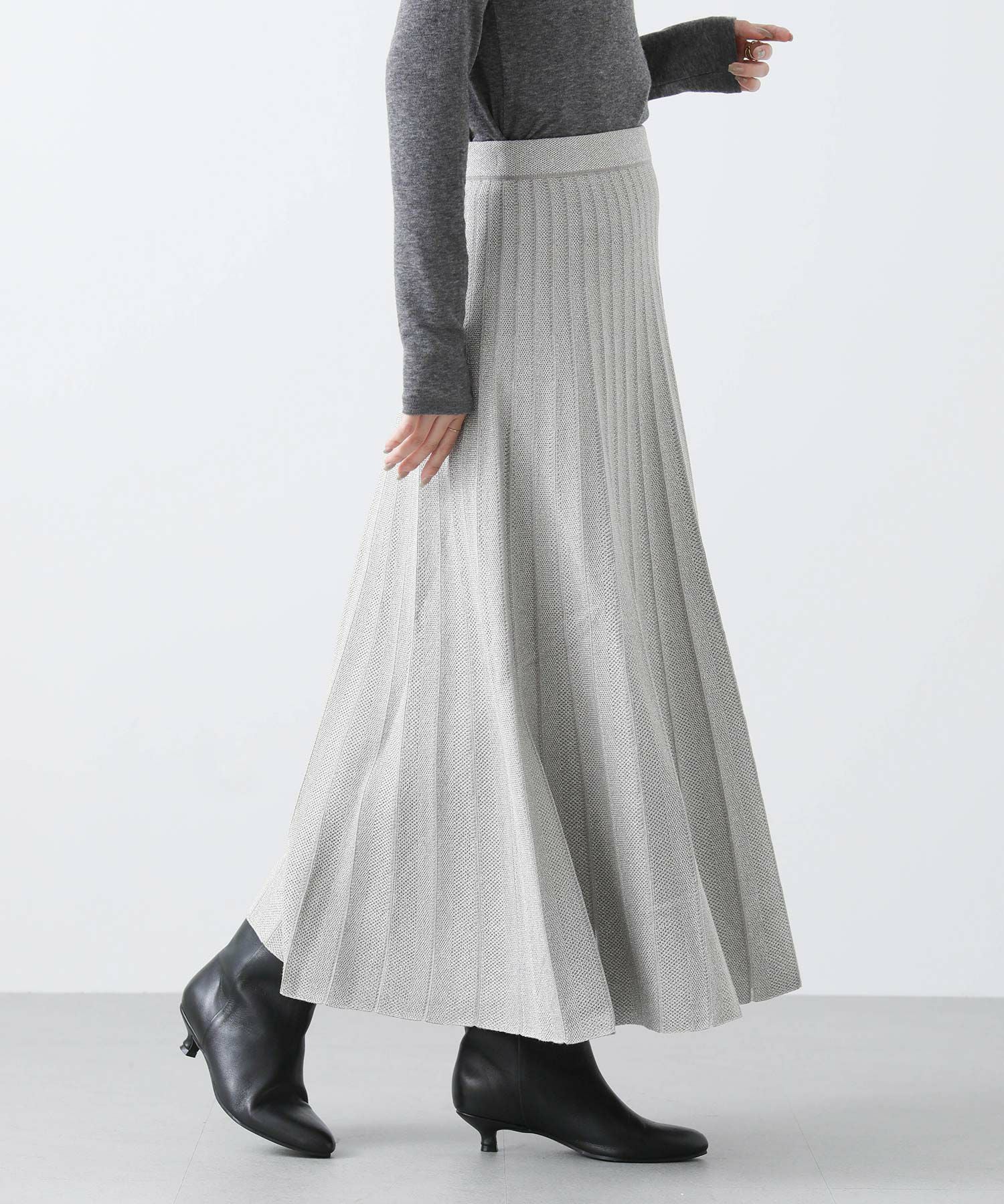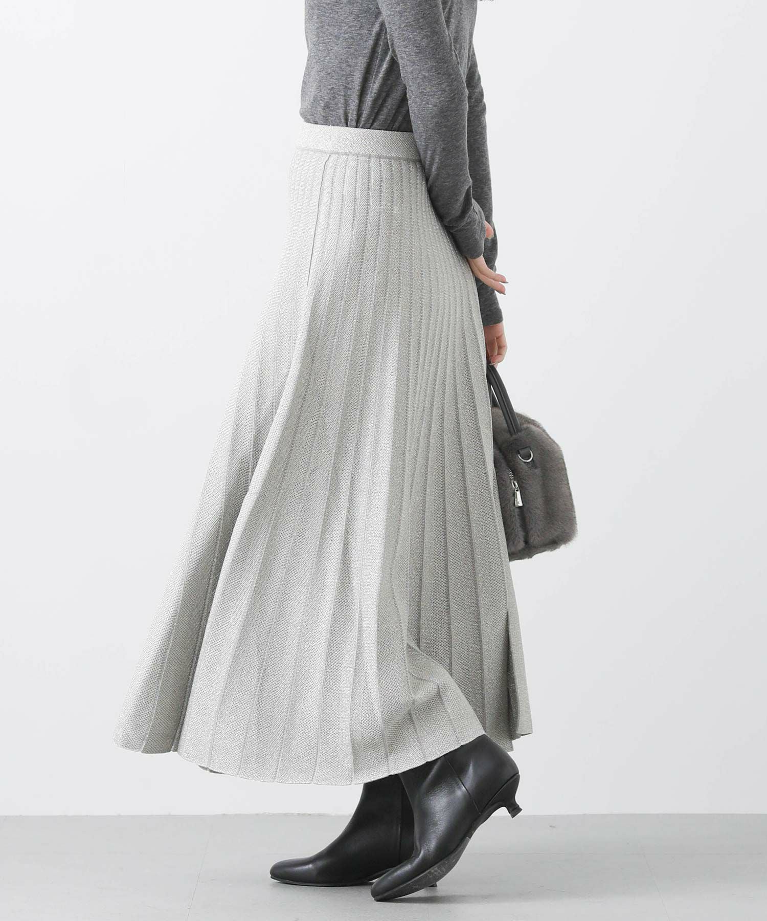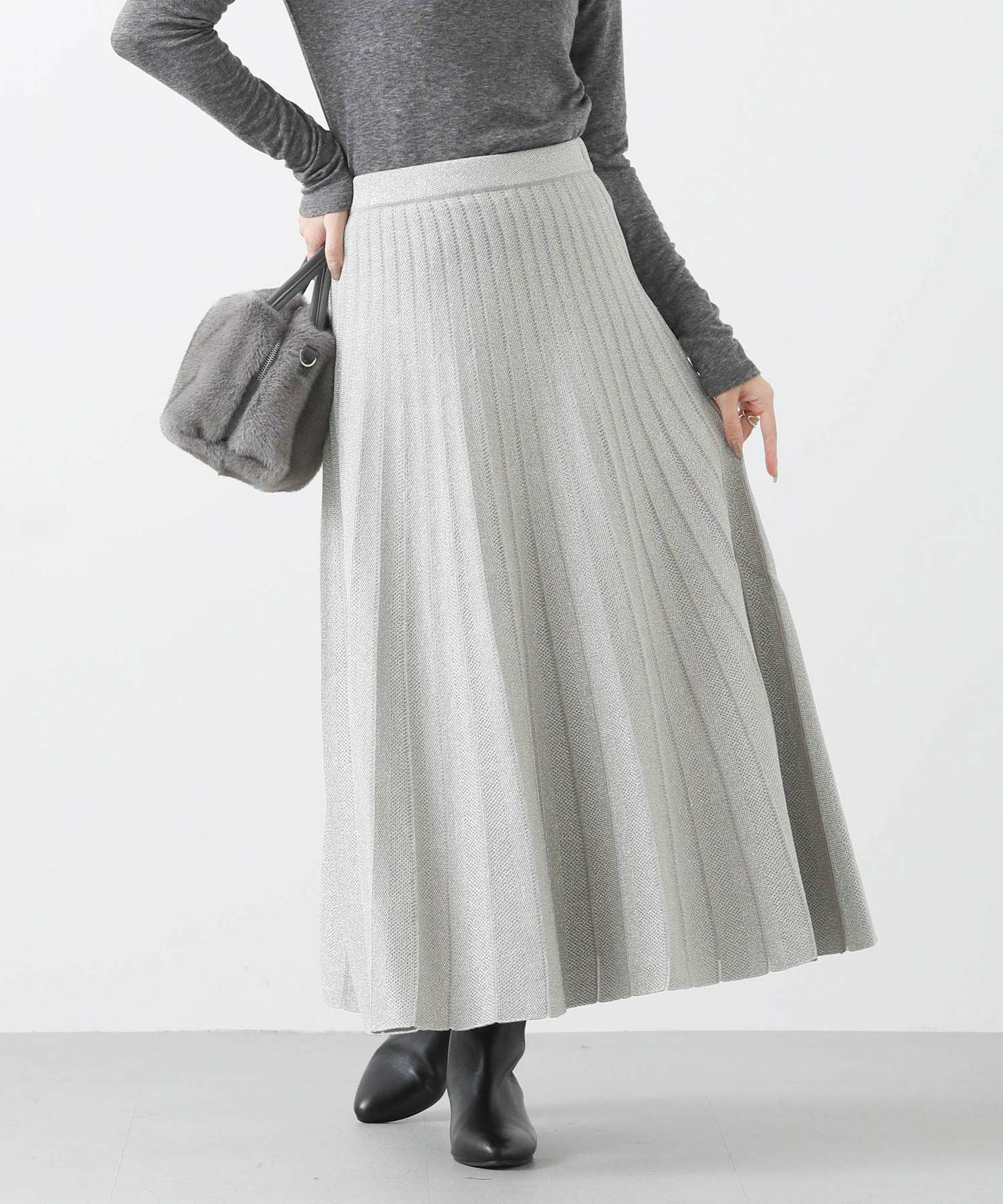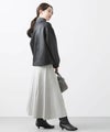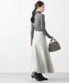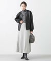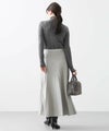 定番ニットスカートも、モード感ある素材で仕立てスタイリッシュに。