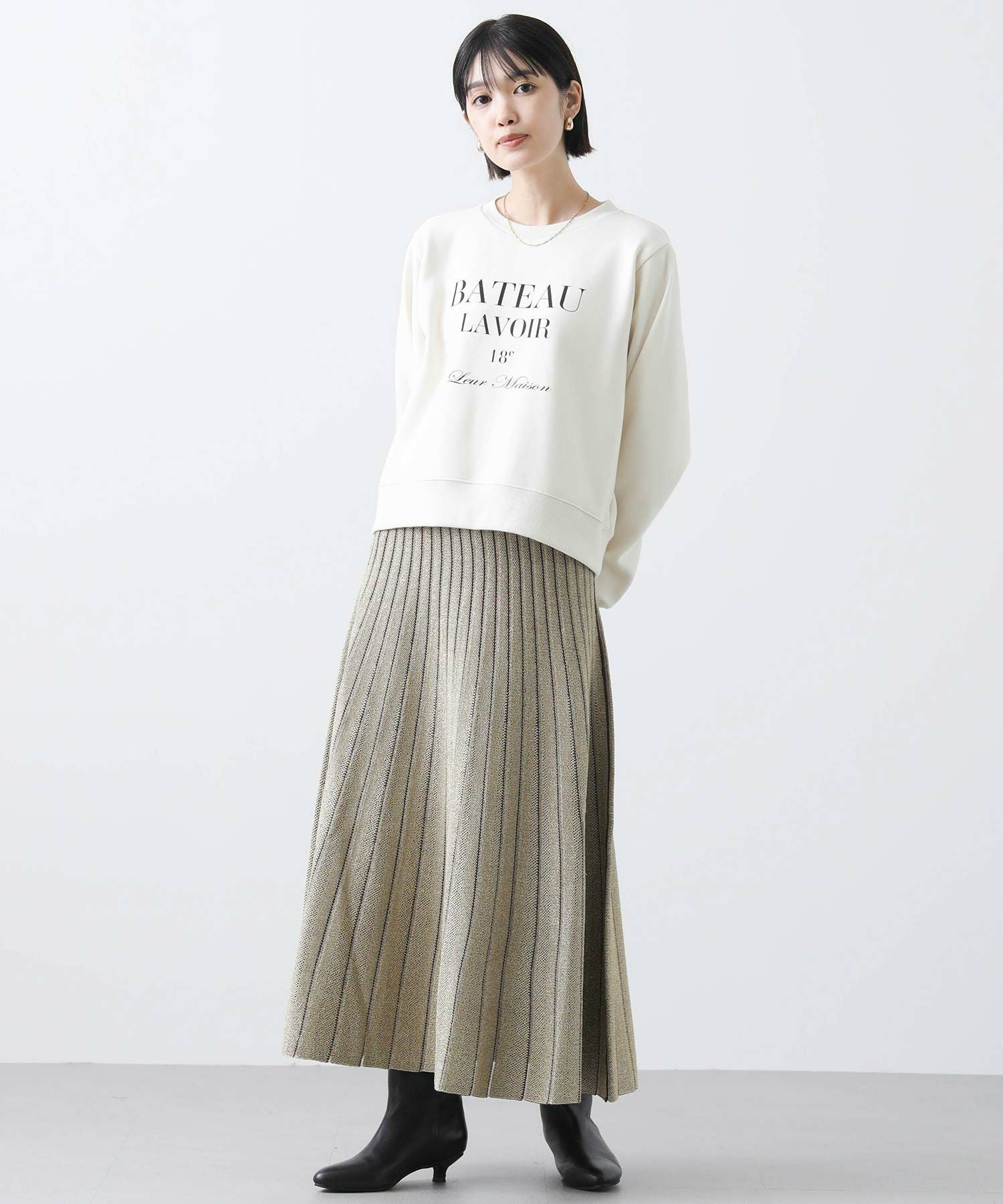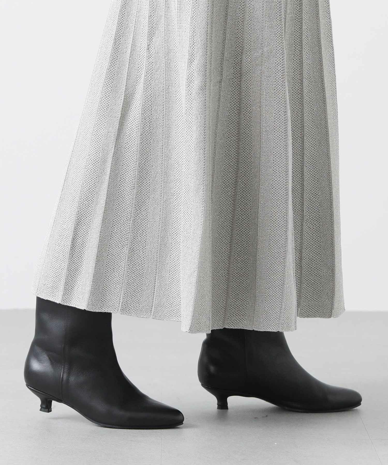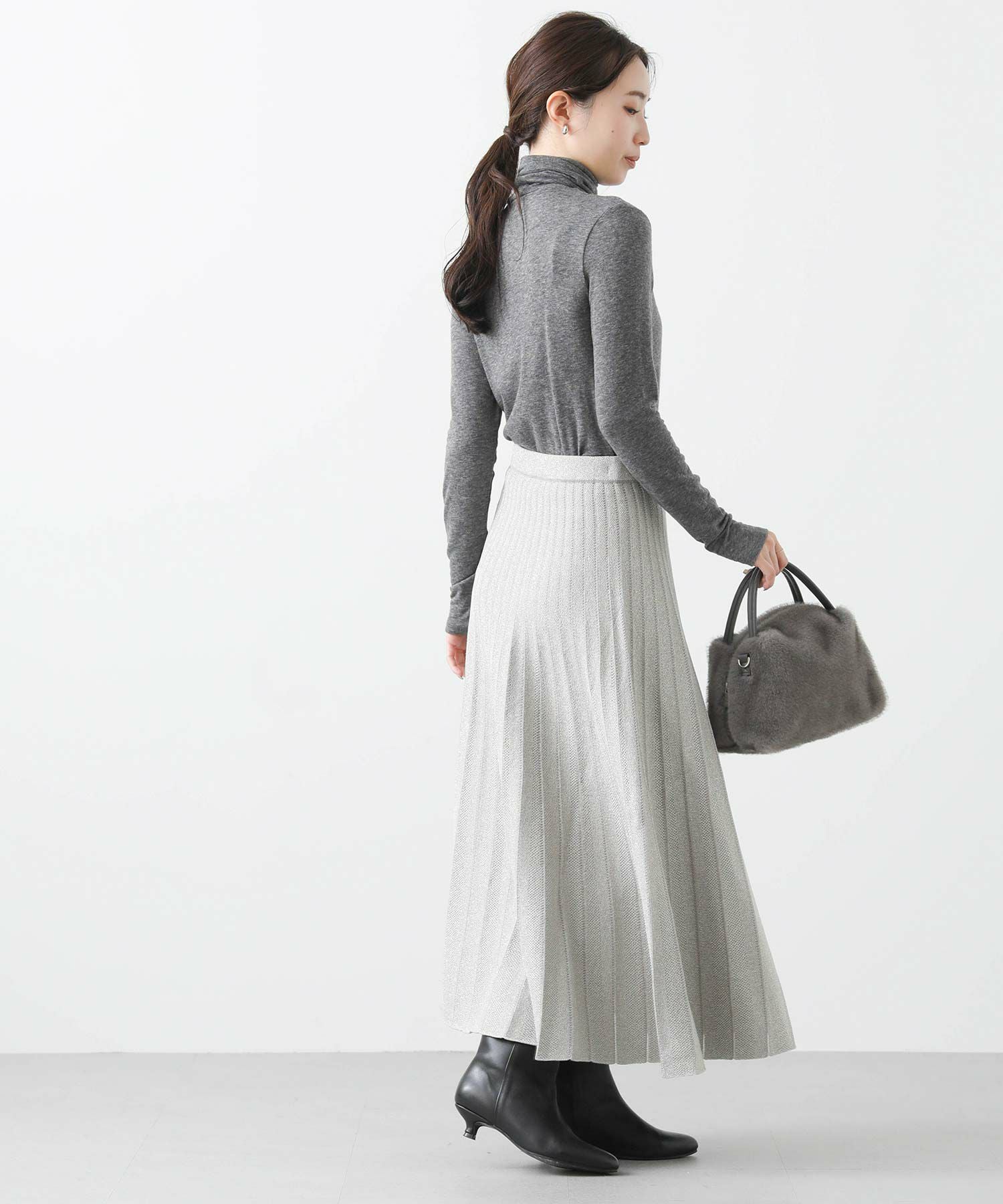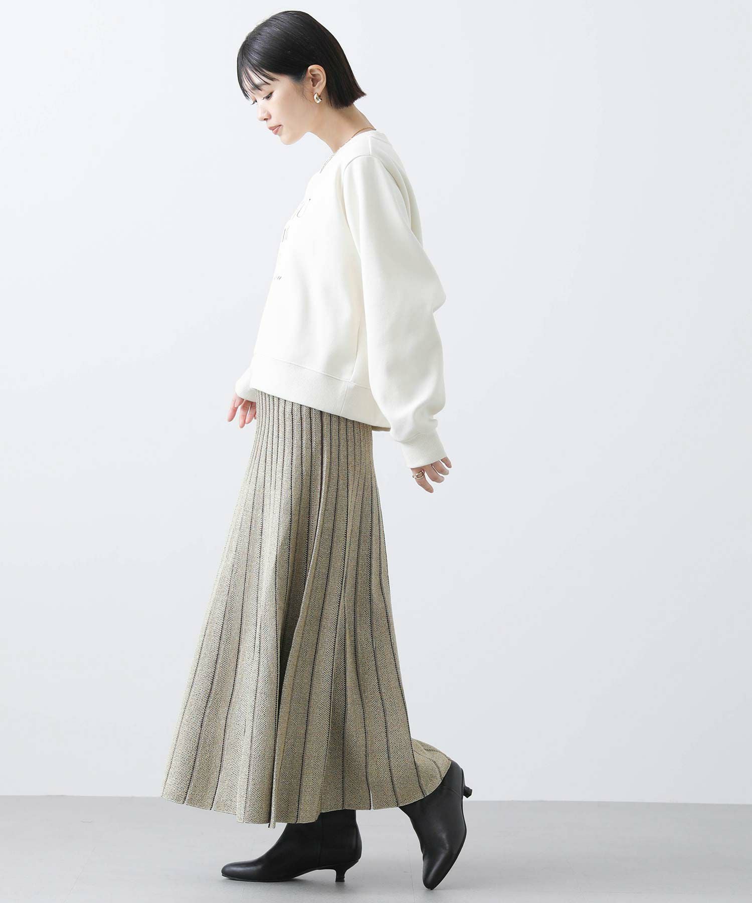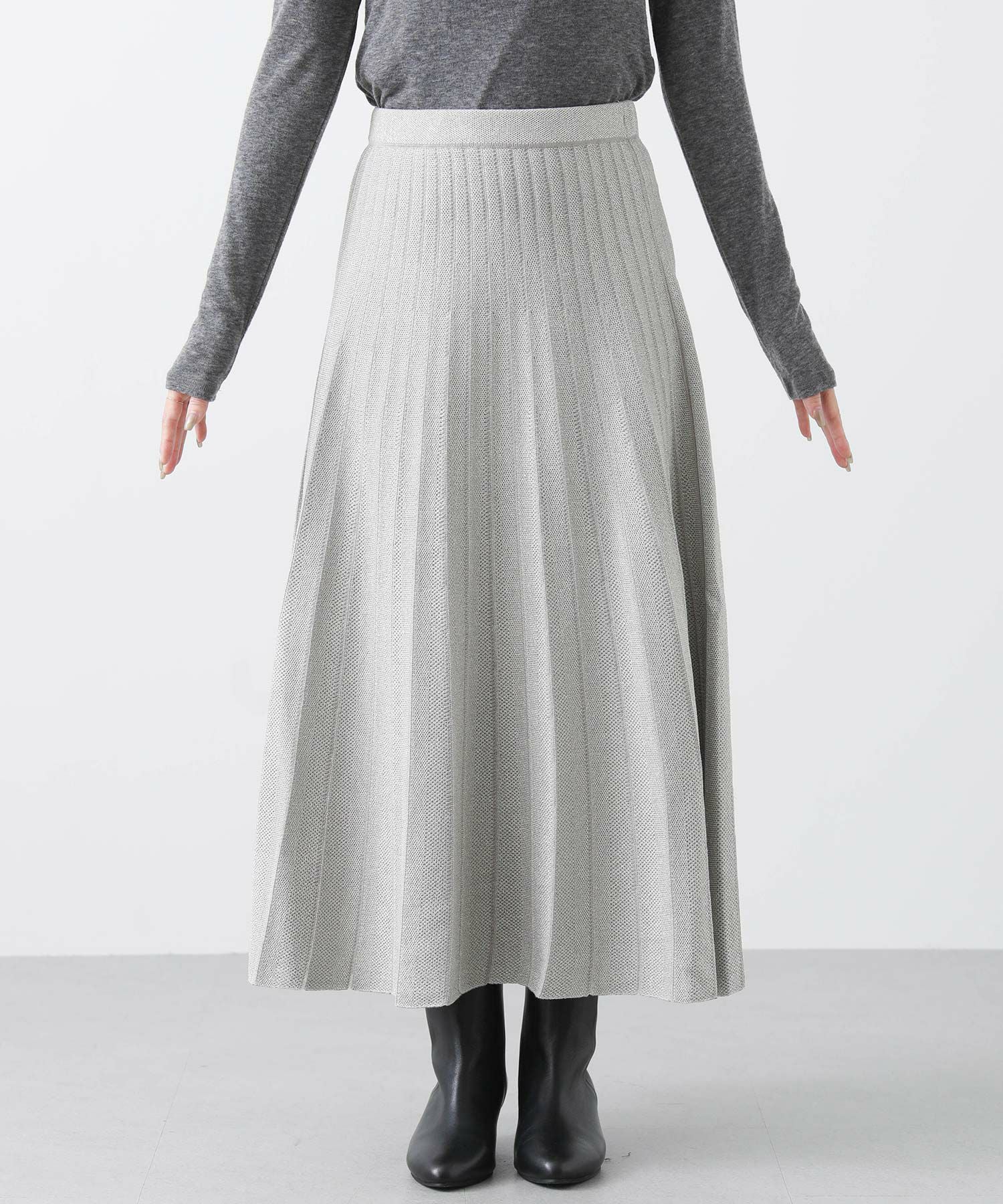 定番ニットスカートも、モード感ある素材で仕立てスタイリッシュに。