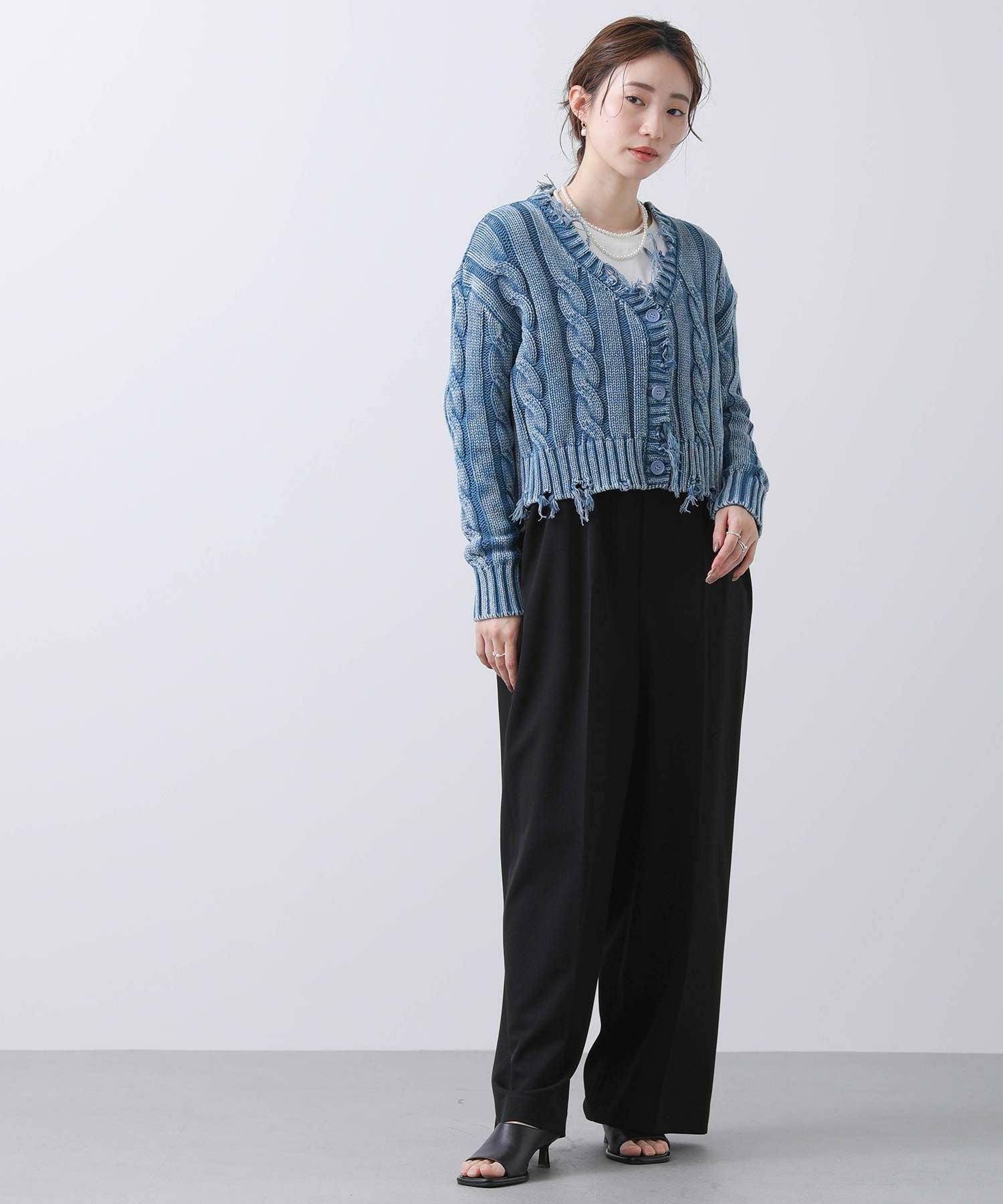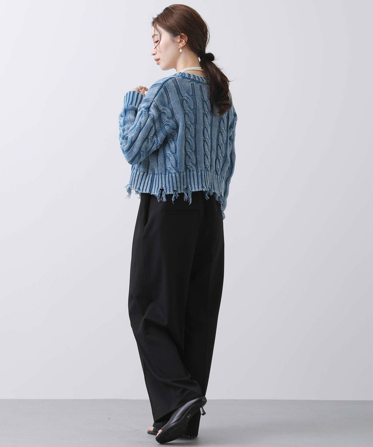 コンパクト見えする短い丈が旬なスタリングに導き、ユーズドデニムのようなカラーリングが、こなれた印象を演出します。