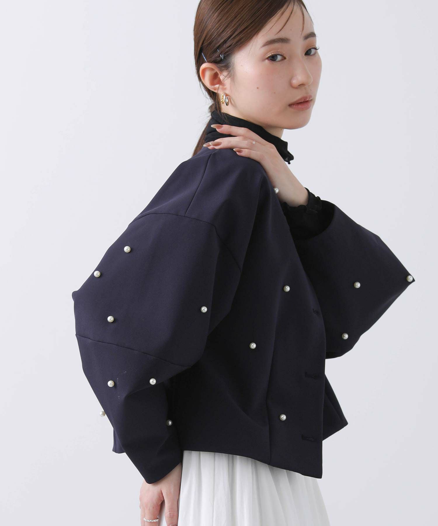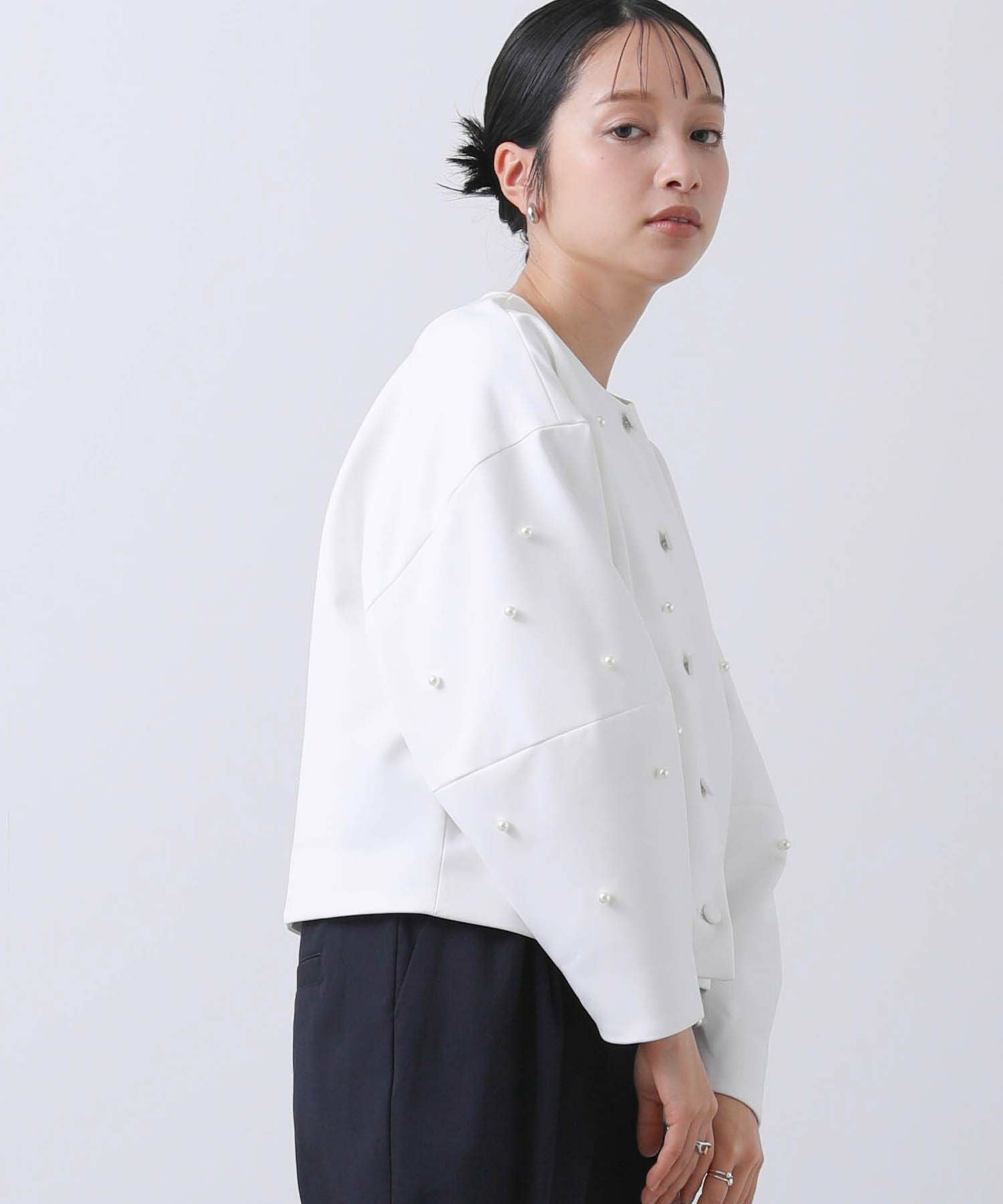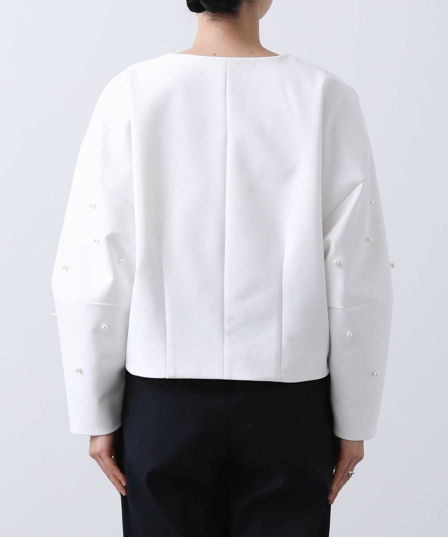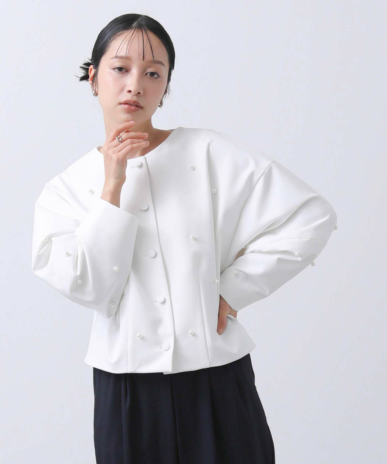 フェイクパールを贅沢にあしらったノーカラージャケット。