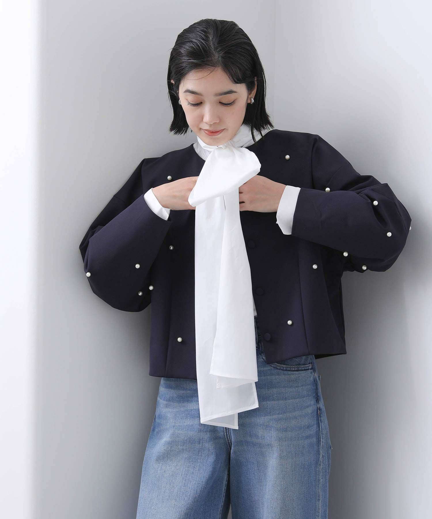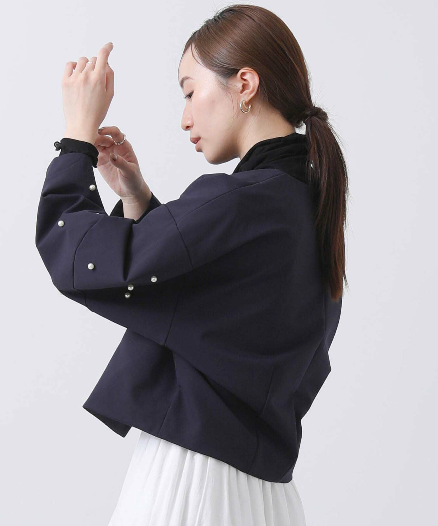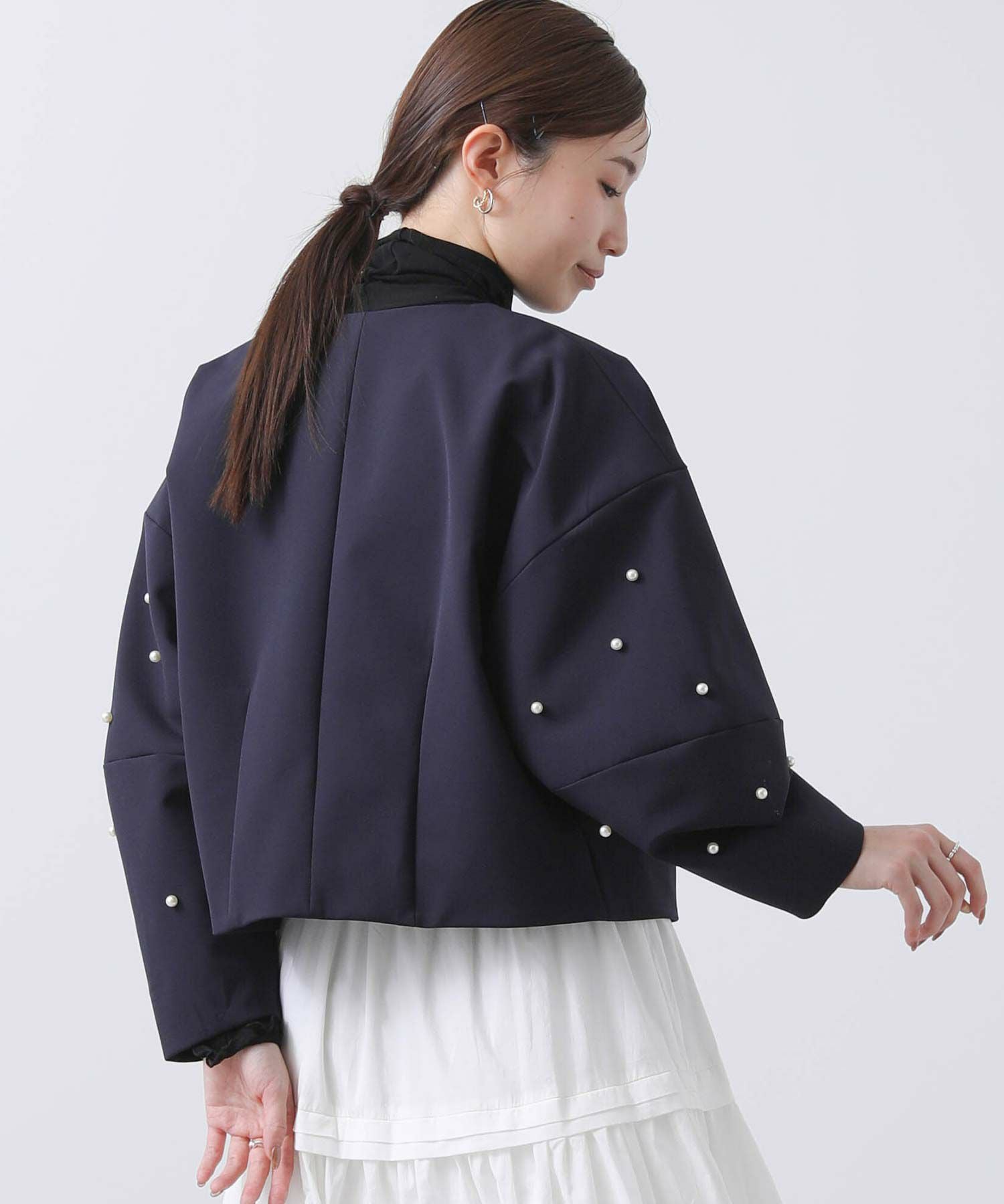 フェイクパールを贅沢にあしらったノーカラージャケット。
