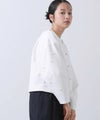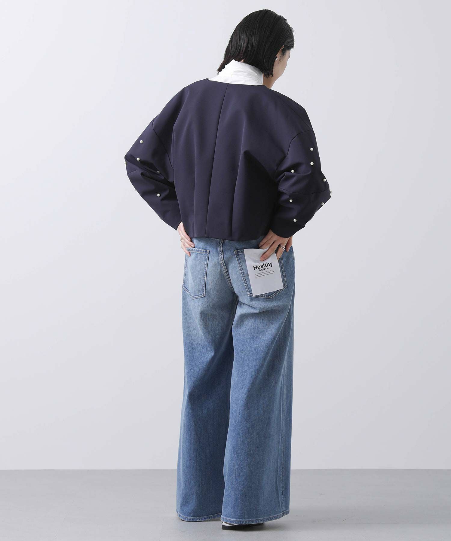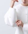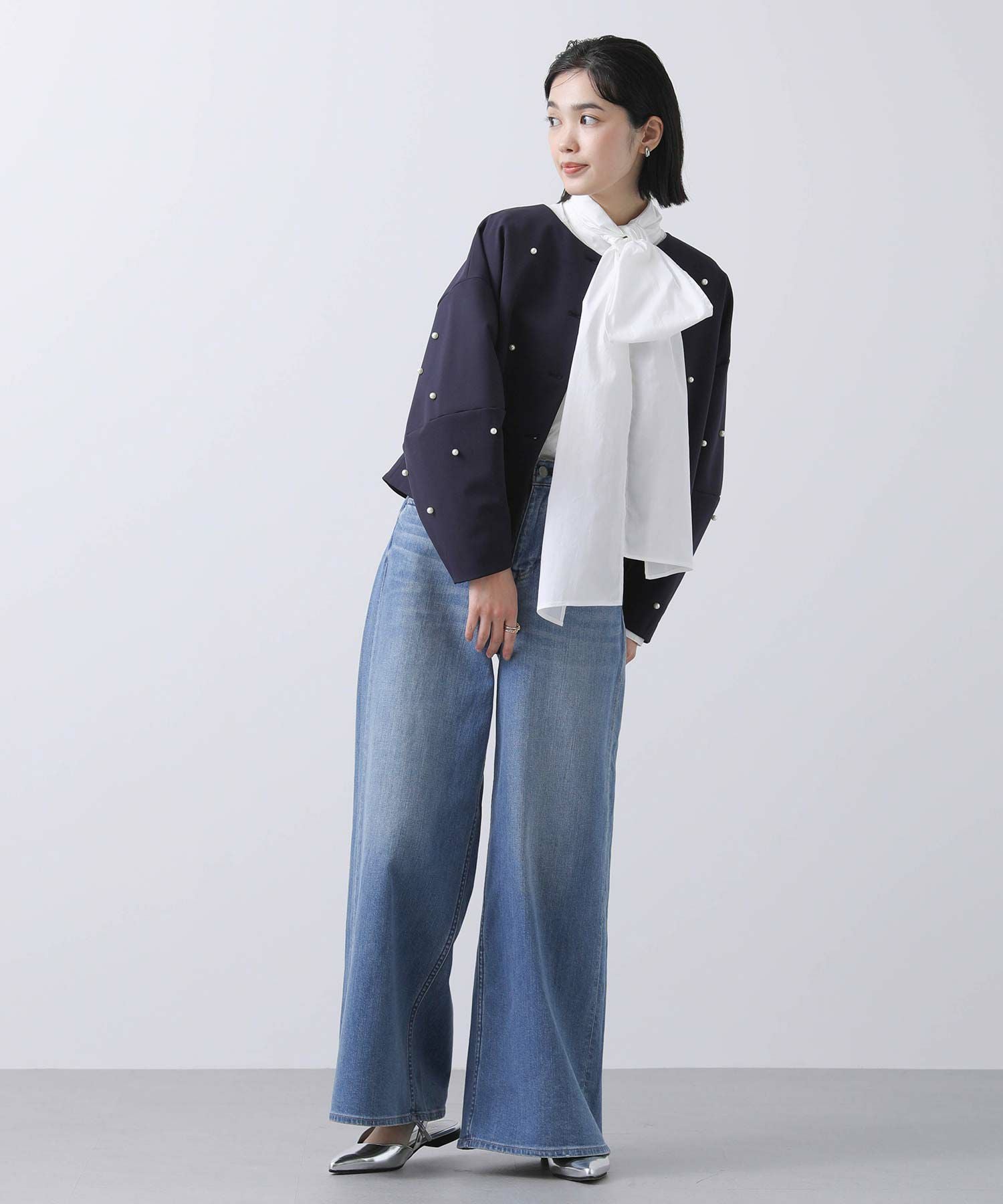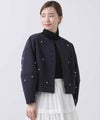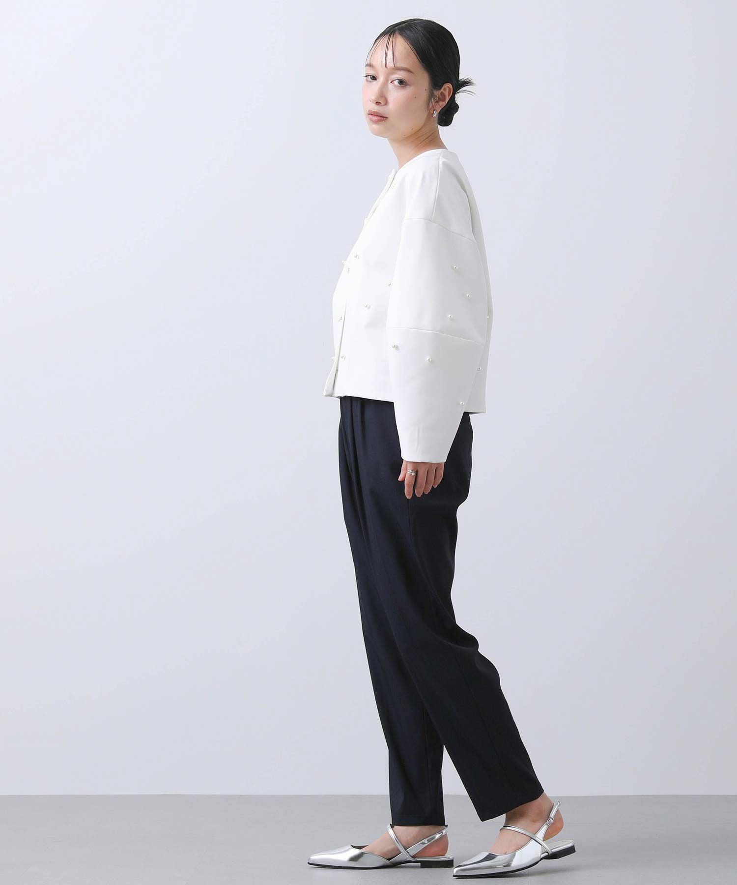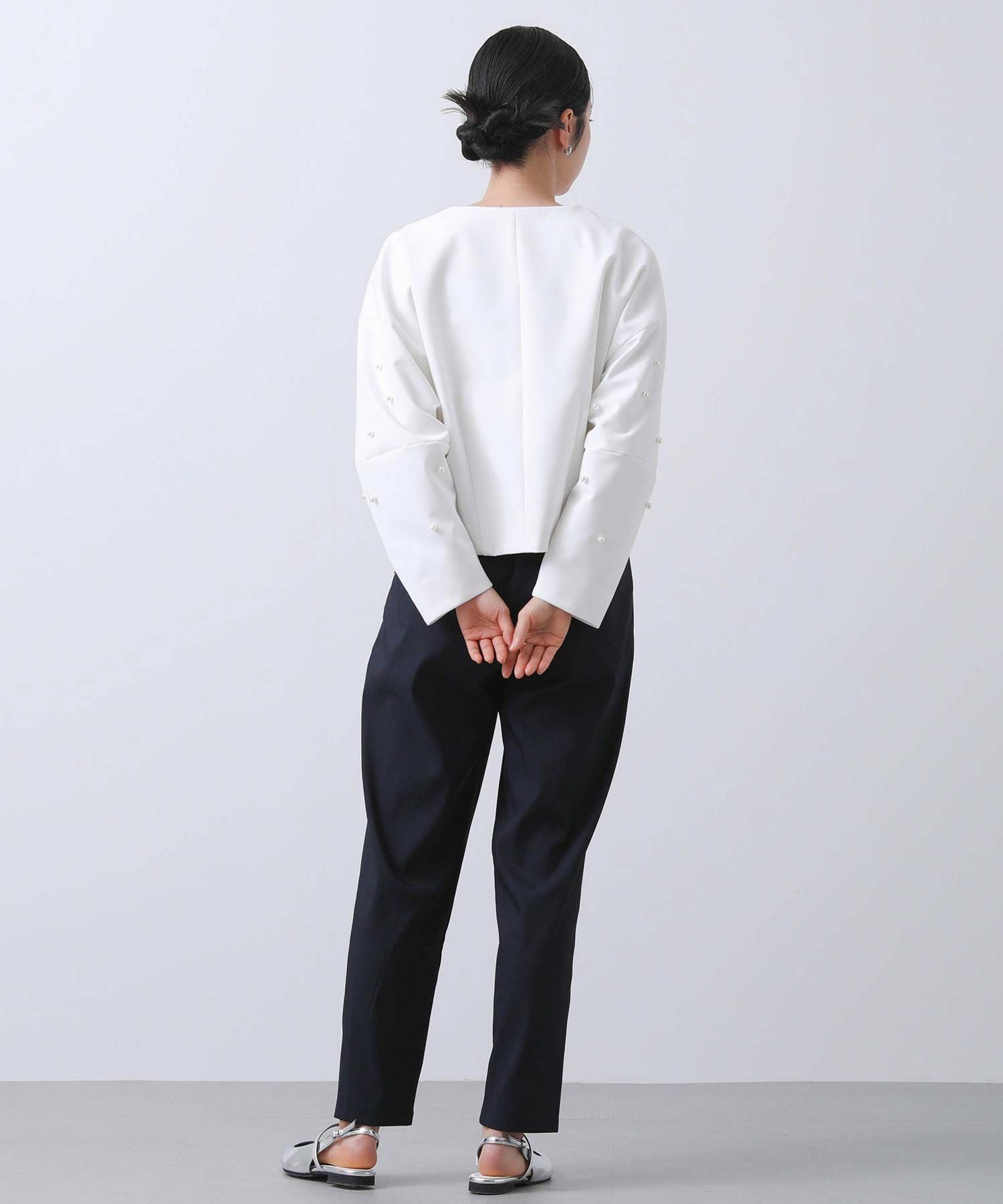 フェイクパールを贅沢にあしらったノーカラージャケット。