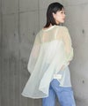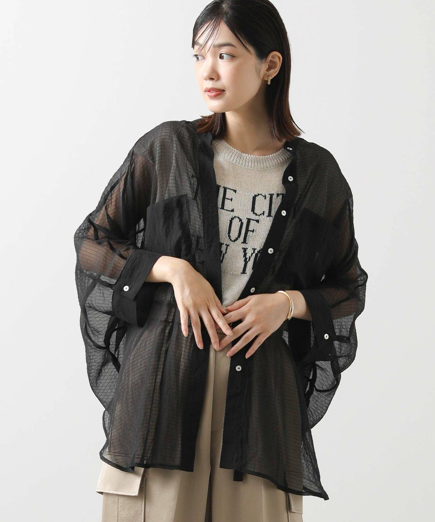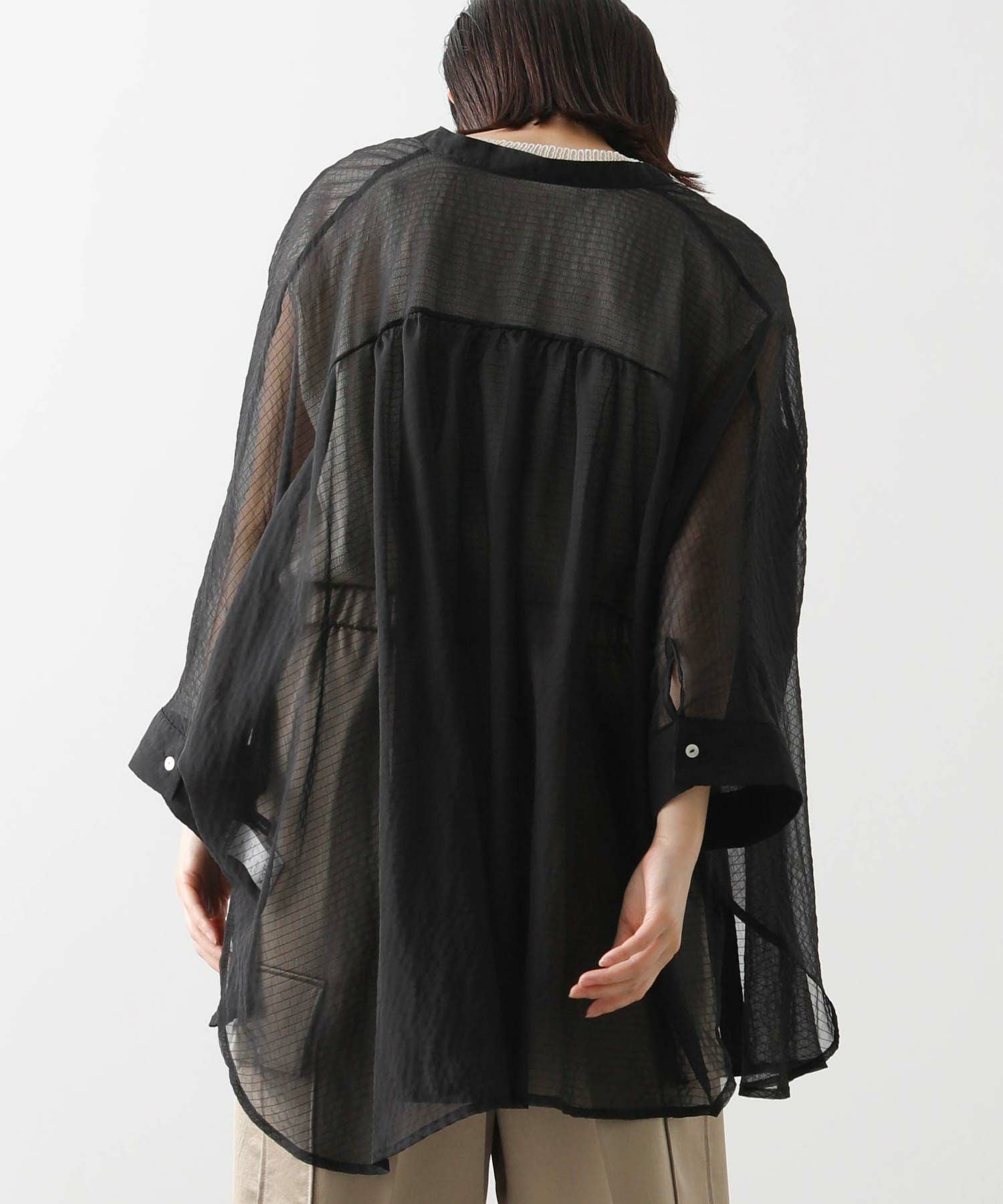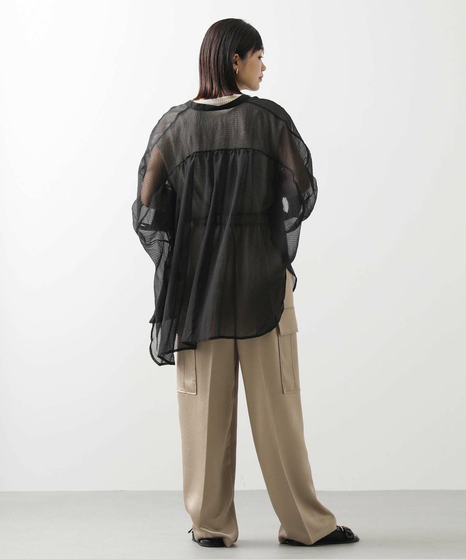 オーバーポンチョシルエットもシアー素材を使用することで重くなりすぎず軽やかな印象。