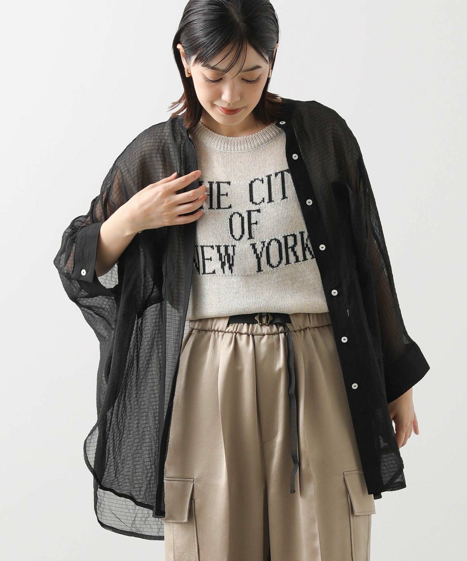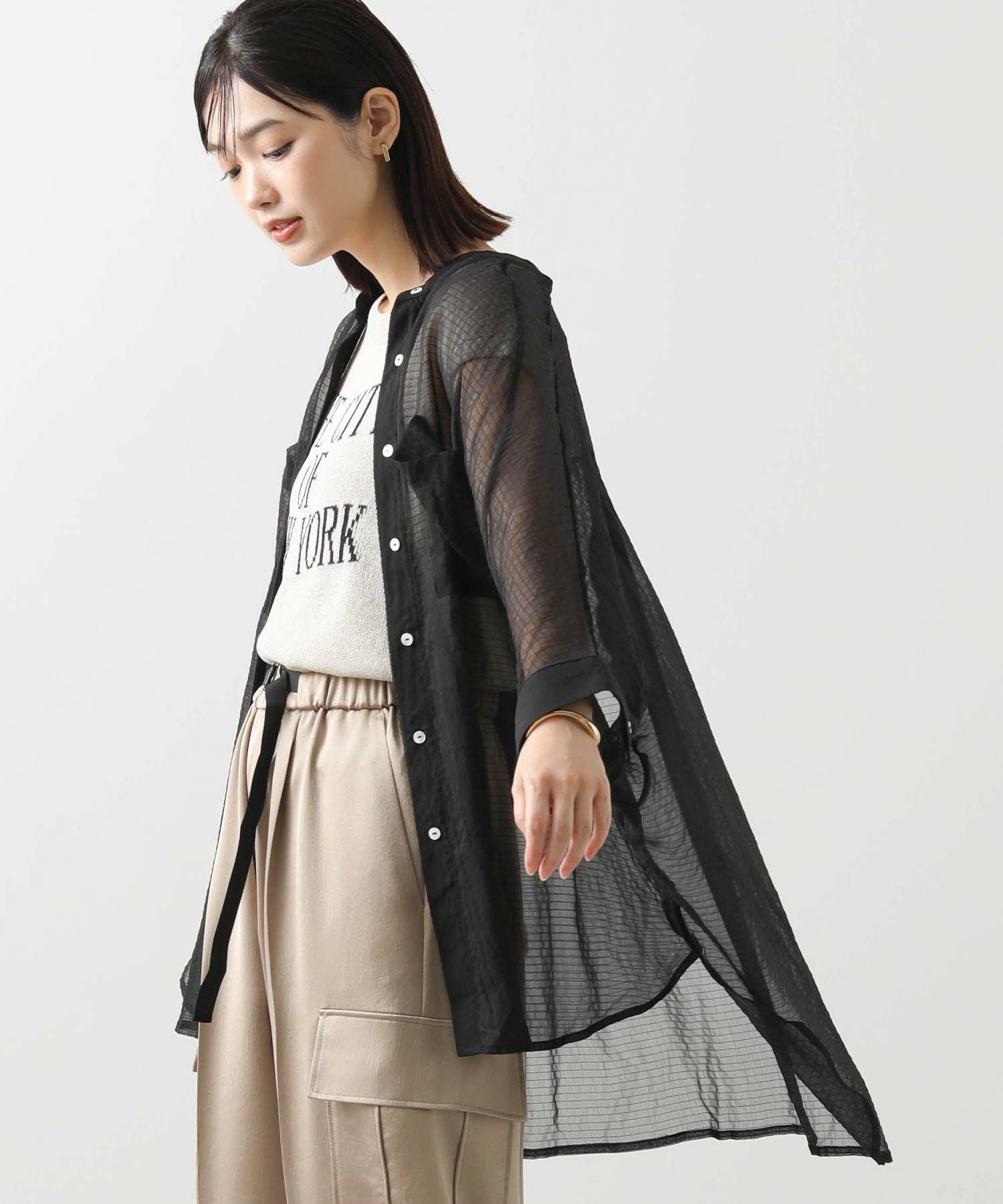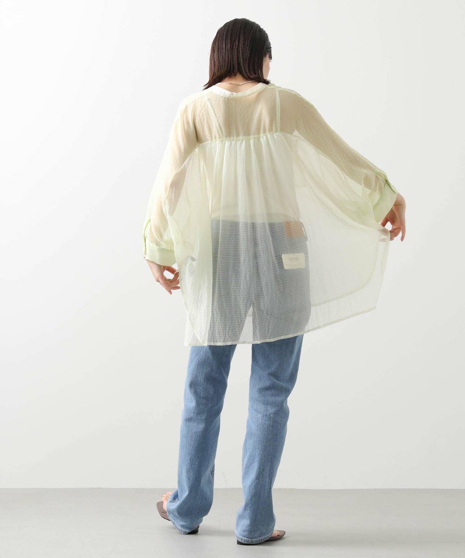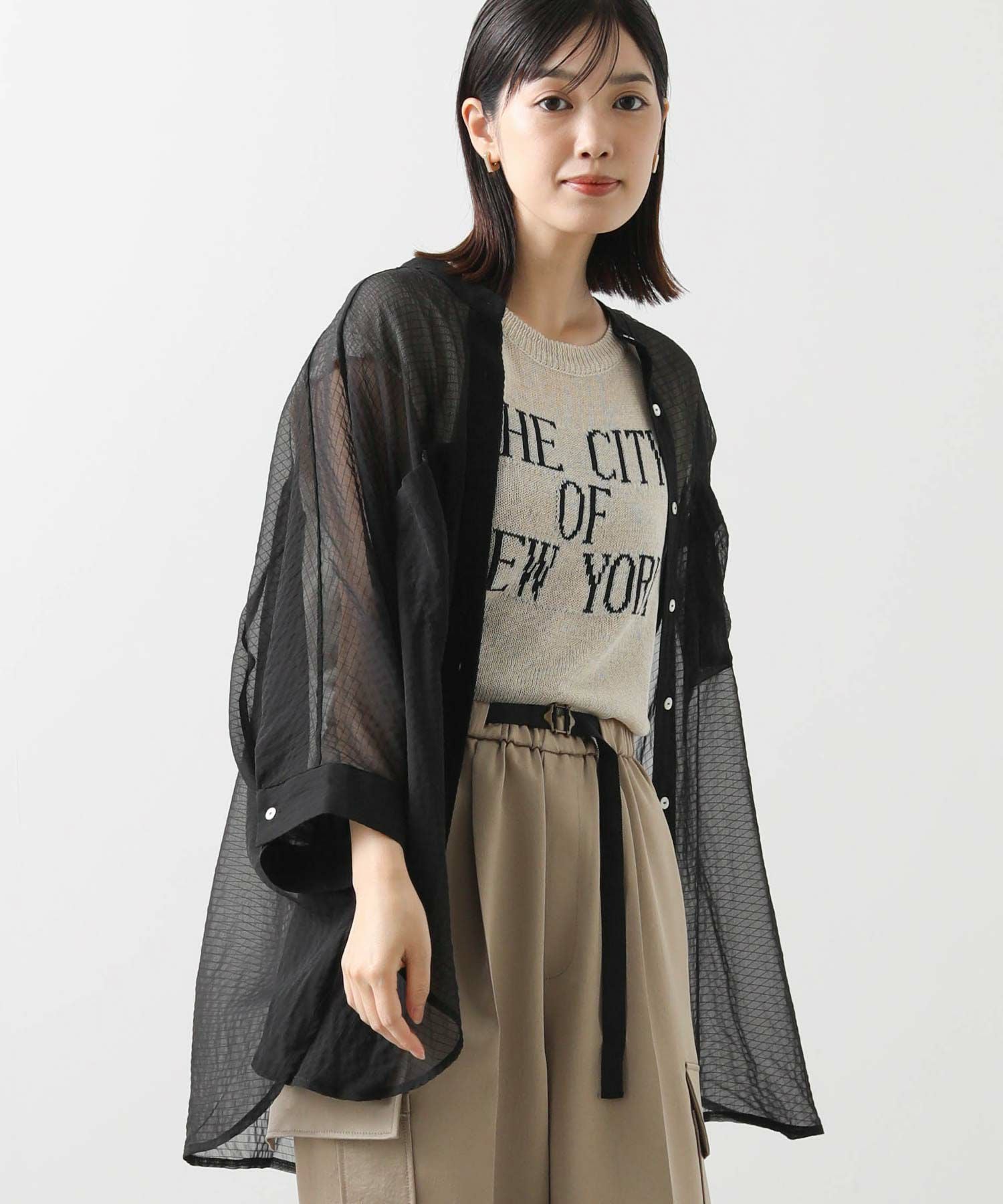 オーバーポンチョシルエットもシアー素材を使用することで重くなりすぎず軽やかな印象。