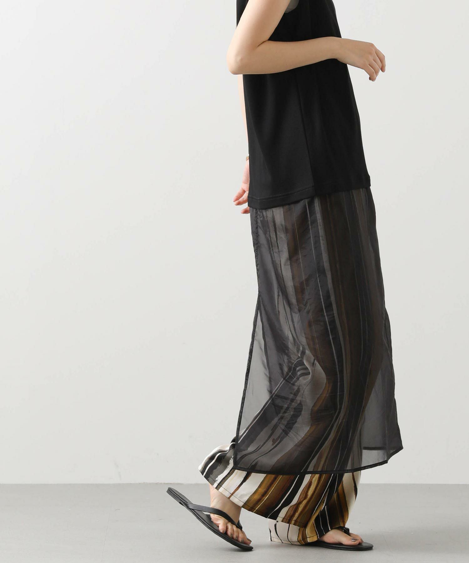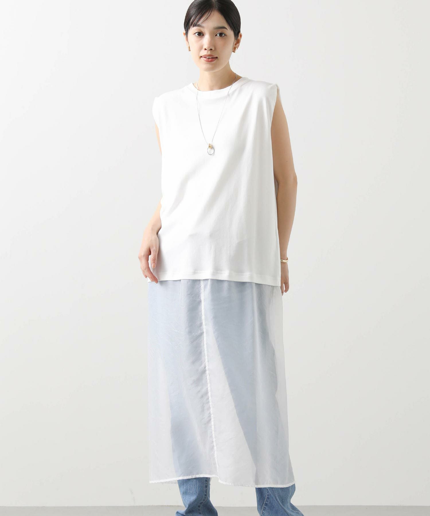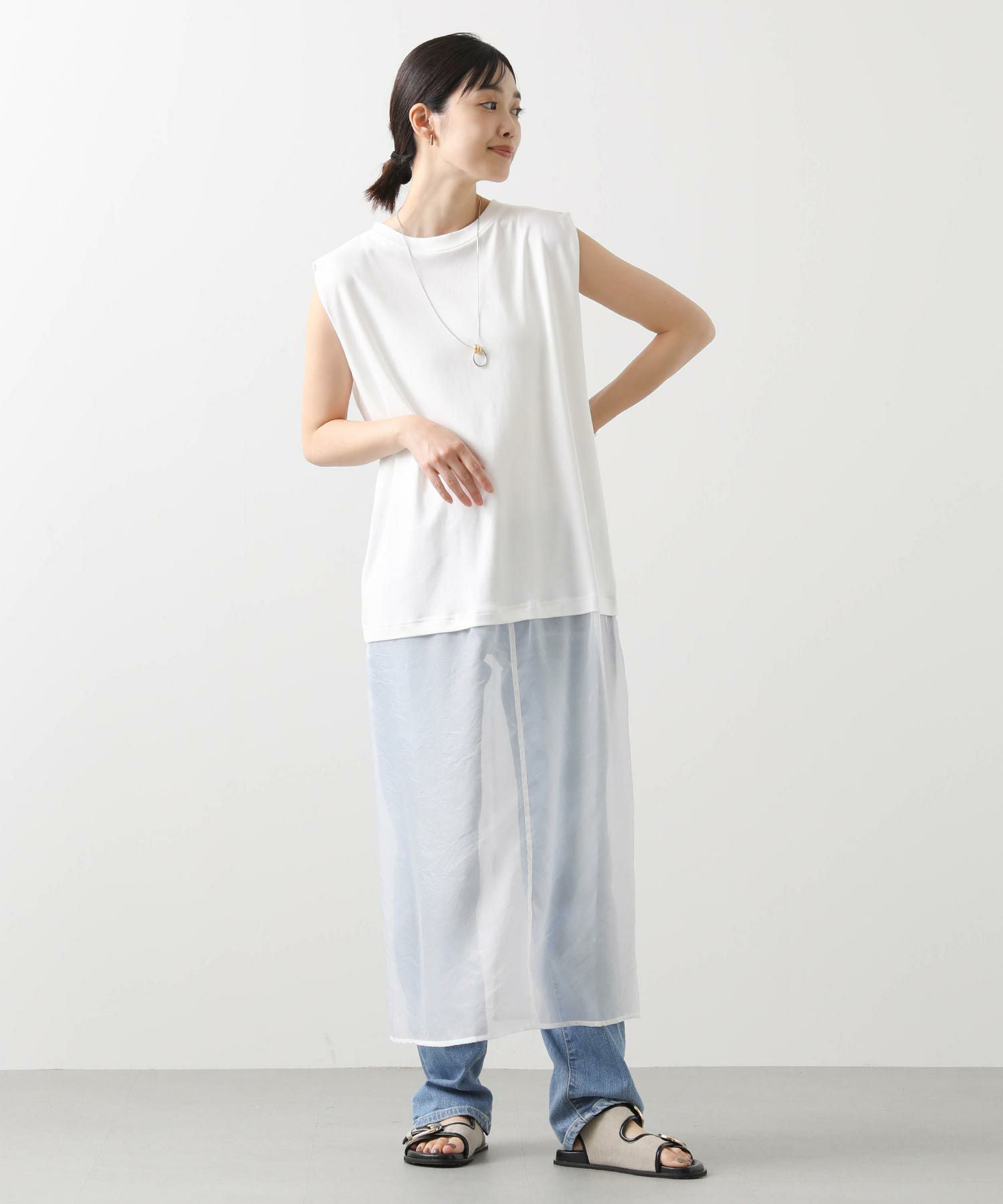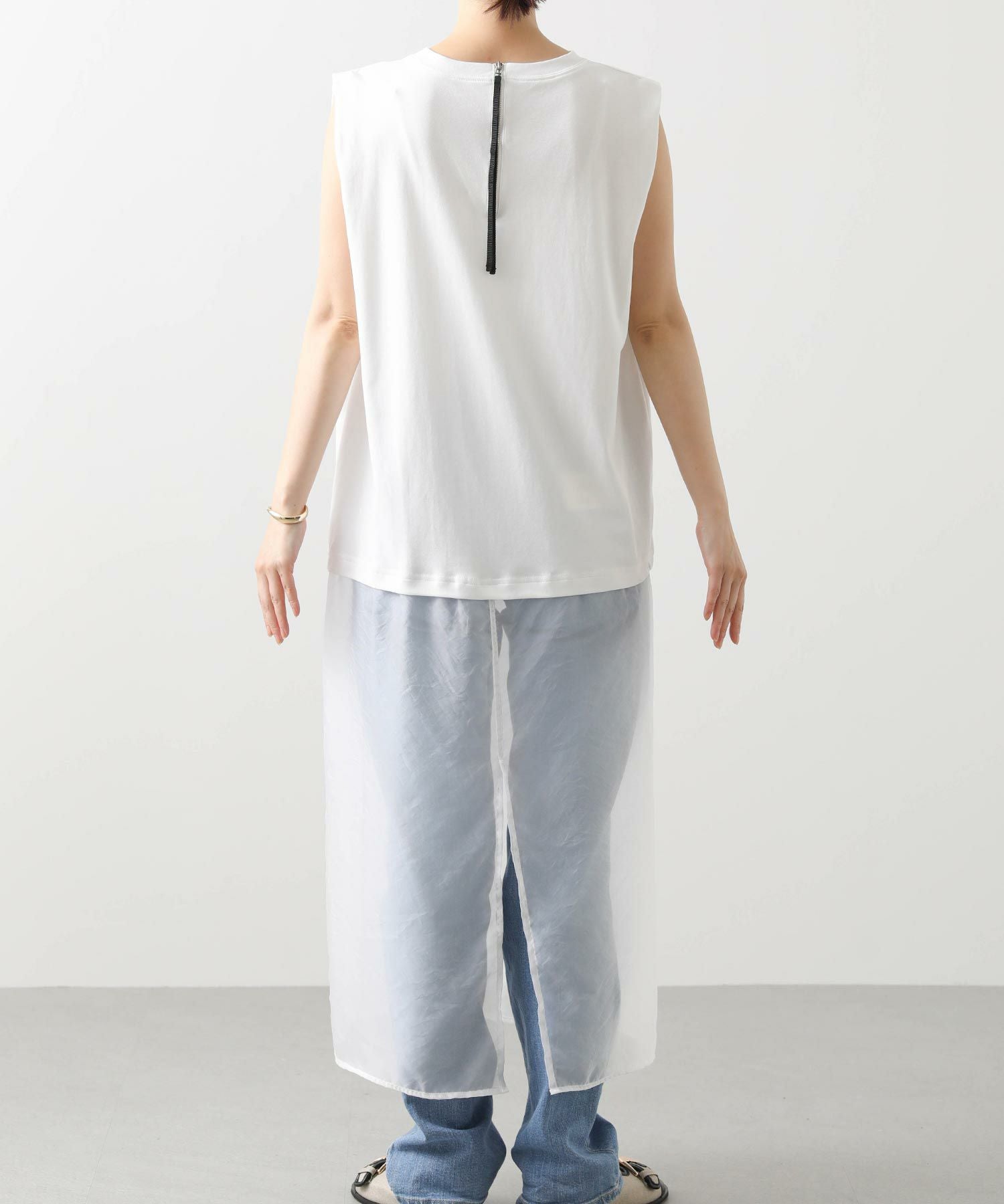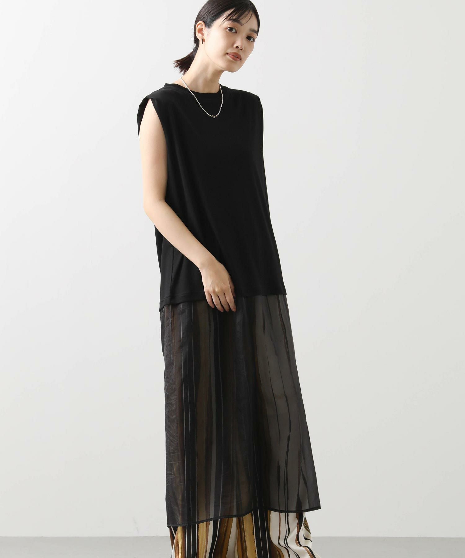トレンドのシアースカートを重ねたようなデザインがサマになる1枚。