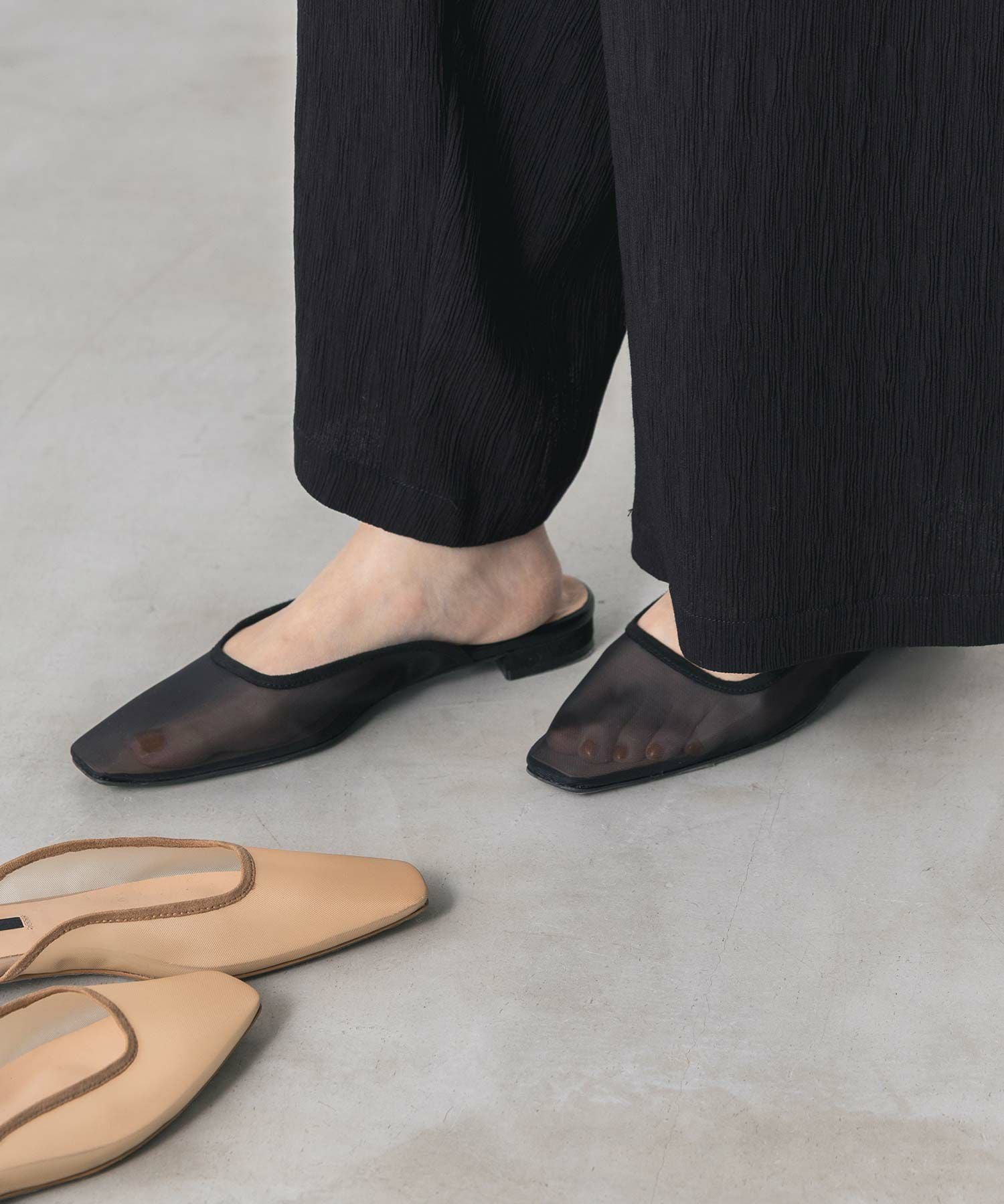 シャープなスクエアトゥのシルエットや程よい透け感で、履くだけで旬のスタイルに。初春から晩夏まで活躍する一足です。