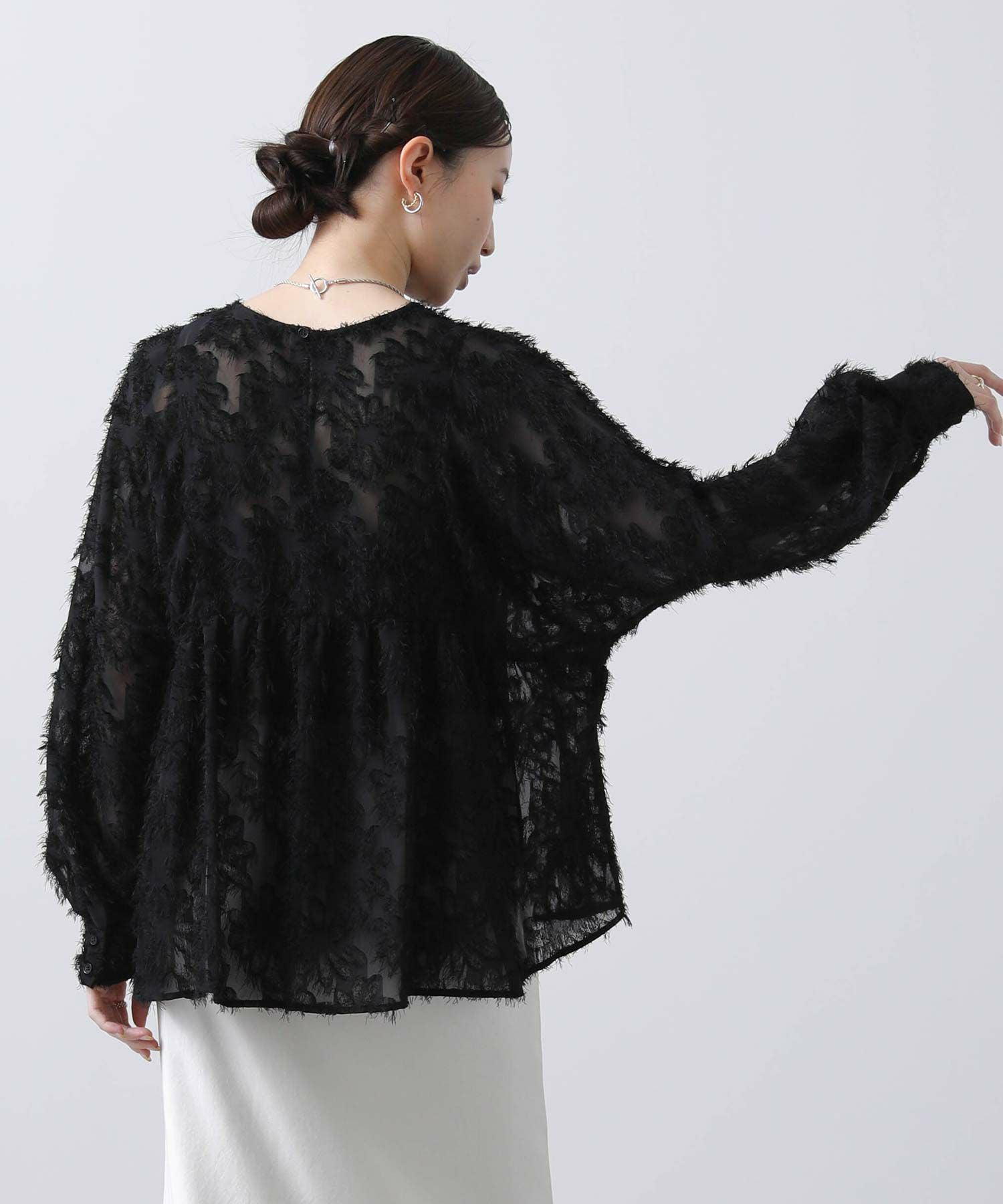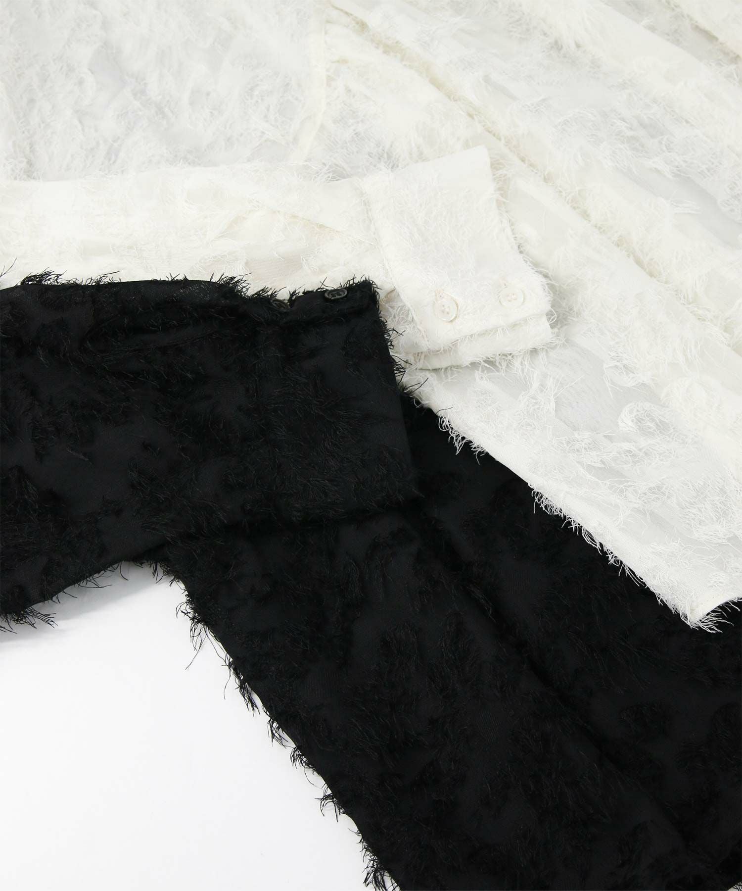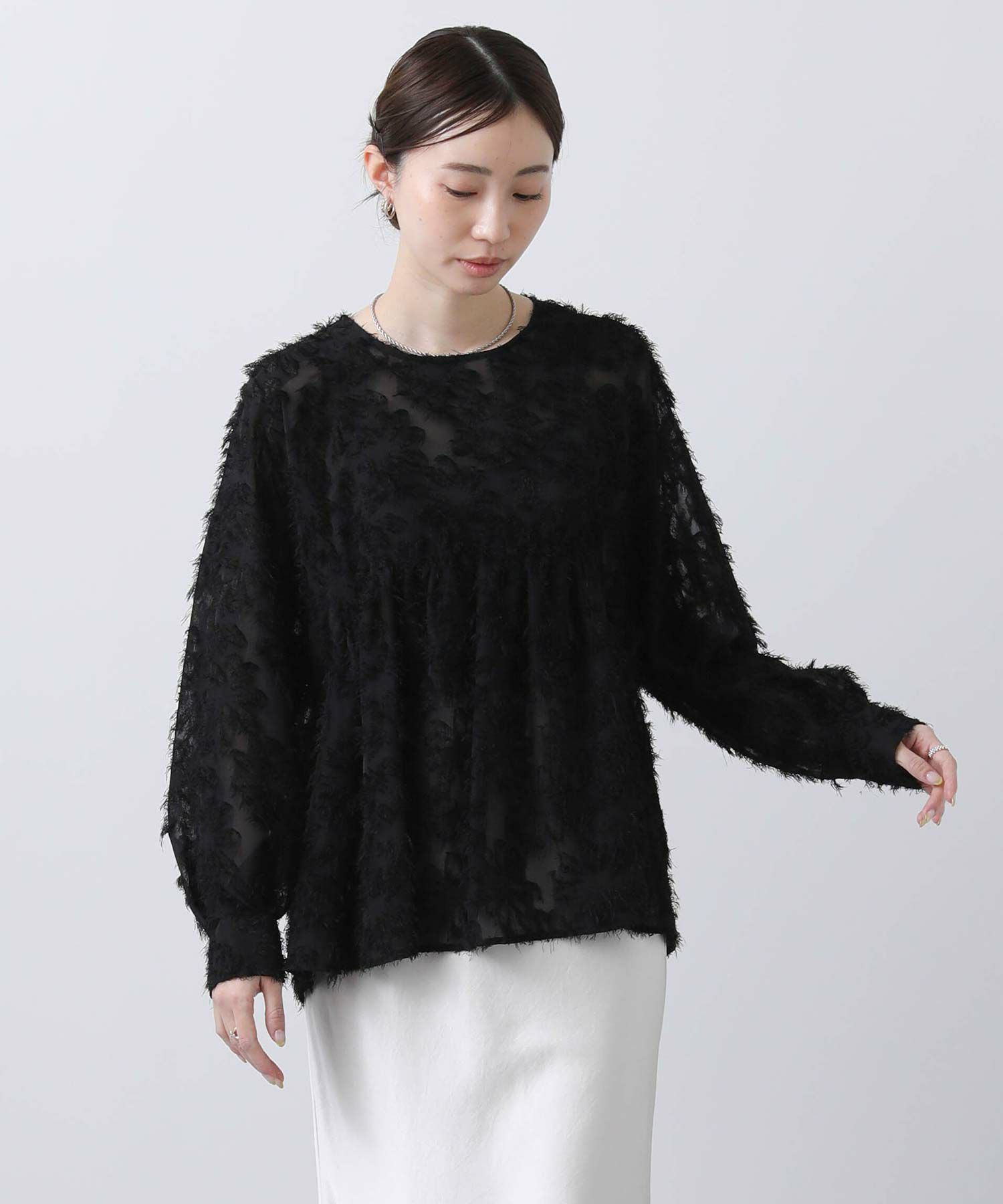 シアー感のある素材にフリンジのような毛足が目を惹くデザイン。