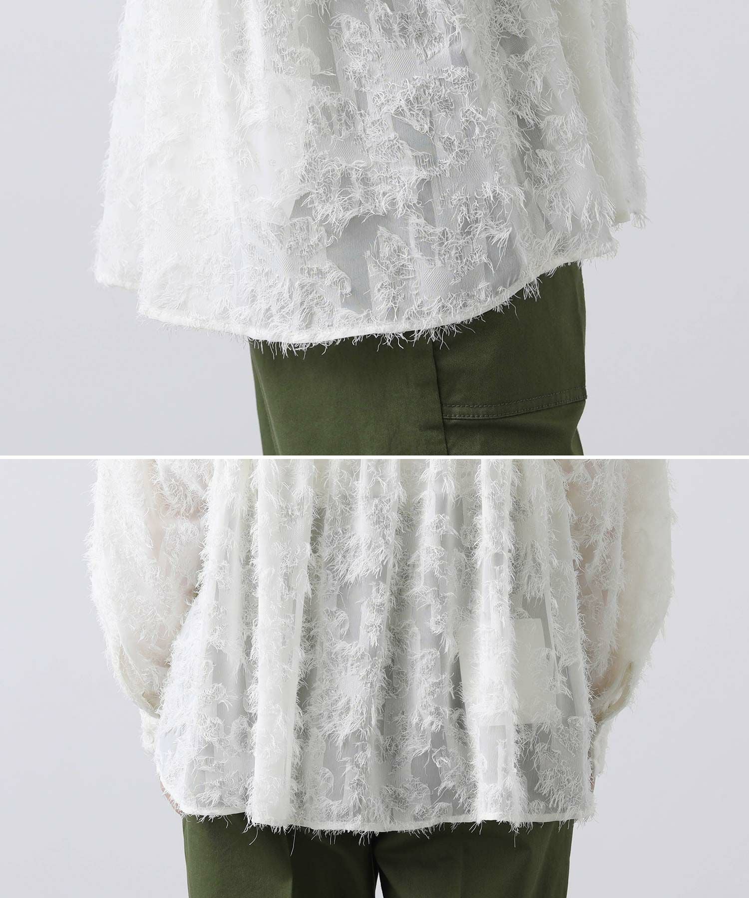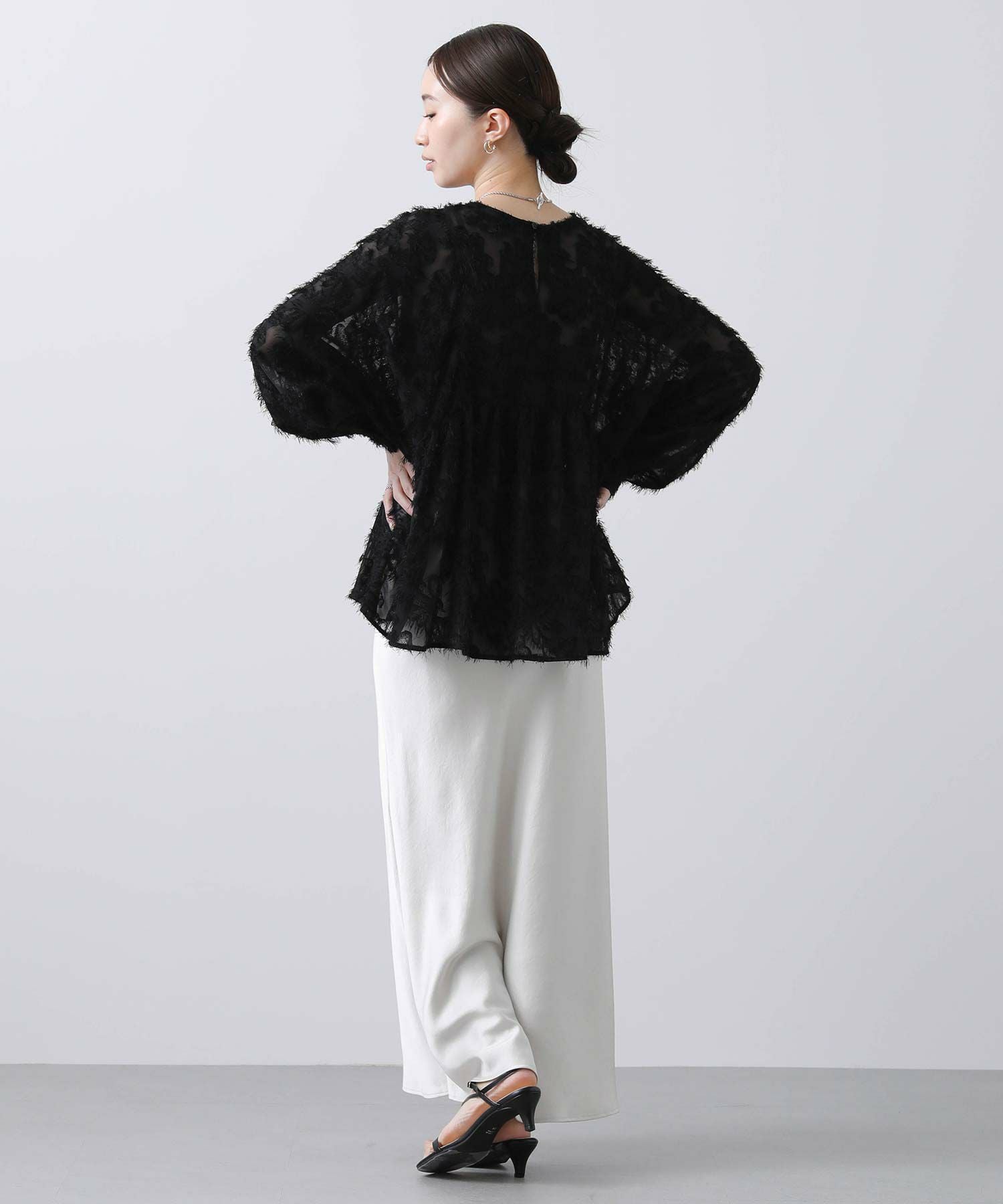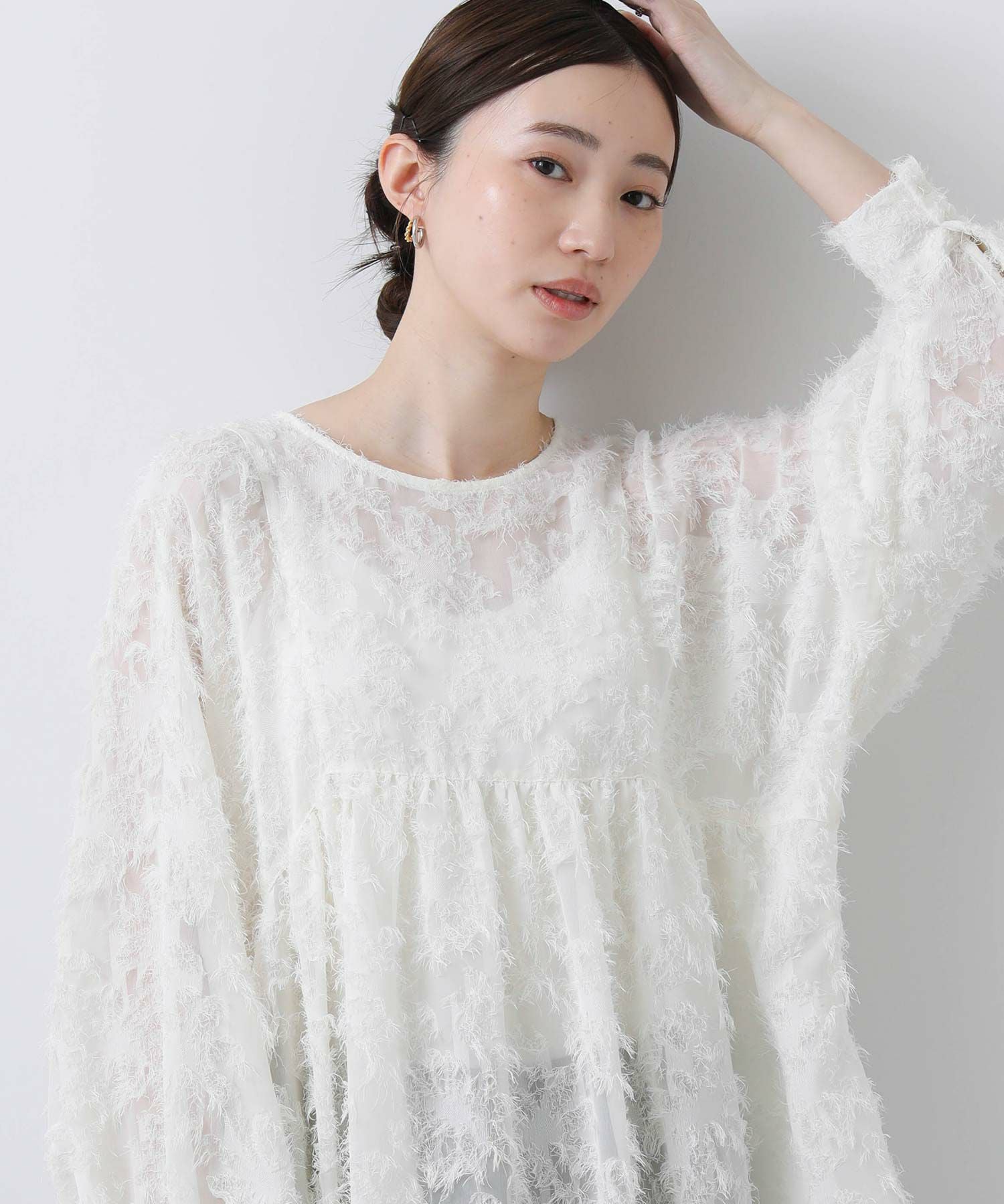 シアー感のある素材にフリンジのような毛足が目を惹くデザイン。