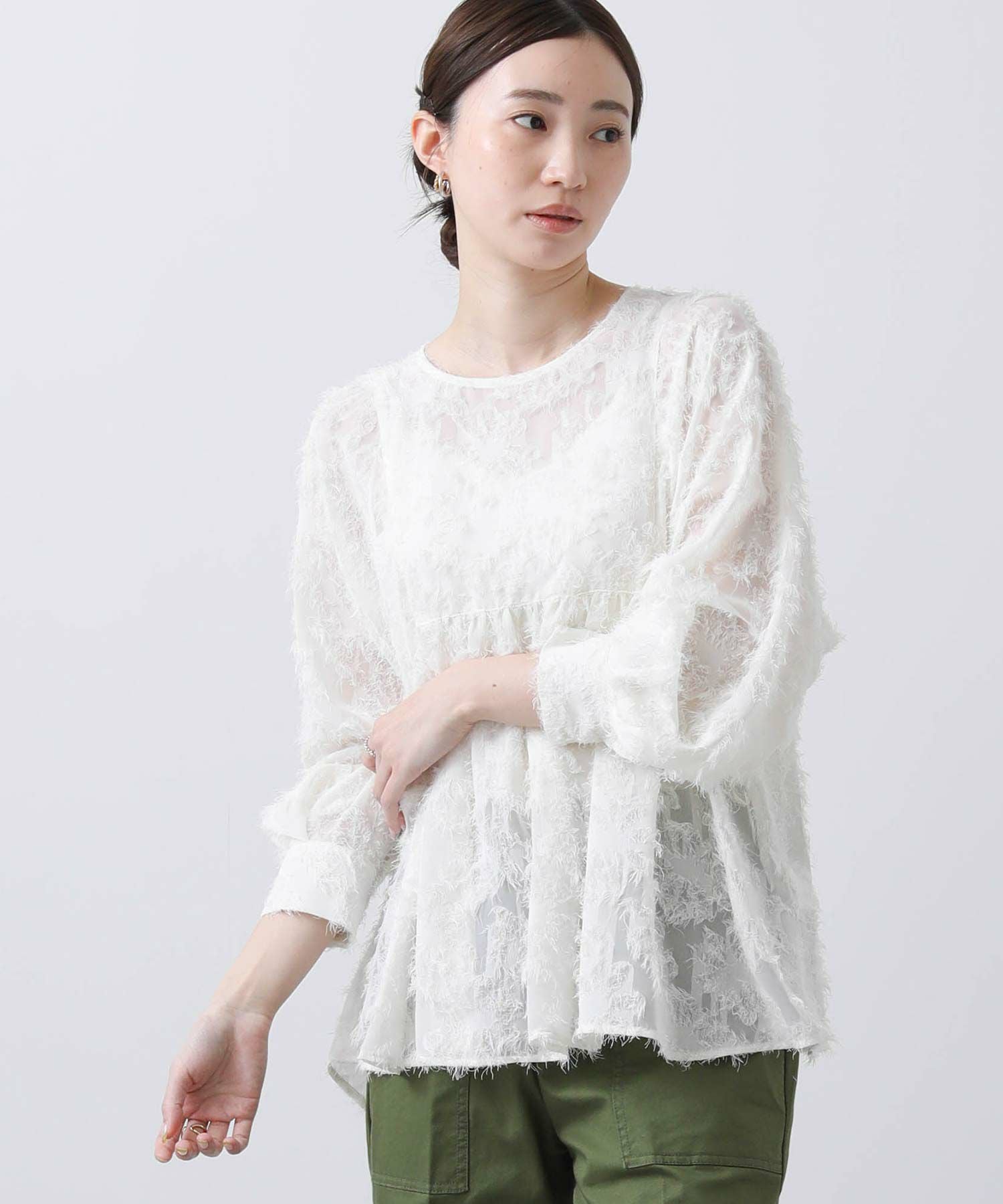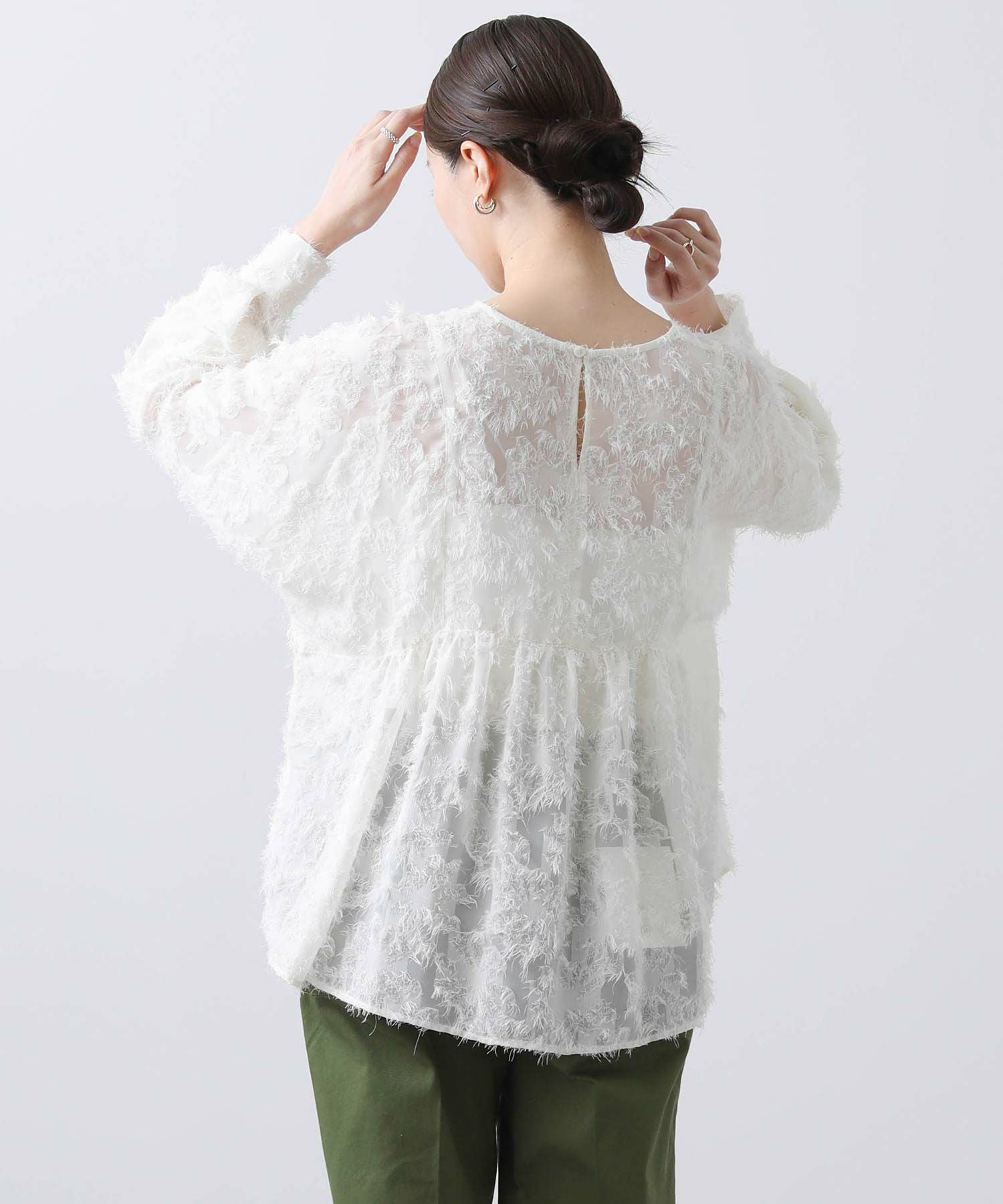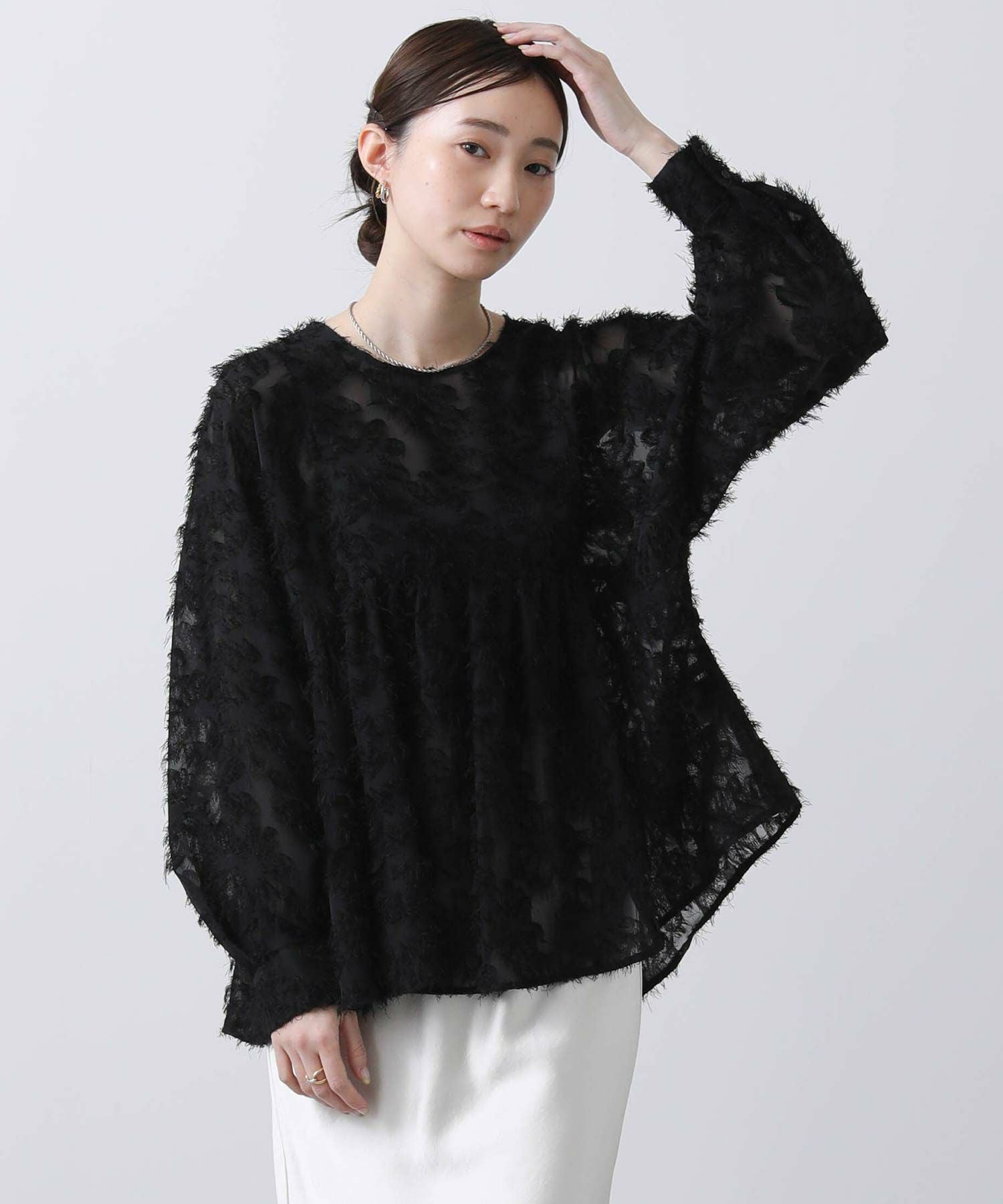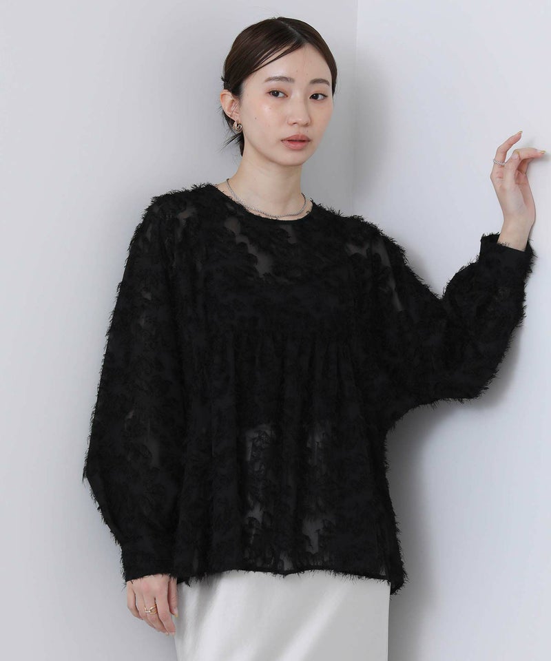 ジャガード素材が華やかなブラウス。
