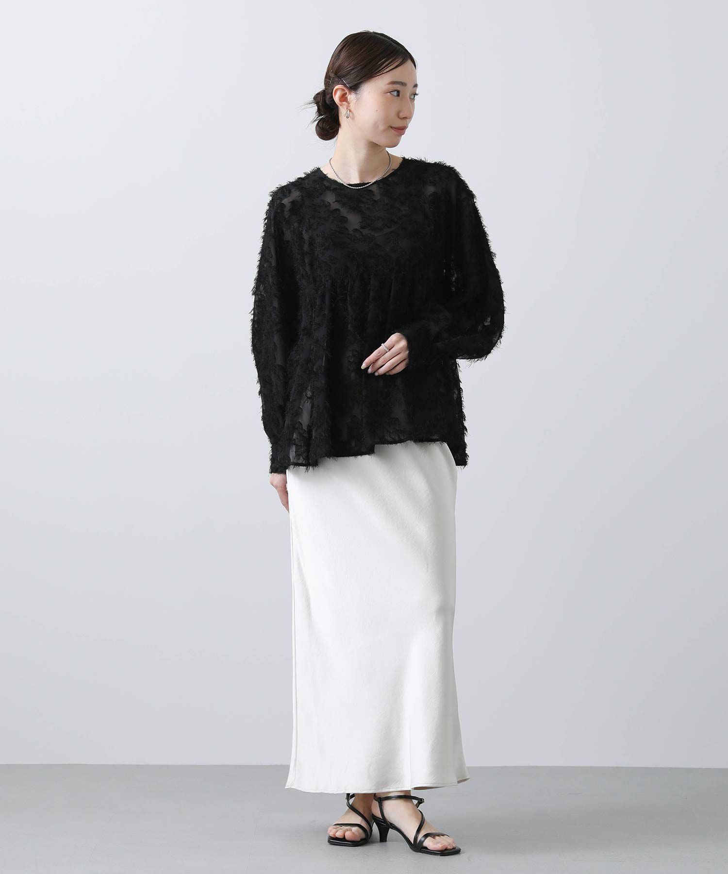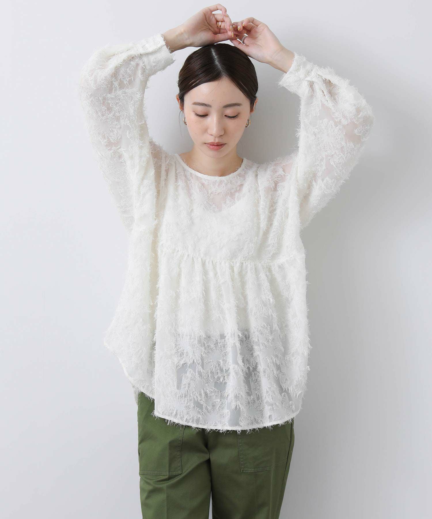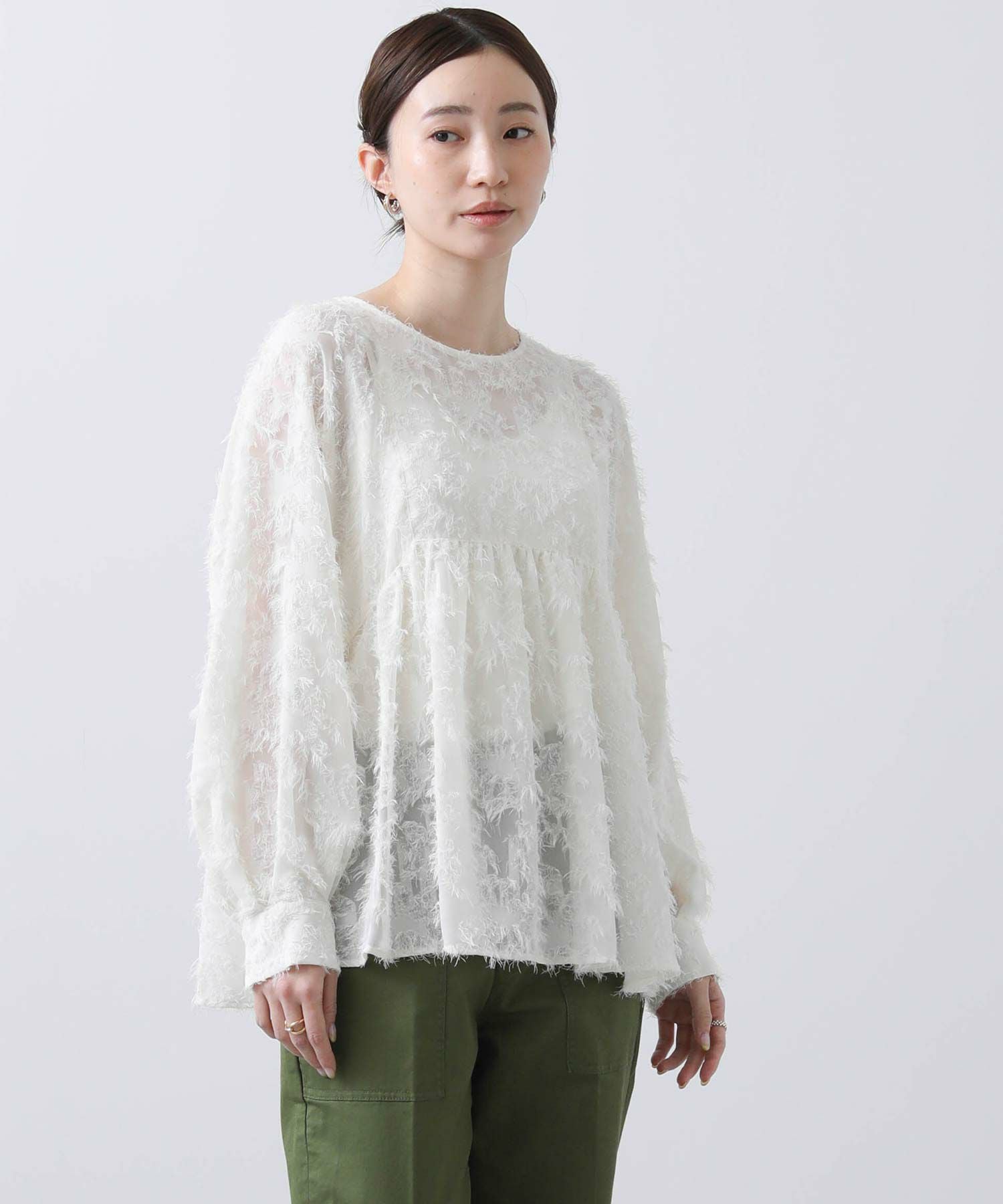 ジャガード素材が華やかなブラウス。