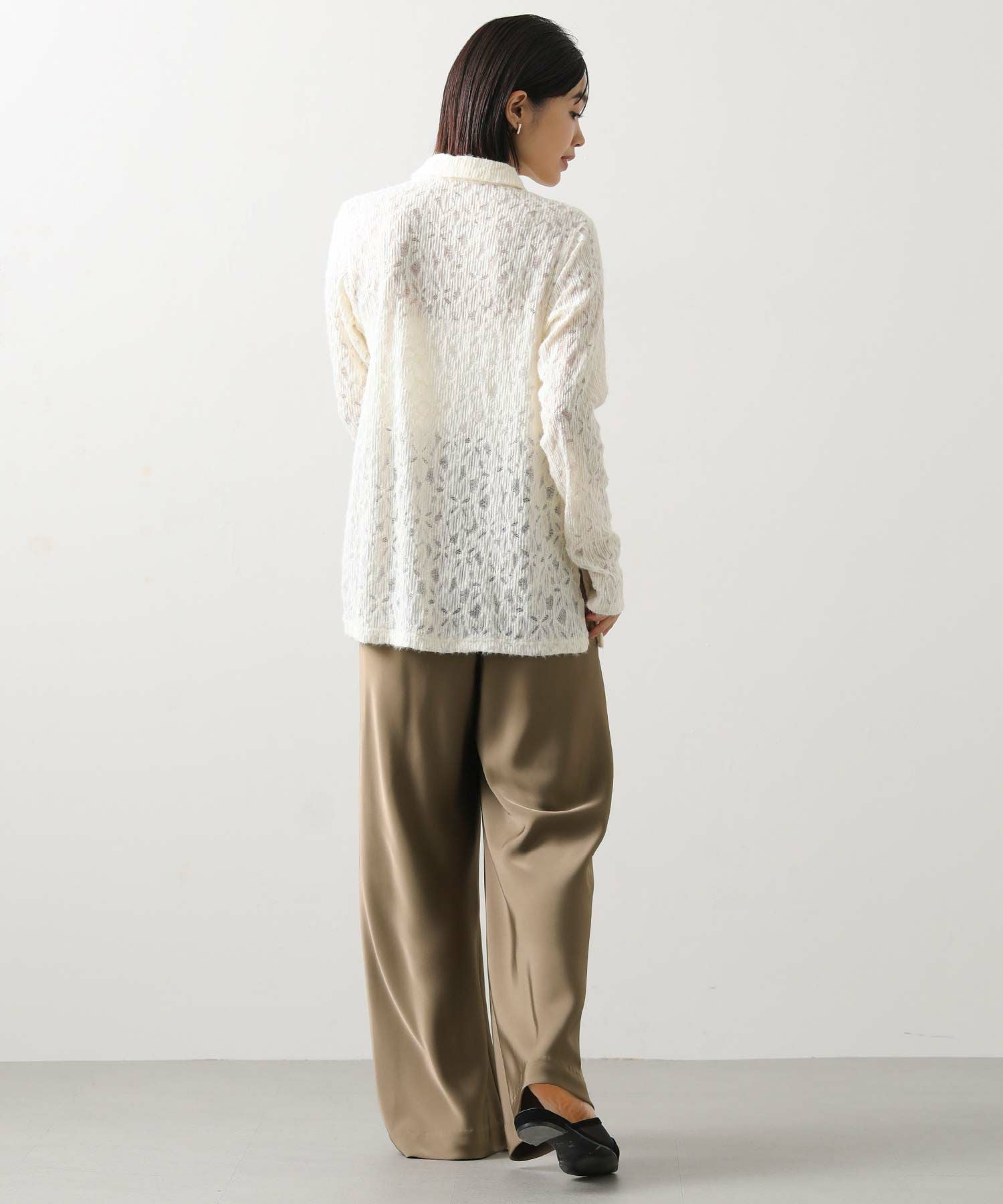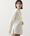 起毛したストレッチレース素材が柔らかく女性らしい印象を与え、インナーやボトム次第でさまざまなカジュアルスタイルに合わせやすいアイテム。