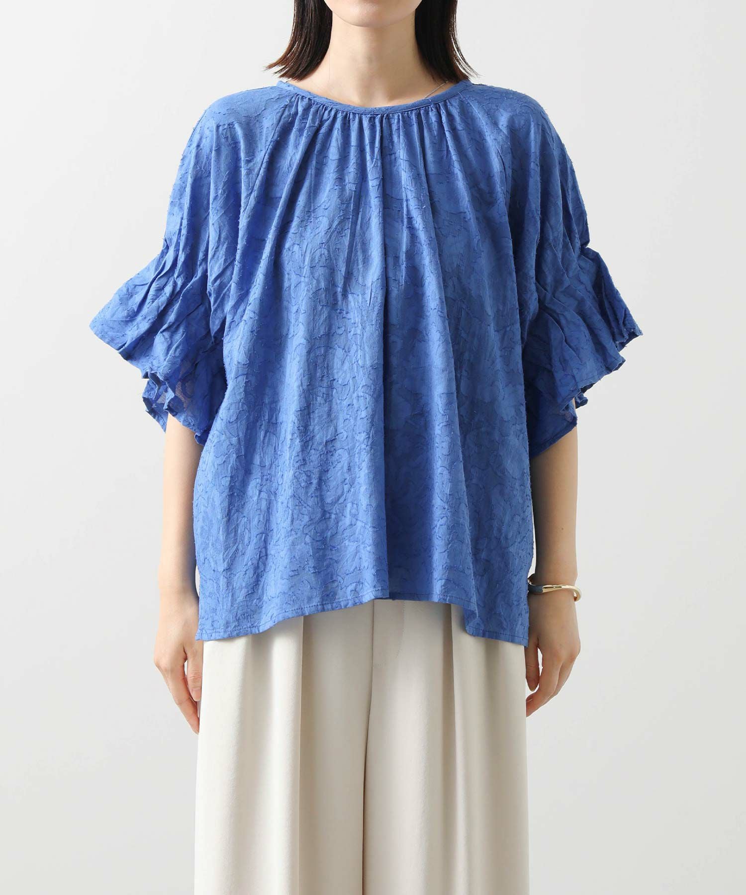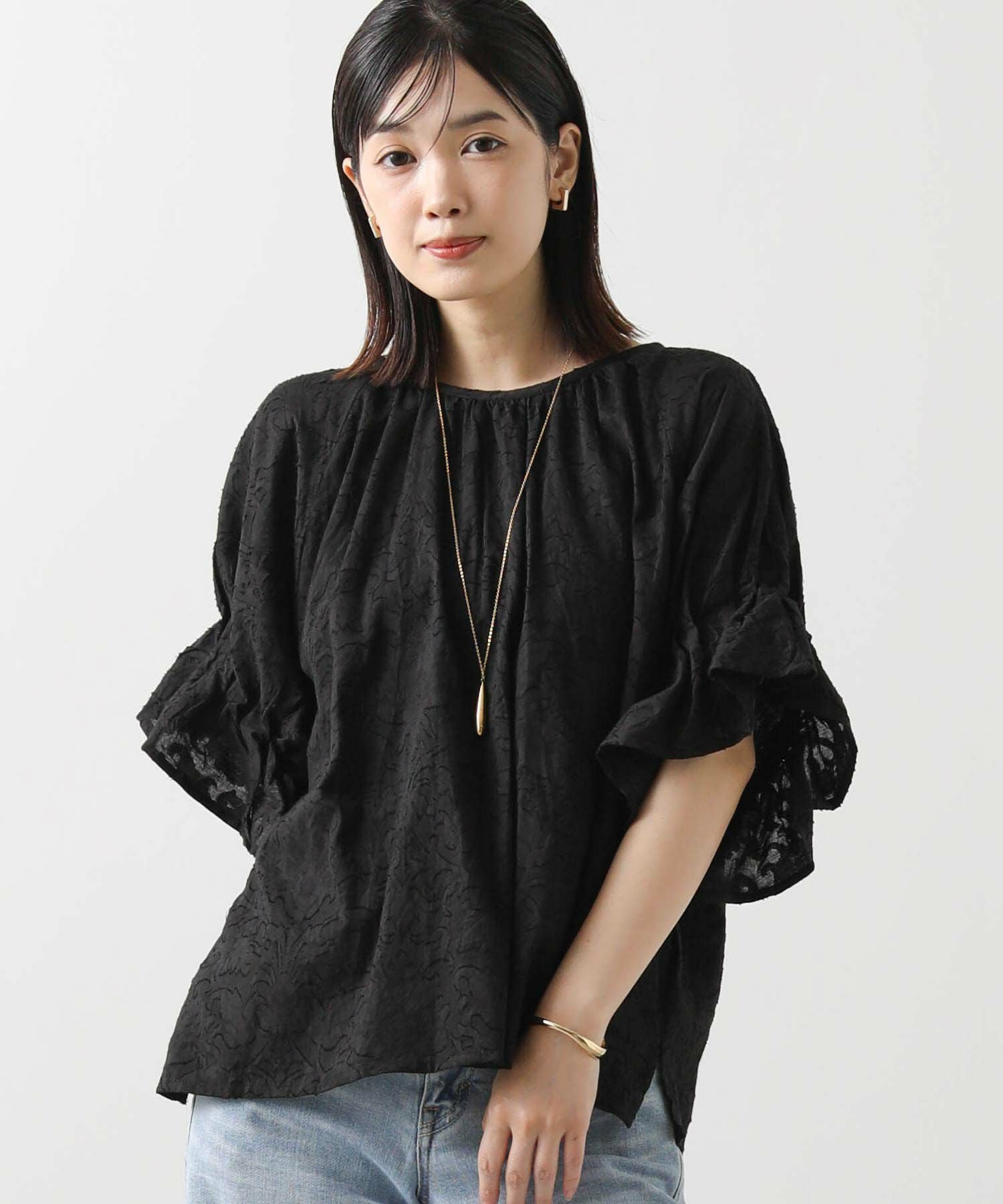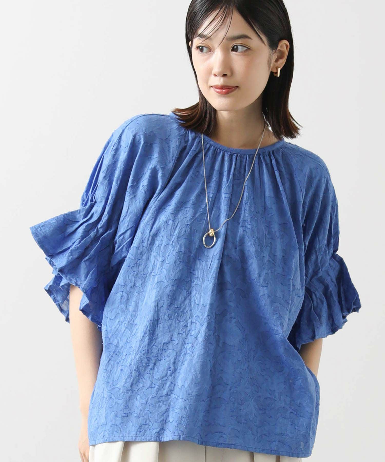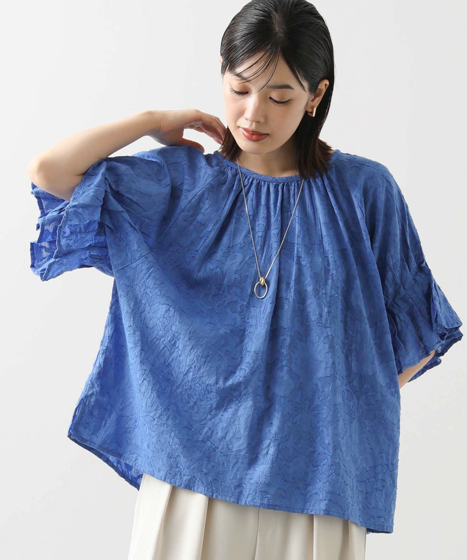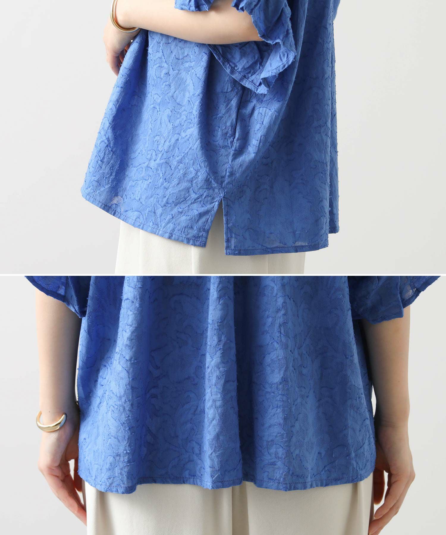 ソフトな風合いの綿素材で、肌触りが良さが魅力の華やかな花柄ジャガード素材のブラウス。